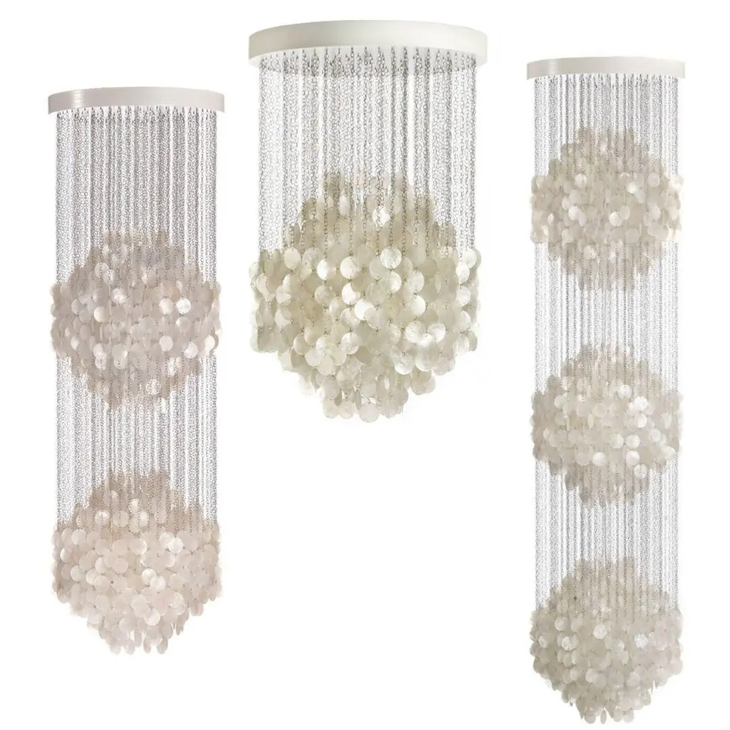 Verner Panton 'Fun 4DM' chandelier lamp in sea shells and wood for VerpanVerner Panton was one of Denmark's most legendary modern furniture and interior designers. His innovative experimentation with new materials, bold shapes and vibrant colors shines through in his most iconic pieces, faithfully and sustainably re-editioned by Verpan since 2003. First designed in 1964, the 'Fun 4DM' has long been considered Panton's greatest masterpiece in lighting design. Featuring an array of circular sea shells connected with stainless steel rings and artfully suspended from a central canopy, the 'Fun 4DM' highlights the unmistakable brilliance of Panton. Created to be equally appealing alone or displayed in clusters, and whether illuminated in a brilliant warm glow or powered off with the shells' organic properties on display. The 'Fun 4DM' is executed in sea shells, stainless steel rings and a white wood canopy to the exacting standards of Verpan using the finest materials available.Price per item. Available to order in unlimited quantities. Available with 1, 2 or 3 clusters as well as in table, sconce, floor and pendant variations - please see our separate listings. This listing is for the 'Fun 4DM' chandelier lamp in sea shells, stainless steel and wood.In stock lead time 2-4 weeks. Out of stock can add an additional 8 weeks or more. Please note that lead times, cost and inventory availability are subject to change without notice. Please contact us for current lead times prior to placing time-sensitive orders.Accommodates single standard medium base E26 bulb (bulb not included). Max 60 watts, lower with incandescent. Suspended from wood canopy painted white with a transparent cord. This lamp is UL listed.Made to order. All sales are final.