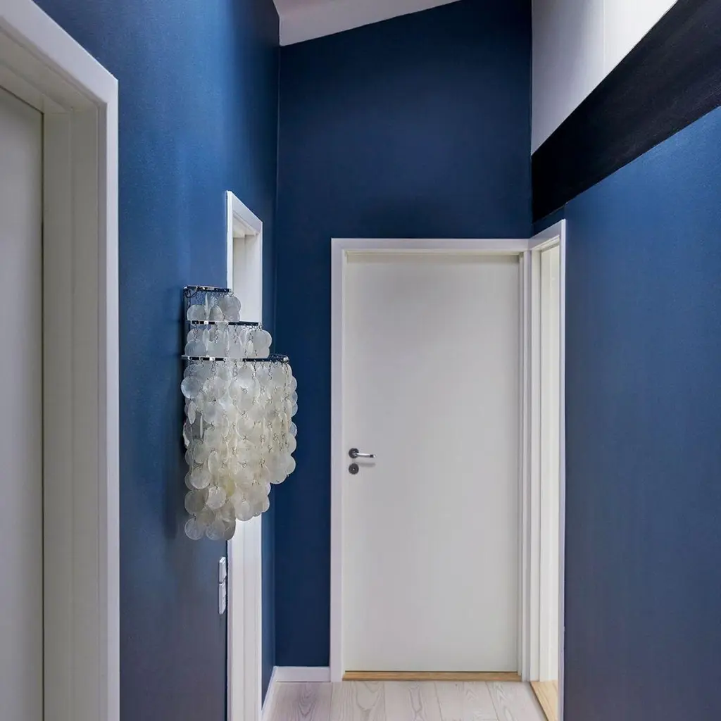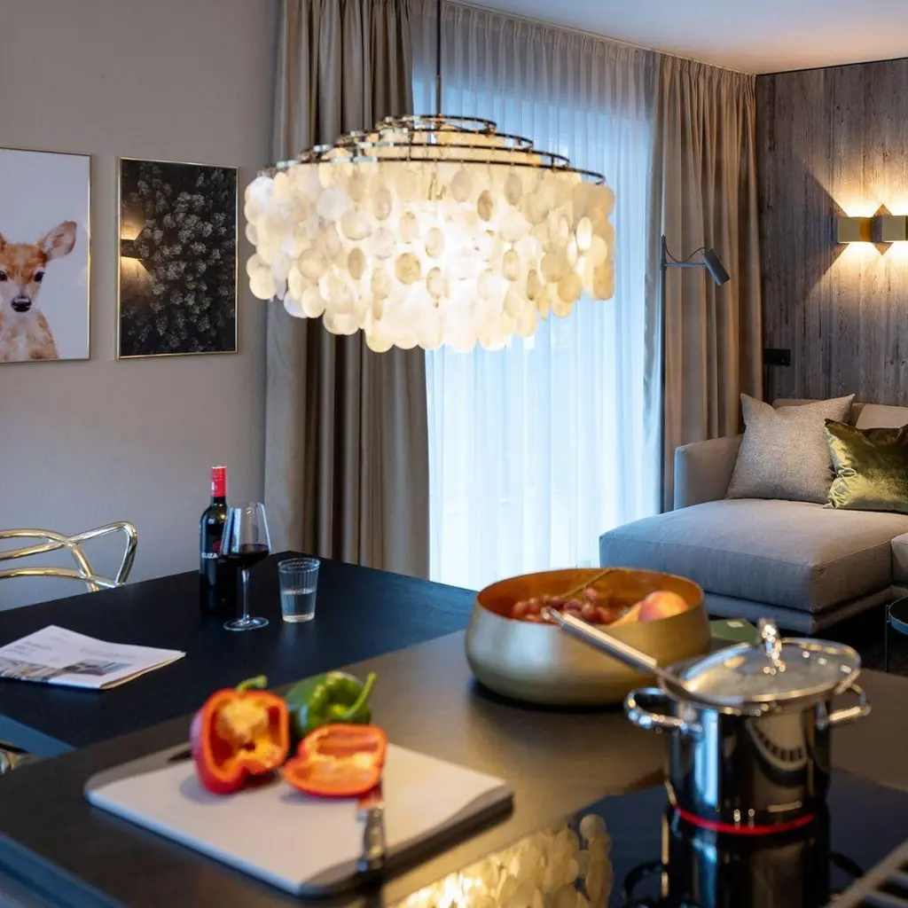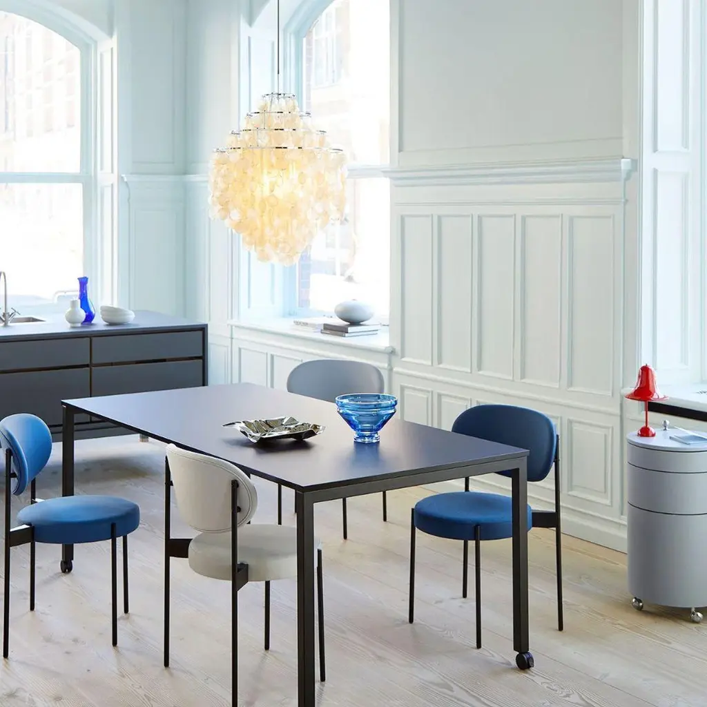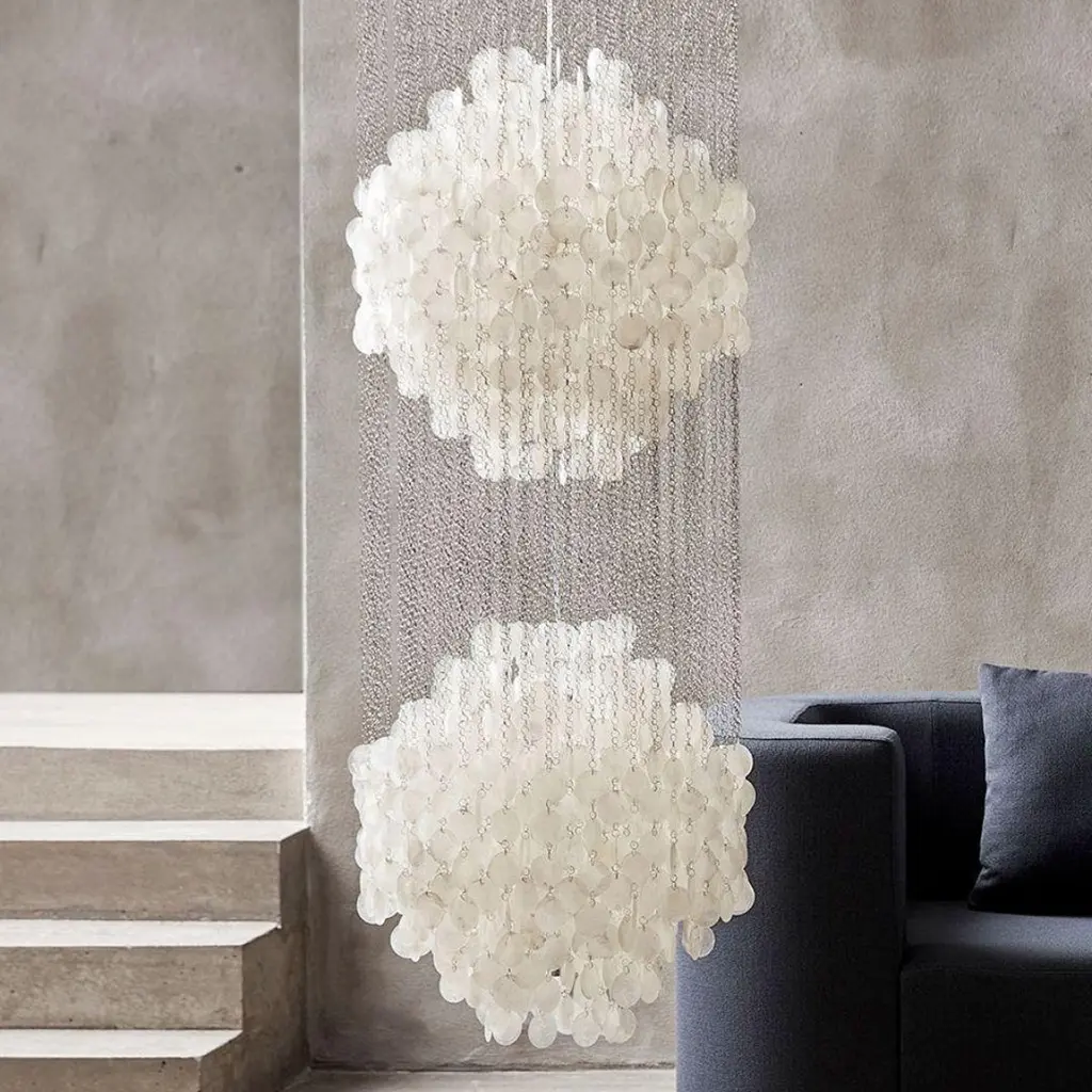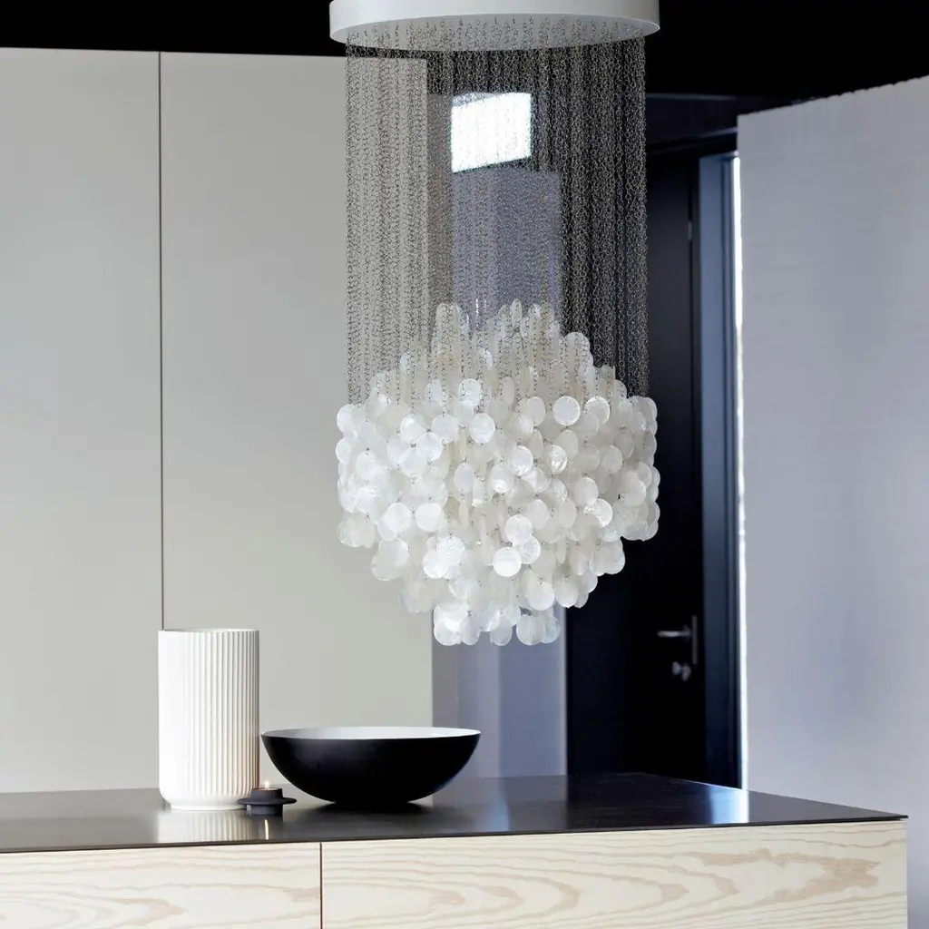 Verner Panton 'Fun 5DM' chandelier lamp in sea shells and wood for Verpan.Verner Panton was one of Denmark's most legendary modern furniture and interior designers. His innovative experimentation with new materials, bold shapes and vibrant colors shines through in his most iconic pieces, faithfully and sustainably re-editioned by Verpan since 2003. First designed in 1964, the 'Fun 5DM' has long been considered Panton's greatest masterpiece in lighting design. Featuring an array of circular sea shells connected with stainless steel rings and artfully suspended from a central canopy, the 'Fun 5DM' highlights the unmistakable brilliance of Panton. Created to be equally appealing alone or displayed in clusters, and whether illuminated in a brilliant warm glow or powered off with the shells' organic properties on display. The 'Fun 5DM' is executed in sea shells, stainless steel rings and a white wood canopy to the exacting standards of Verpan using the finest materials available.Price per item. Available to order in unlimited quantities. Available with 1, 2 or 3 clusters as well as in table, sconce, floor and pendant variations - please see our separate listings. This listing is for the 'Fun 5DM' chandelier lamp in sea shells, stainless steel and wood.In stock lead time 2-4 weeks. Out of stock can add an additional 8 weeks or more. Please note that lead times, cost and inventory availability are subject to change without notice. Please contact us for current lead times prior to placing time-sensitive orders.Accommodates two standard medium base E26 bulb (bulb not included). Max 60 watts, lower with incandescent. Suspended from wood canopy painted white with a transparent cord. This lamp is UL listed.Made to order. All sales are final.