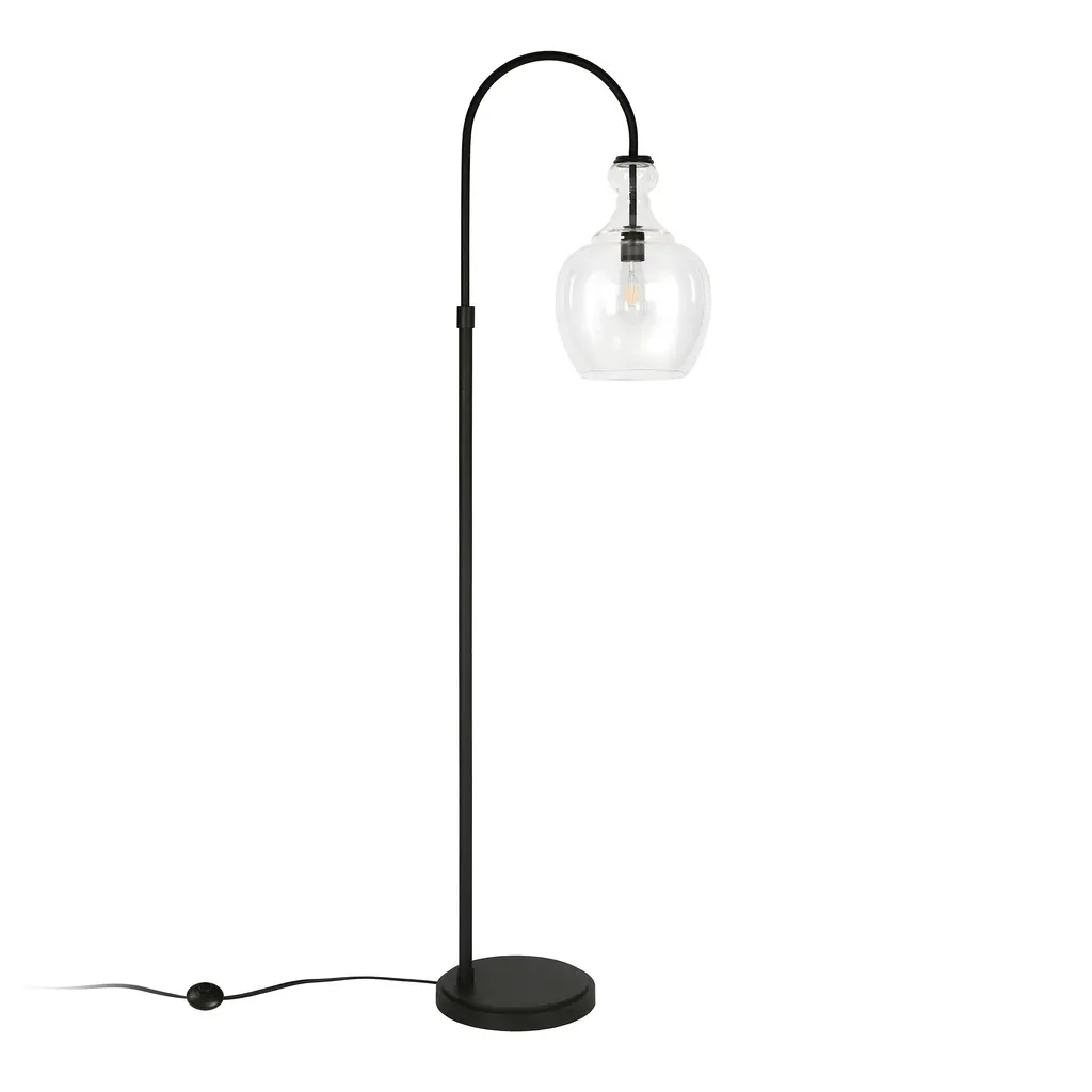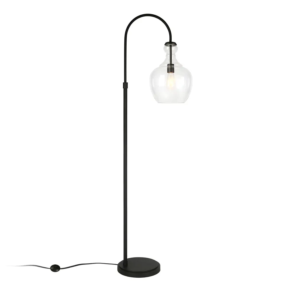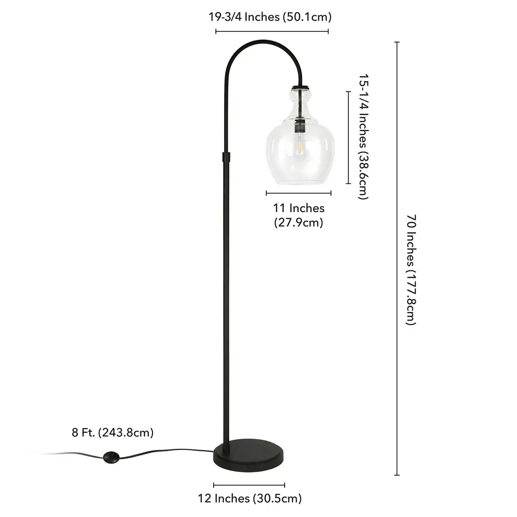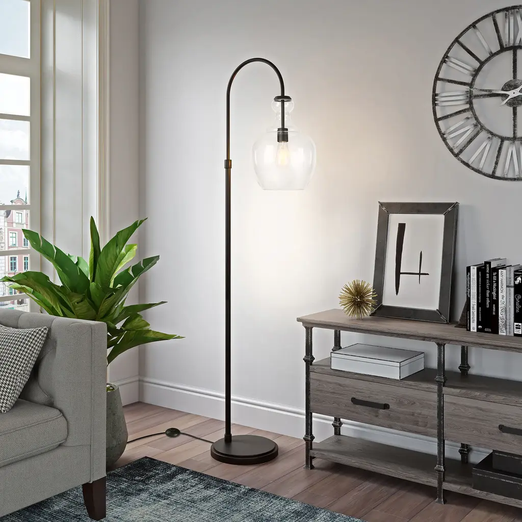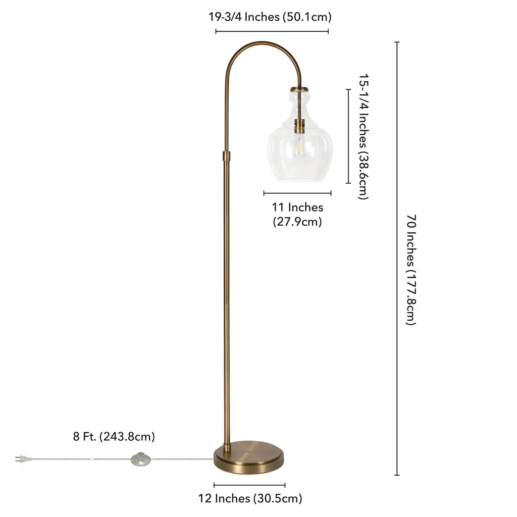 Illuminate your space with this stylish Verona Arc Floor Lamp. Handmade glass shade emits a warm glow to create a modern farmhouse appeal in any room. The steel frame and base add an industrial-inspired touch, making it a versatile lamp for your living room, bedroom, office, or dining room. Choose between the rich brushed brass or deep blackened bronze finish for a sophisticated look that complements any decor.Features:Compatibility: