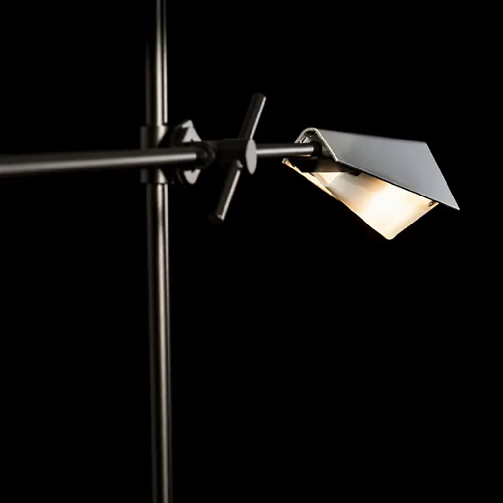 An elegant, minimalist floor lamp designed inspired by origami. With its angled metal and glass shade, the Vertex Floor Lamp by Hubbardton Forge evokes an origami crane, an effect that’s only enhanced by the up and down movement made possible by the swivel joining the slender arm and base. A dimmer rod adds even more convenient adjustability; it extends up from the base for easy control of the light’s brightness in a reading nook or office.