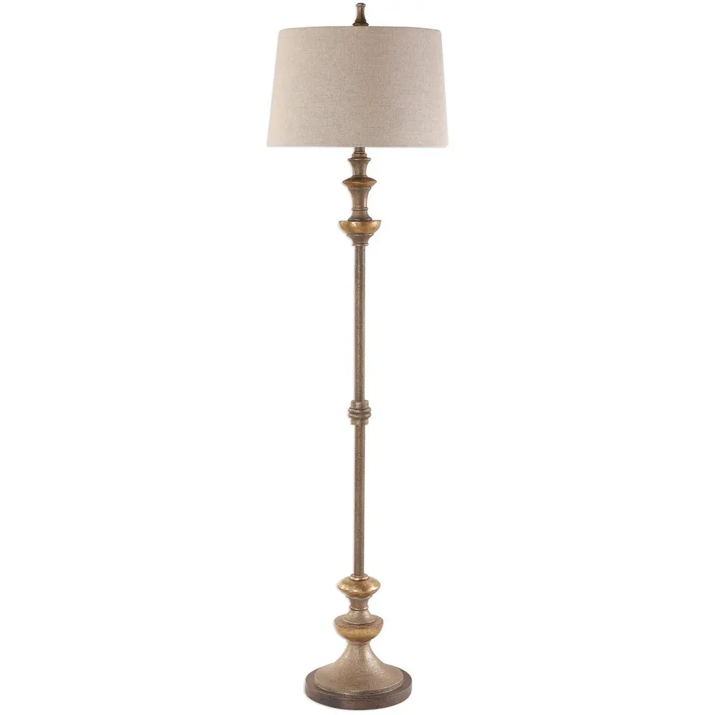 This Floor Lamp Features Heavily Burnished Textured Silver Details, Paired With Antiqued Silver Champagne Accents And A Crackled Dark Bronze Foot. The Tapered Round Hardback Shade Is An Ivory Linen Fabric.