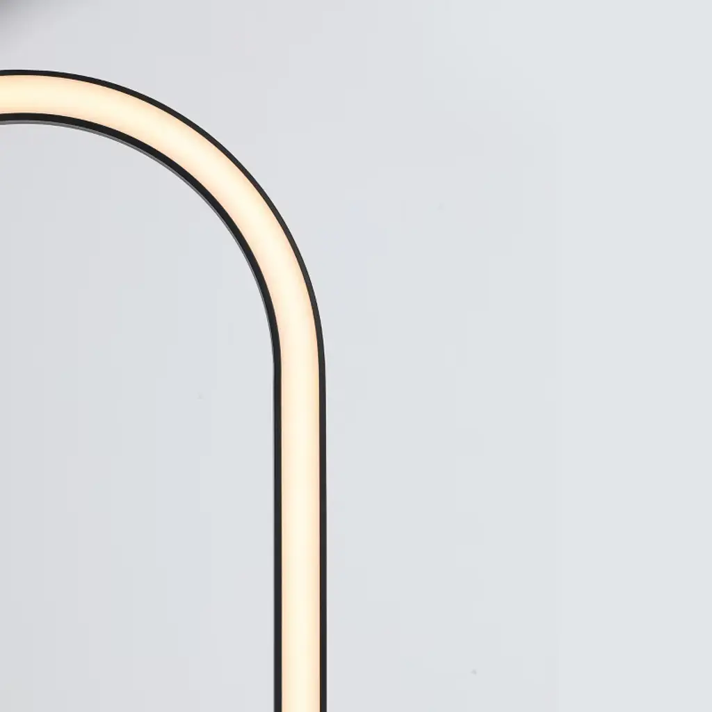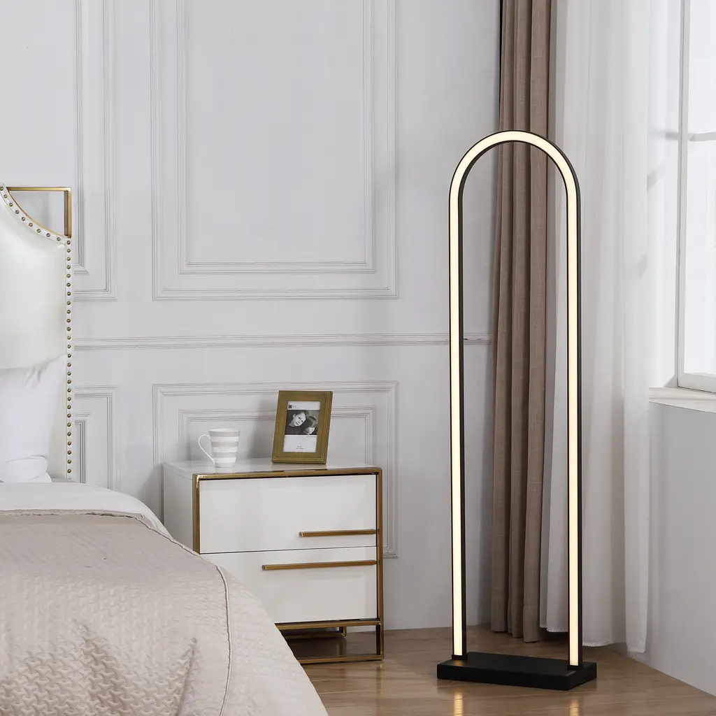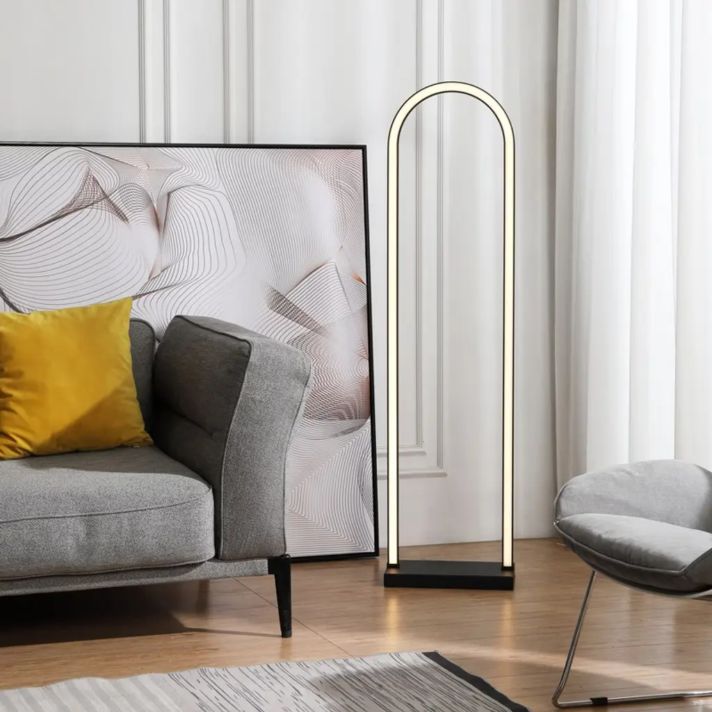 This Vidalite Keshet LED integrated indoor arched floor lamp is the perfect option to illuminate your living room, bedroom, kitchen, dining room or home office. This sleek and modern black floor lamp features an arc design that is sure to impress. It is dimmable, allowing you to set the mood to focus on work or to relax with a movie or reading a book by tapping the foot switch. The LED light is 28W and 3000K making this light bright enough to illuminate a large living space. In addition, LED lights are maintenance free with up to 50,000 hours of runtime and 80% more energy efficient than a traditional light bulb. It stands tall at 54", but keeps a small footprint at 13.8" wide and 13" deep. Your Keshet arc floor lamp includes a 1 year limited warranty.