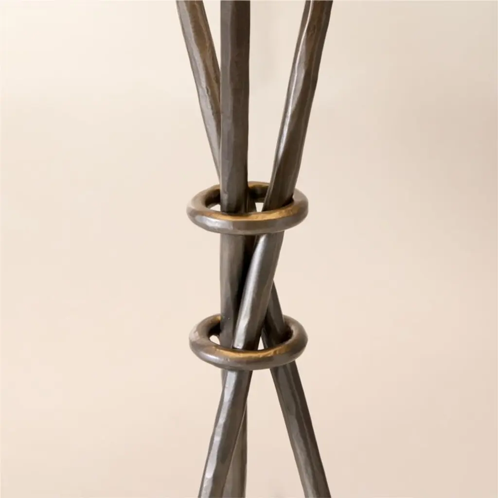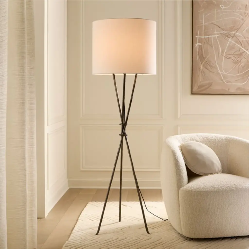 Tripod floor lamp by NYC-based designer David Aguirre makes a sophisticated statement. The natural linen drum shade complements a hand-forged, hammered metal base with an oxidized nickel finish that gives each lamp a unique industrial feel. CB2 exclusive.