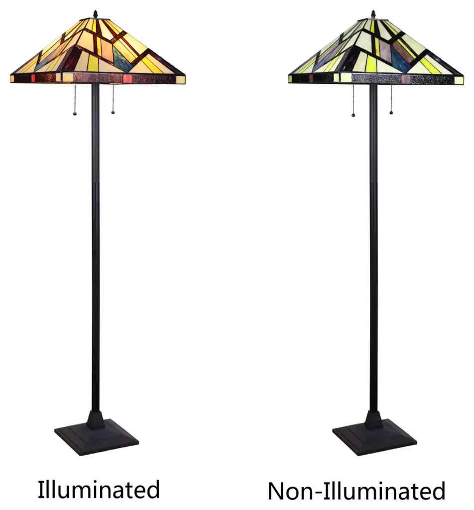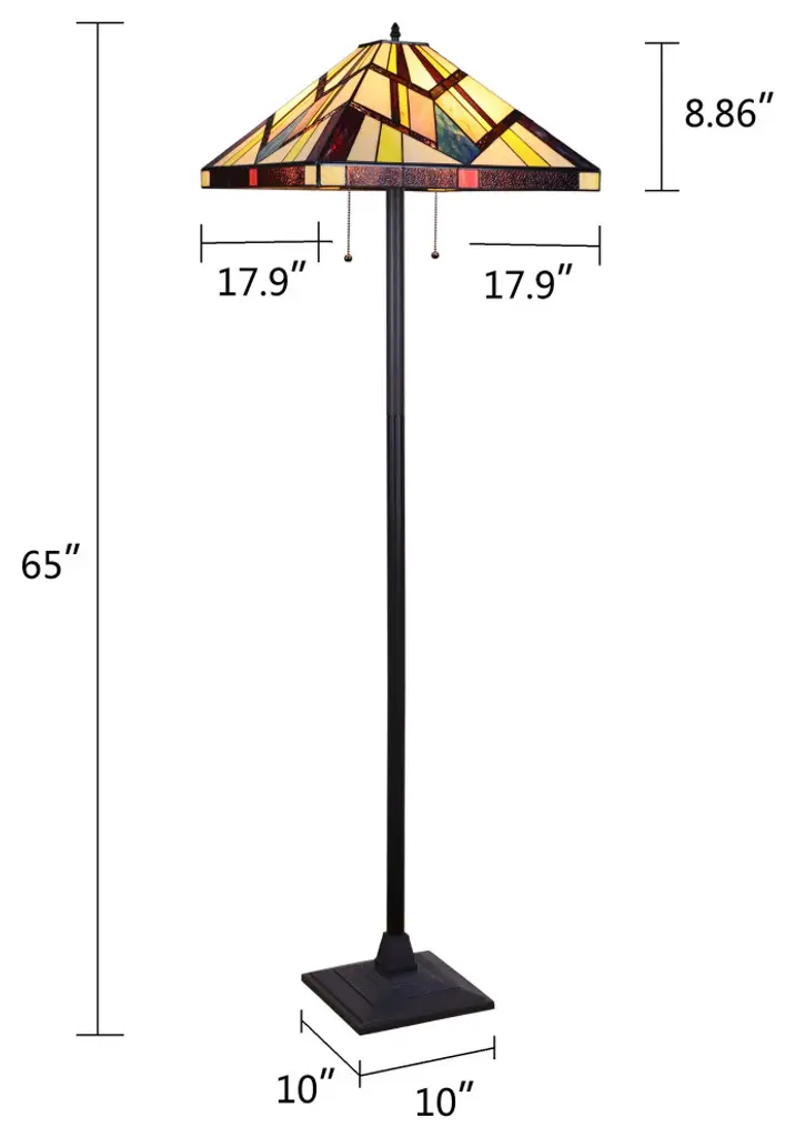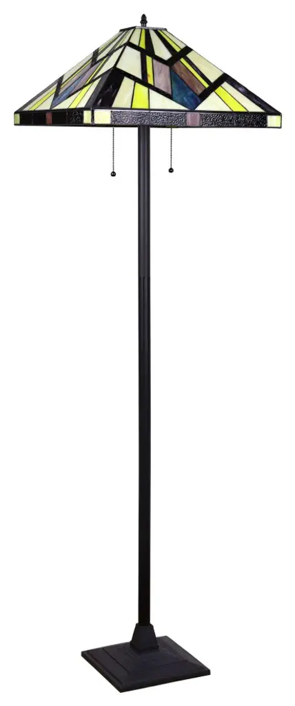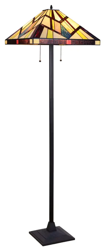 Vincent is a beautiful, stained glass floor lamp in a traditional Mission style, featuring a blackish bronze base and 2 pull chains switches. This lamp would be perfect in a bedroom, living room, and dining room. The shade is hand-crafted, using the same methods developed by Louis Comfort Tiffany in the early 1900''s. This process entails using 148 hand cut stained art glass pieces, each wrapped in fine copper foil and soldered together at extremely high temperatures to form each unique piece. Exact size to the nearest inch may vary, and exact color of each glass piece may vary due to each piece being hand crafted. First image is with the light shining through, second image is with no light. Dry listed and recommended for an indoor setting.