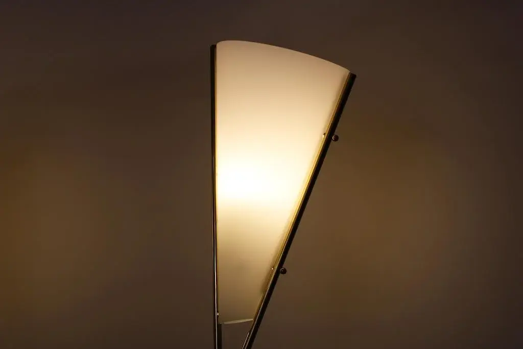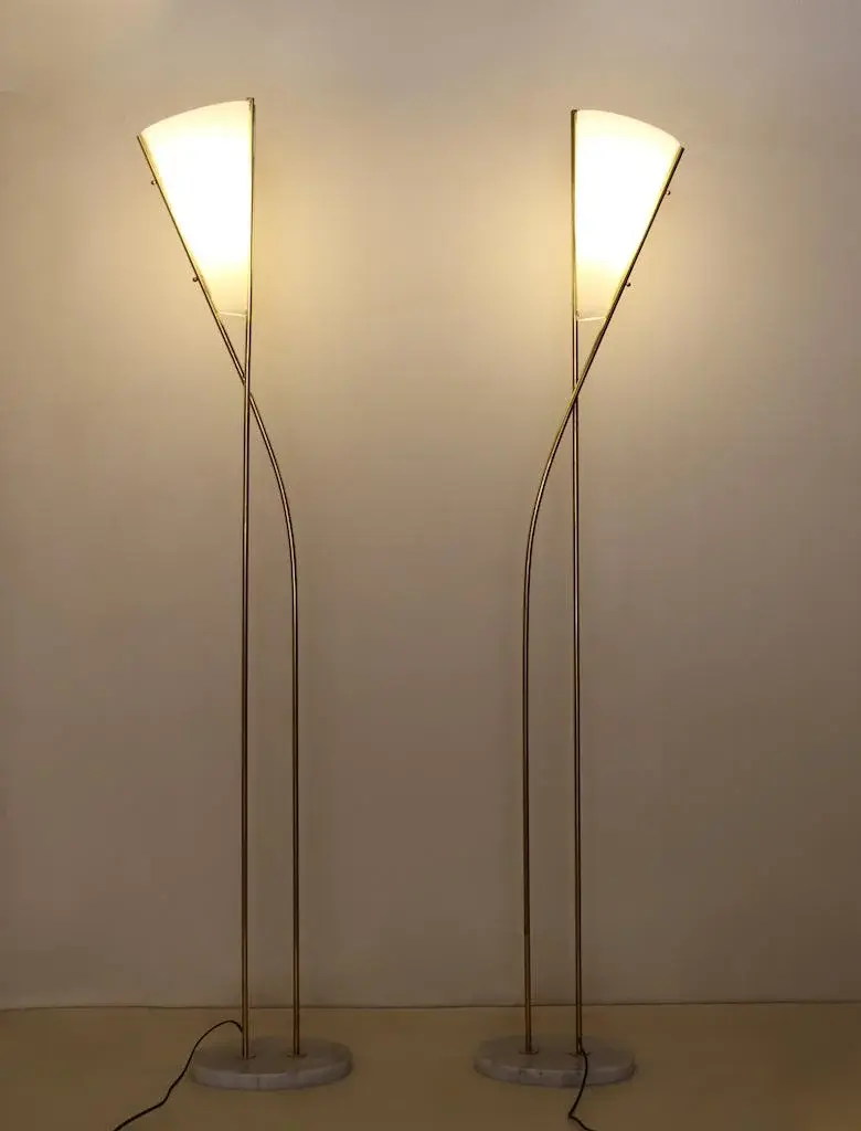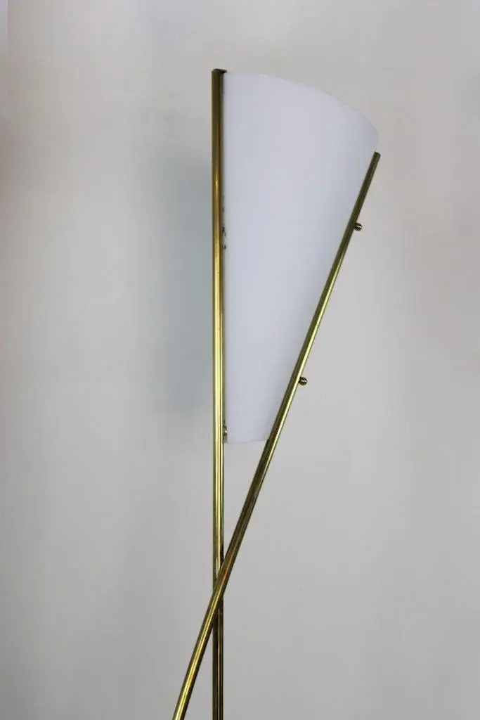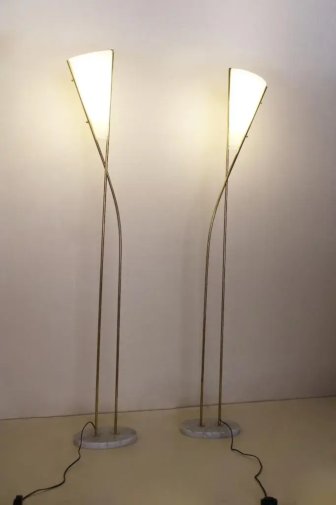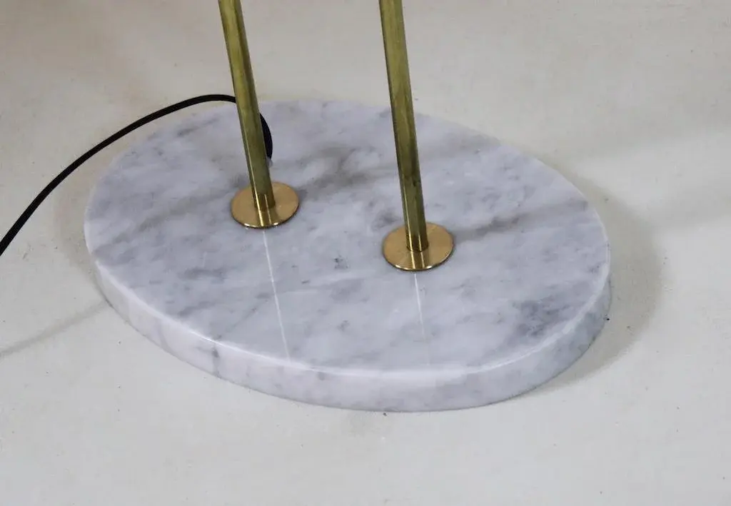 Elegant vintage floor lamps, with white marble base, double braided brass stem and white opal cone. Origin: Italy Period: 70s Dimensions: H 188 x base diameter 31.5 cm x cone diameter 21 cm European Plug (up to 250V).The wiring of this item may be original and might need replacement, if not specified otherwise.