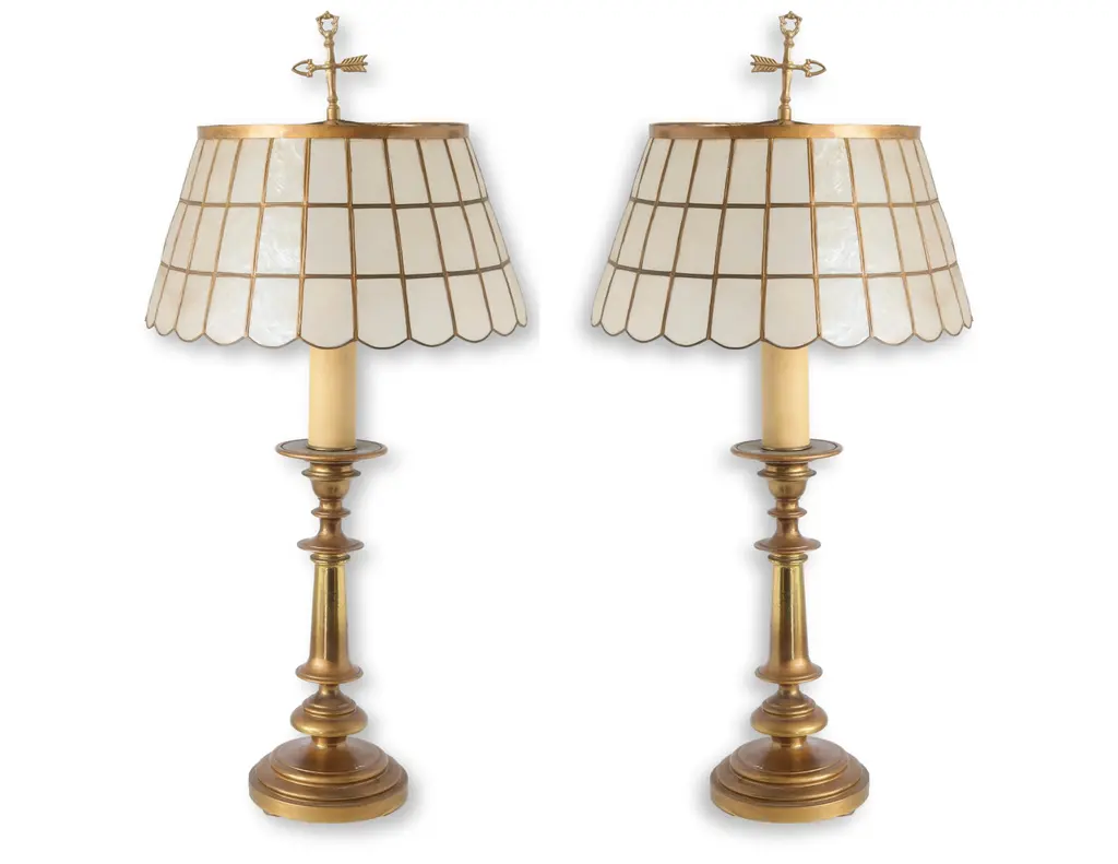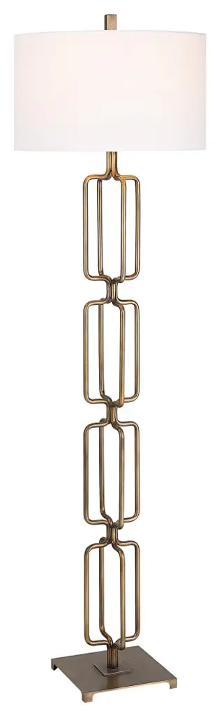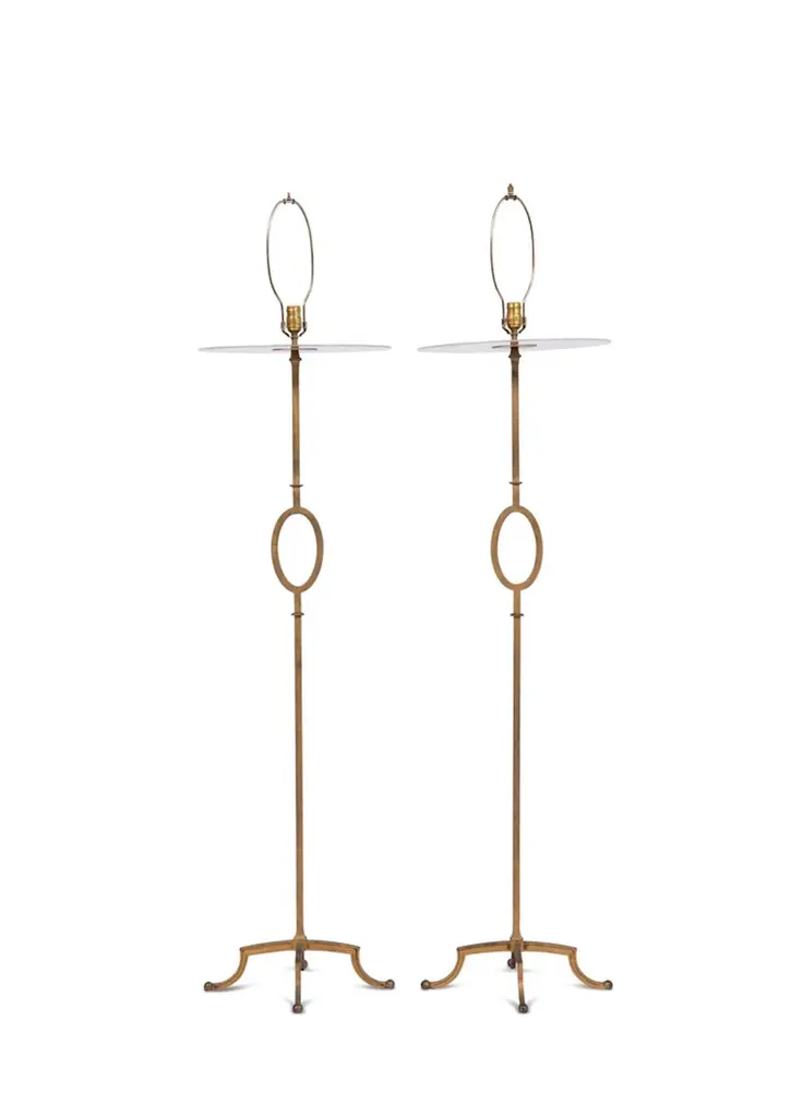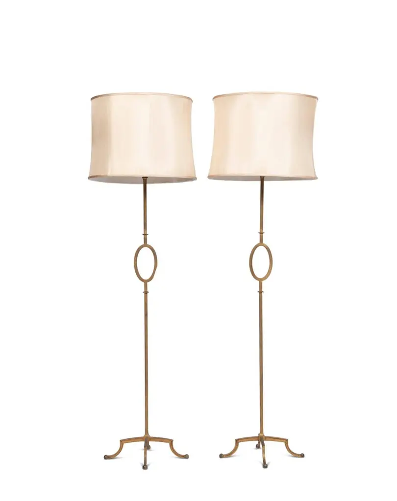 Vintage Iron Floor Lamp Attributed to Poillerat by Mattaliano with Gilt Finish.20th centurywith custom cream silk shades.Height overall.Property from a David Collins-Designed New York Residence. Priced Per Lamp, Pair Available.Would look great in den room or a sitting room or office.