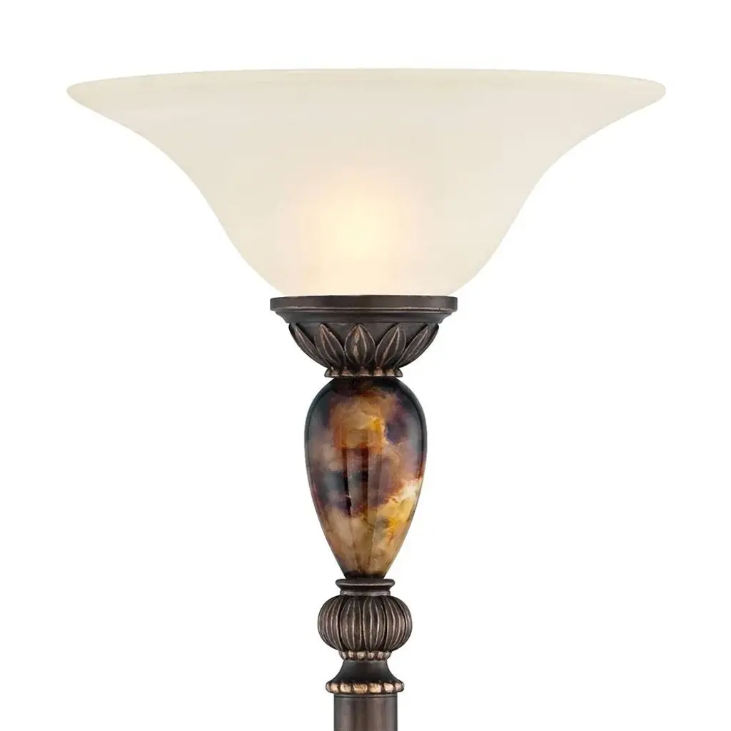 PRODUCT DETAILS: 72" high overall. Glass is 18" wide. Base is 11" square. Weighs 25 lbs. Uses one maximum 150 watt standard-medium base bulb (not included). Foot dimmer switch on the cord. Traditional floor lamp design from the Kathy Ireland Home Collection. Bronze finish base and column. Cast resin construction. Tortoise-shell glass font accent on the column just below the glass. Frosted white glass up top. 8-foot long cord. DESCRIPTION: Ideal for general room illumination, this Kathy Ireland design is the perfect marriage of form and function. It features traditional styling with a frosted glass shade and tortoise shell glass font.