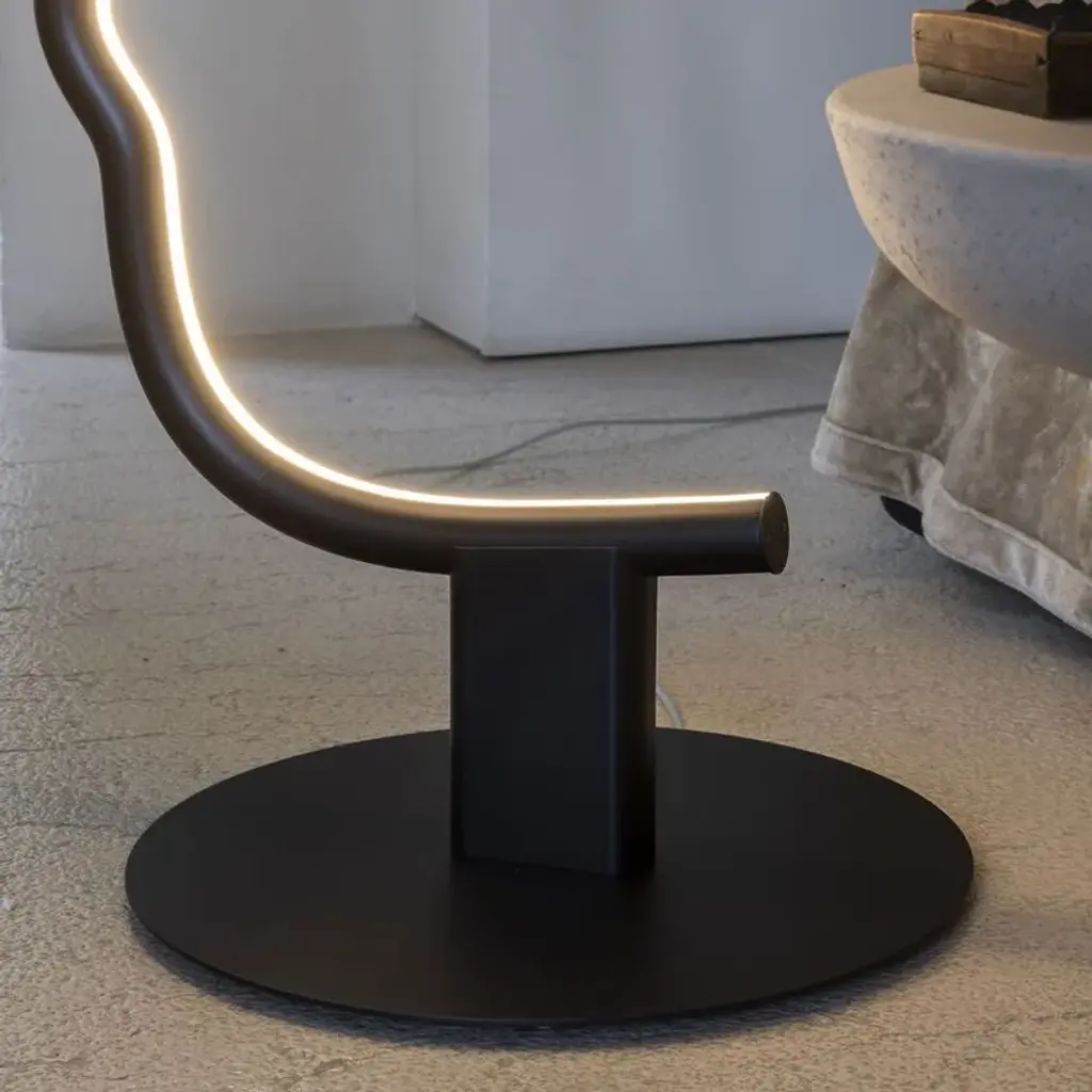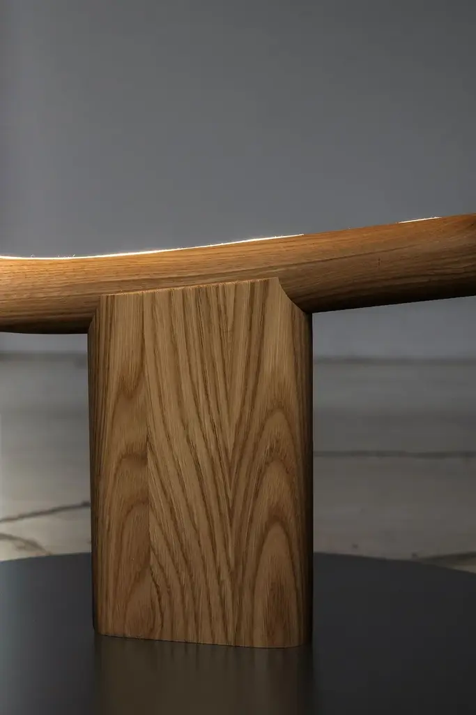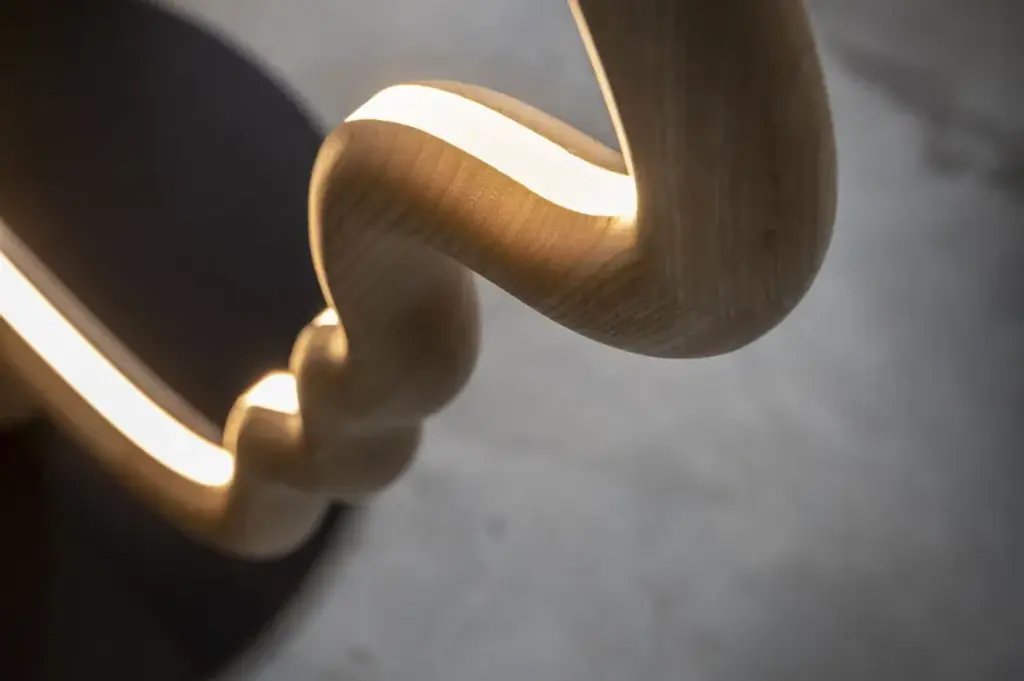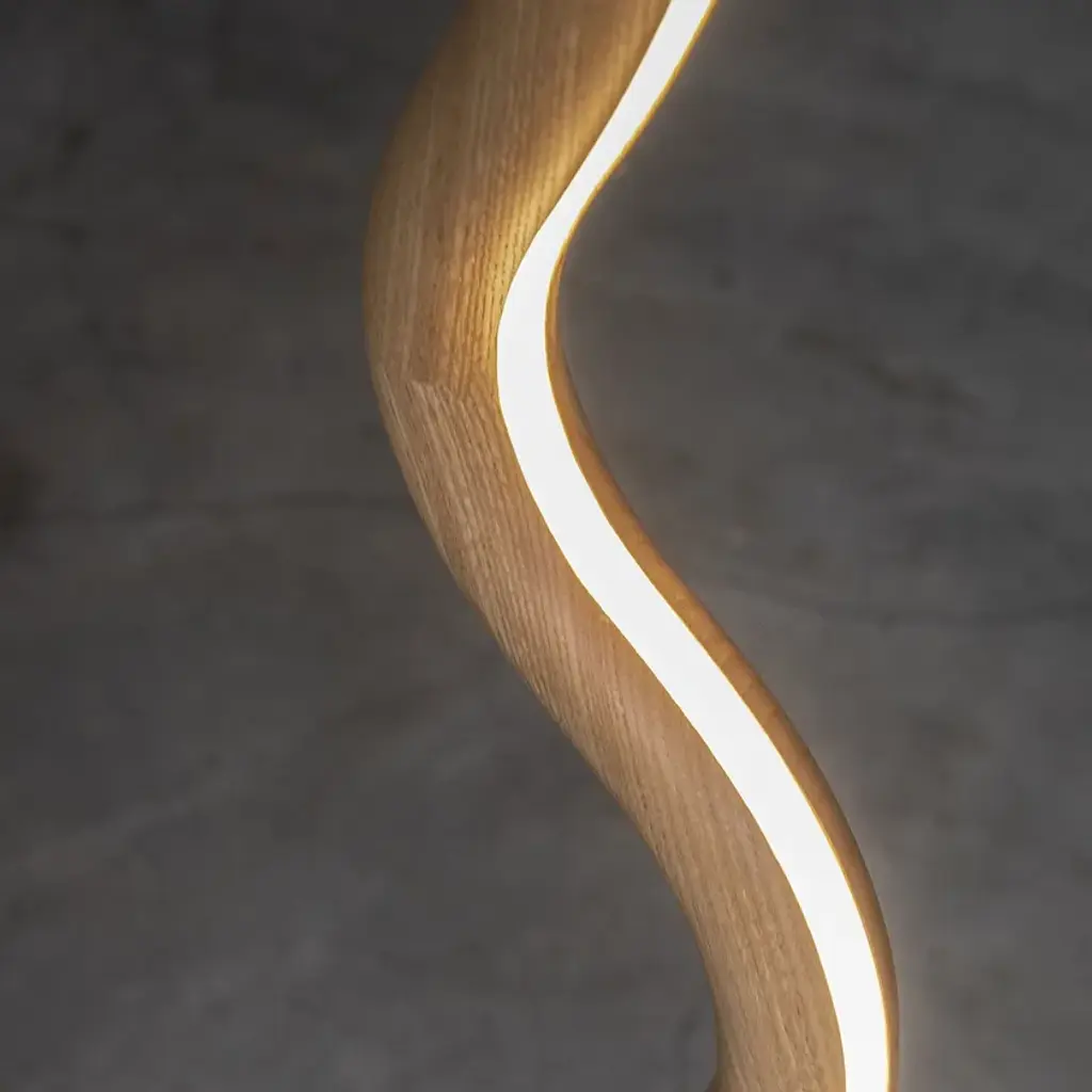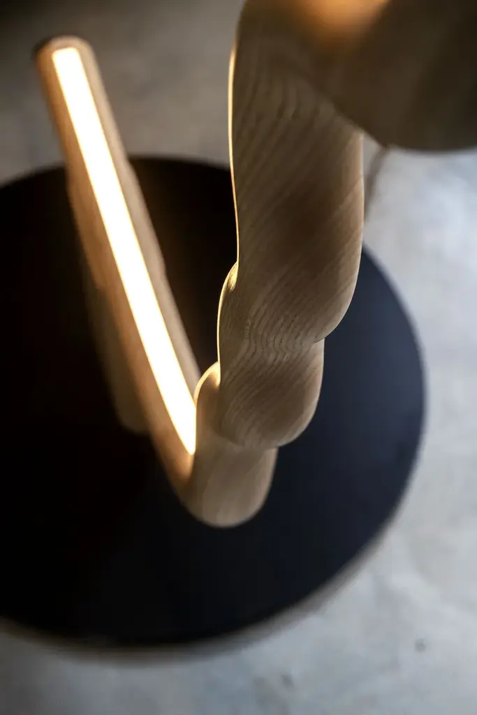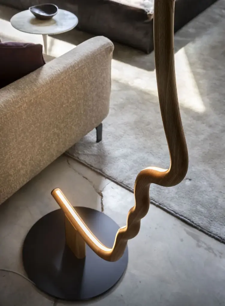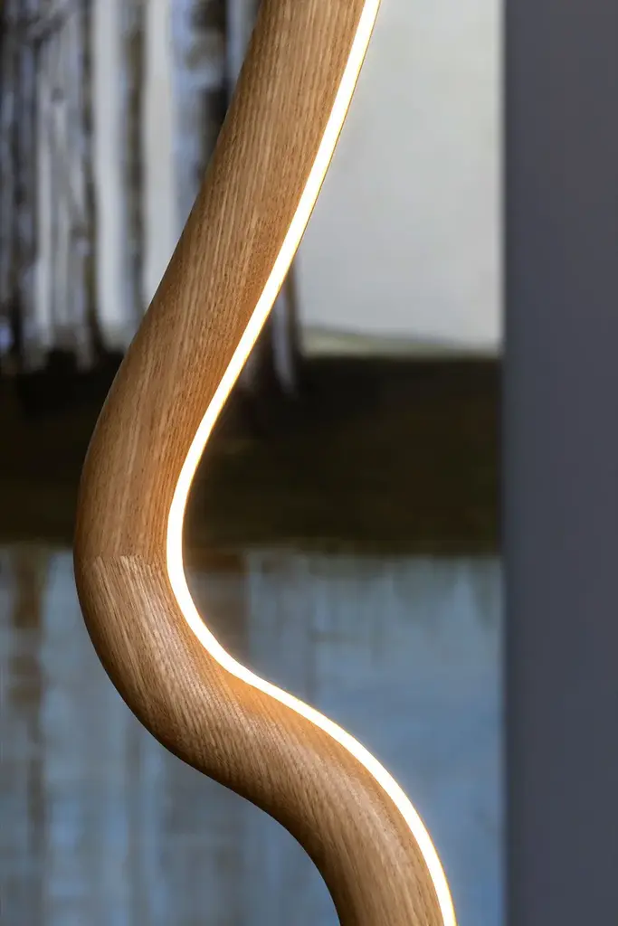 Vis a Vis is a dimmable LED floor lamp with a sculpted solid wood frame and a black metal base.