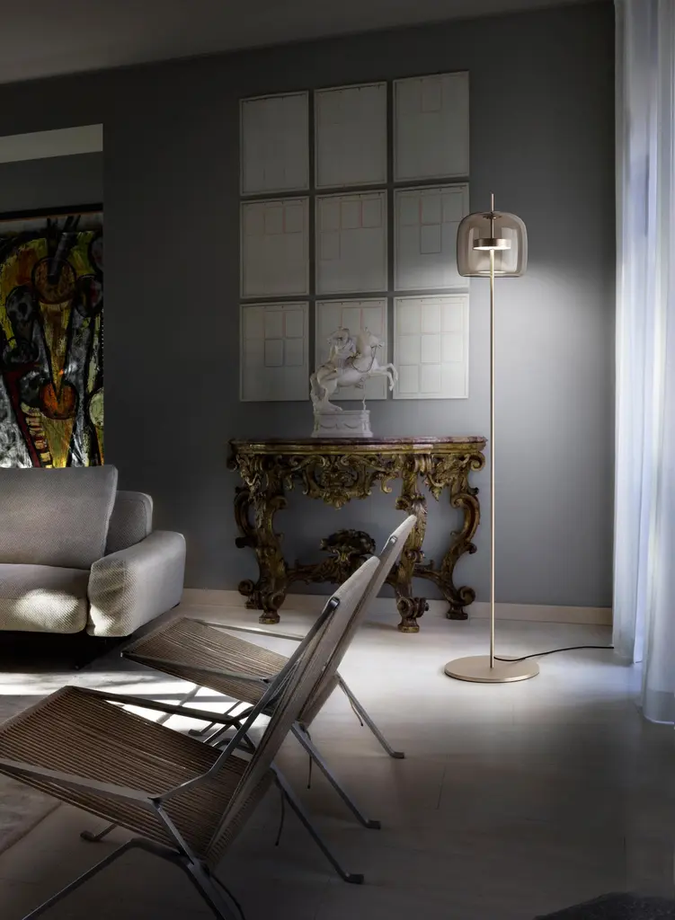 The elegant and delicate look of the blown glass finds a new dimension in Jube. Two glass units placed side by side, so perfectly assembled, that they look like a unique piece. A sinuous lamp, with tone-on-tone colours that give it a precious, vintage mood.Specifications:Material: GlassLight source: LED L2415 ULNo of bulbs: 1x13W L2415 UL (37V)Dimmer: DIM 4Lumen: 2000 lmKelvin: 2700 KYear: 2017Glass finish: Crystal TransparentFrame finish: Matt gold 2Dimensions: Ø 35 x 174 H cmAvailable in other glass finish options: Light Amethyst Transparent, Smoky Transparent, Burned Earth Transparent, Old Green TransparentAvailable in other frame finish option: Matt steelAvailable in other light source option: LED L3415 UL - $ 1936Available in other kelvin option: 3000 KPlease inquire about customization options.
