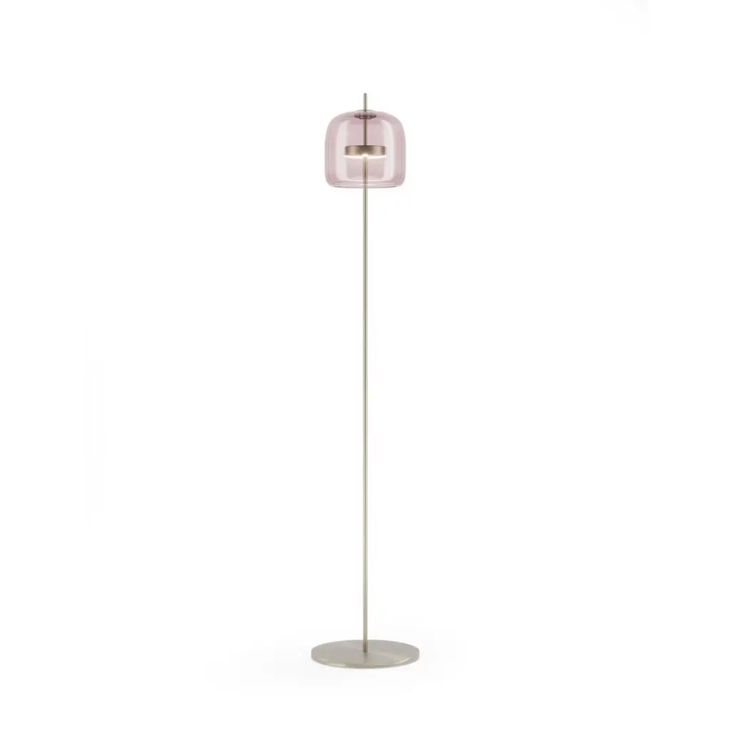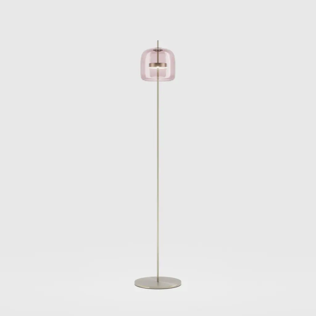 The elegant and delicate look of the blown glass finds a new dimension in Jube. Two glass units placed side by side, so perfectly assembled, that they look like a unique piece. A sinuous lamp, with tone-on-tone colours that give it a precious, vintage mood.Specifications:Material: GlassLight source: LED L2415 ULNo of bulbs: 1x13W L2415 UL (37V)Dimmer: DIM 4Lumen: 2000 lmKelvin: 2700 KYear: 2017Glass finish: Light Amethyst TransparentFrame finish: Matt steelDimensions: Ø 35 x 174 H cmAvailable in other glass finish options: Crystal Transparent, Smoky Transparent, Burned Earth Transparent, Old Green TransparentAvailable in other frame finish option: Matt gold 2Available in other light source option: LED L3415 UL - $ 1936Available in other kelvin option: 3000 KPlease inquire about customization options.