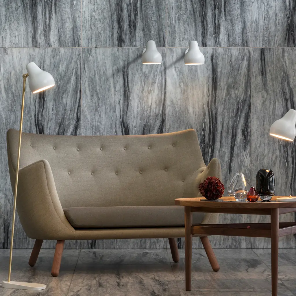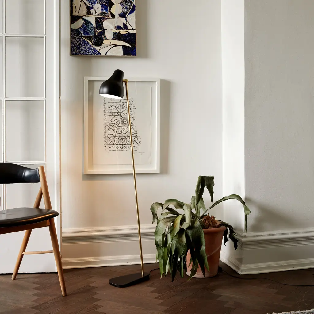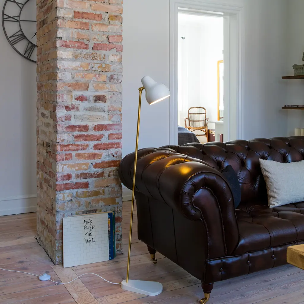 The VL38 Floor Lamp is a beautifully minimalist piece designed by Vilhelm Lauritzen for Copenhagen's Radiohuset building. Featuring a sleek combination of a white, angled shade and a brushed brass arm, this lamp provides focused, downward lighting, perfect for reading or ambient illumination. The head is adjustable, allowing you to direct light where needed, and the inside of the shade is painted white for soft, even light. Updated with modern LED technology, the VL38 combines vintage charm with energy efficiency.