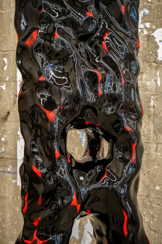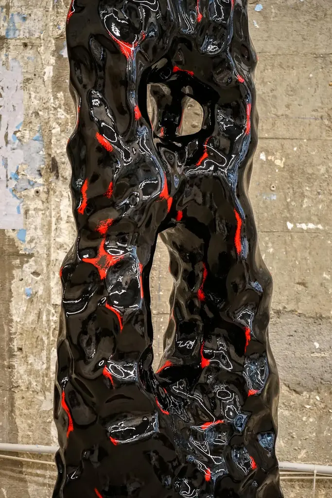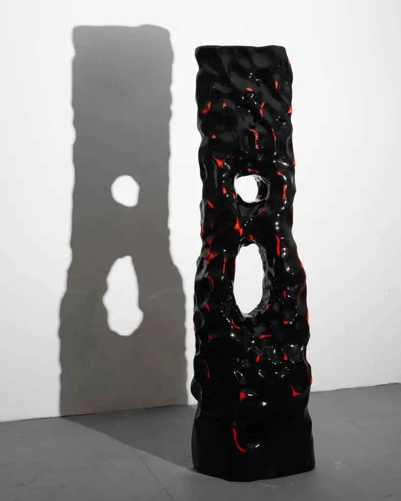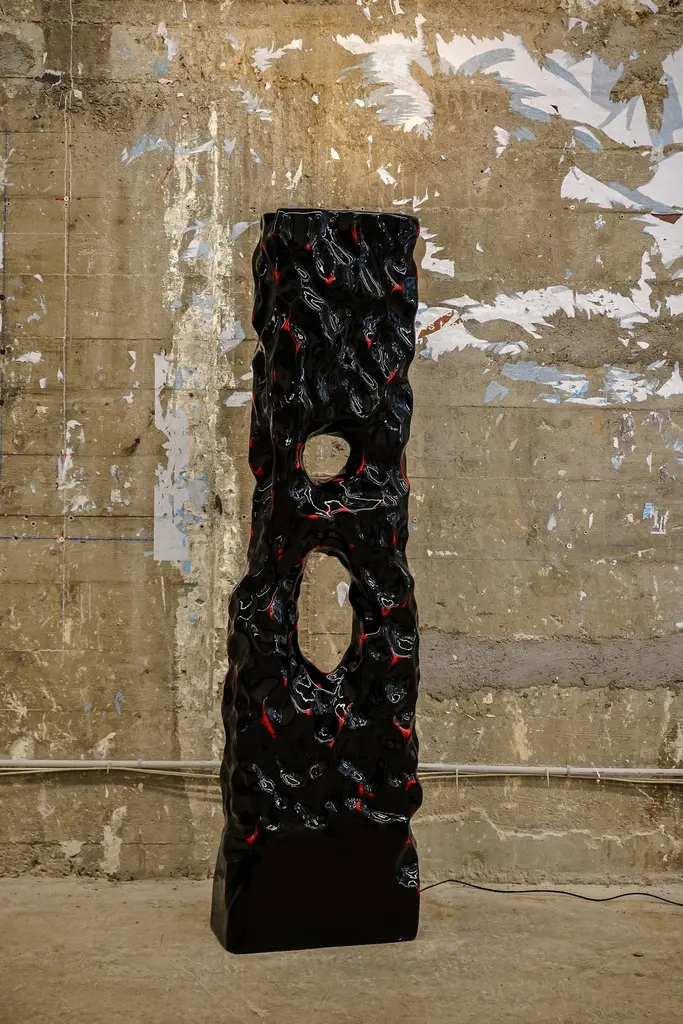 Volcan lamp by Alberto VitelioMaterial: fiberglass, resin, polyurethane paint.Dimensions: H 187 x W 50 x D 30 cm.Alberto Vitelio was born in Santiago de Chile in 1990, in a newly installed democracy after 17 years of military-civic dictatorship. The cultural blackout, persecution, and censorship of this period endowed the artistic scene with a profoundly dissident and anti-establishment voice. From 1990 onwards, art in Chile remained on the margins, while the territory became the laboratory for Milton Friedman's neoliberal politics. From a young age, Alberto showed a deep interest in nature's mysteries. Archaeological vestiges, fossils, and lava, all shapes, and colors, spread over the earth's surface. It is no coincidence that his work evokes a cave-like aesthetic, mysterious, silent, but at the same time magnetic and imposing. Unintentionally, Vitelio breaks with the sanitized and rigid notion of beauty and gives rise to an intimate experience, that confronts us with a magnetism that stirs our entrails. What seems viscous, shiny, rigid, and at the same time fluid, confronts us with what human nature seeks to silence: our own darkness.