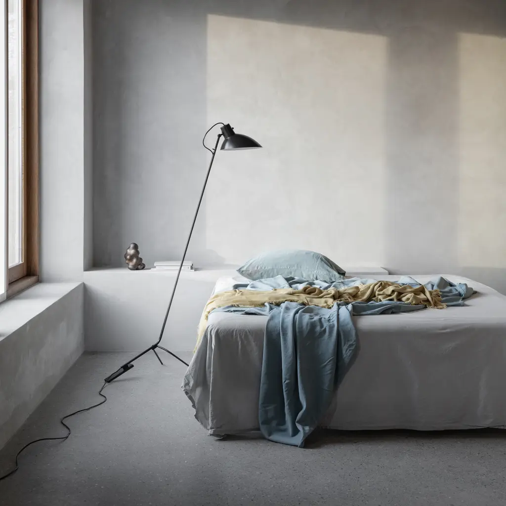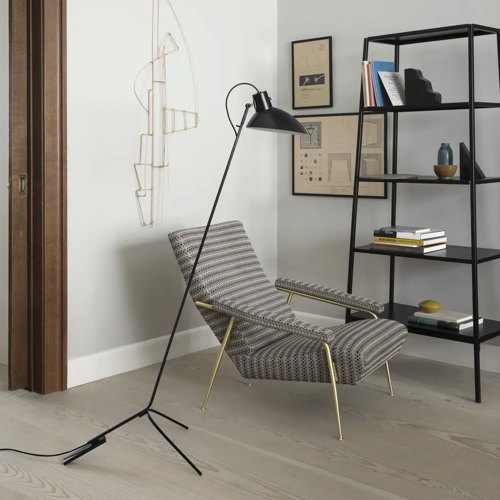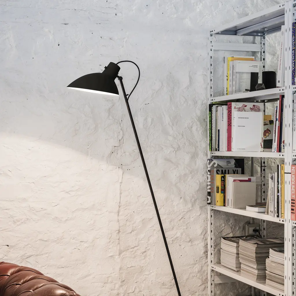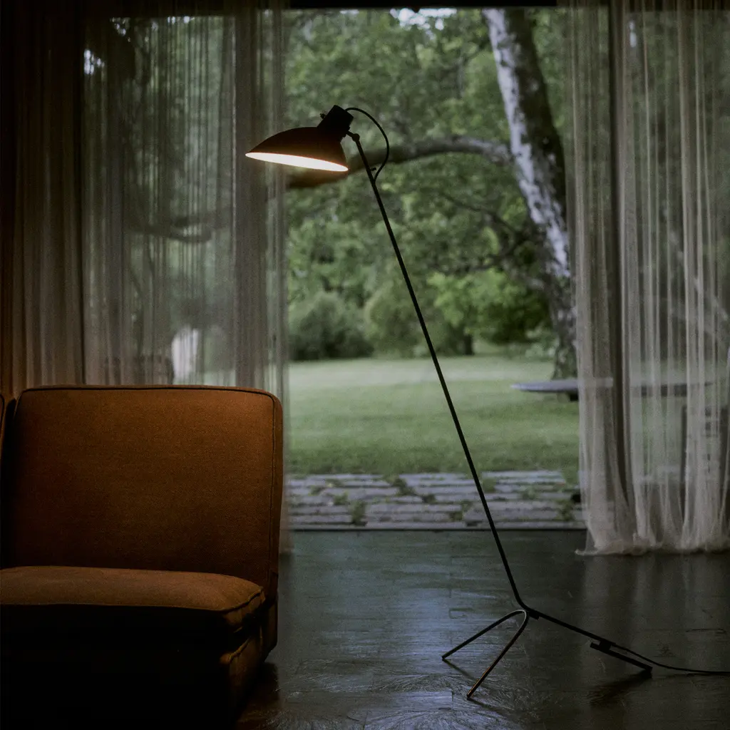 The VV Cinquanta Floor lamp is characterized by its elegant and flexible design, featuring a direct light source that can both swivel and tilt, offering versatility from focused task lighting to ambient upward illumination. The Floor version of the VV Cinquanta is distinguished by its slim, black aluminum frame, which adds a touch of sophistication. The reflector, a key element of the design, is crafted from enameled spun aluminum and is available in black color.