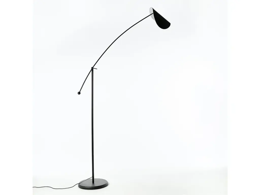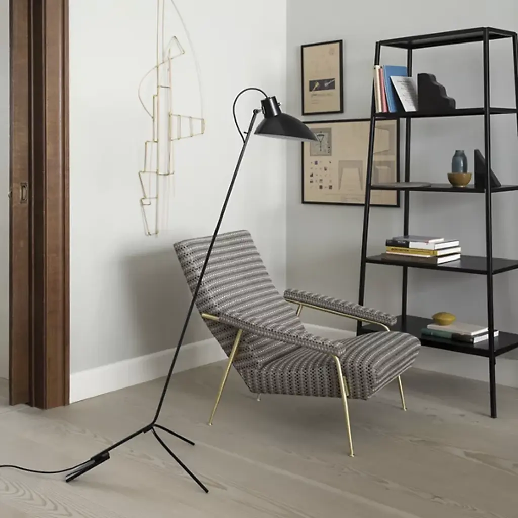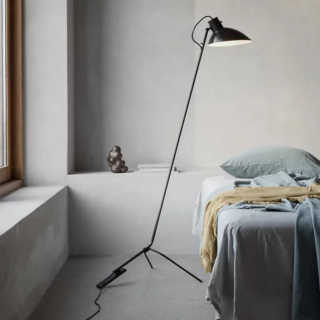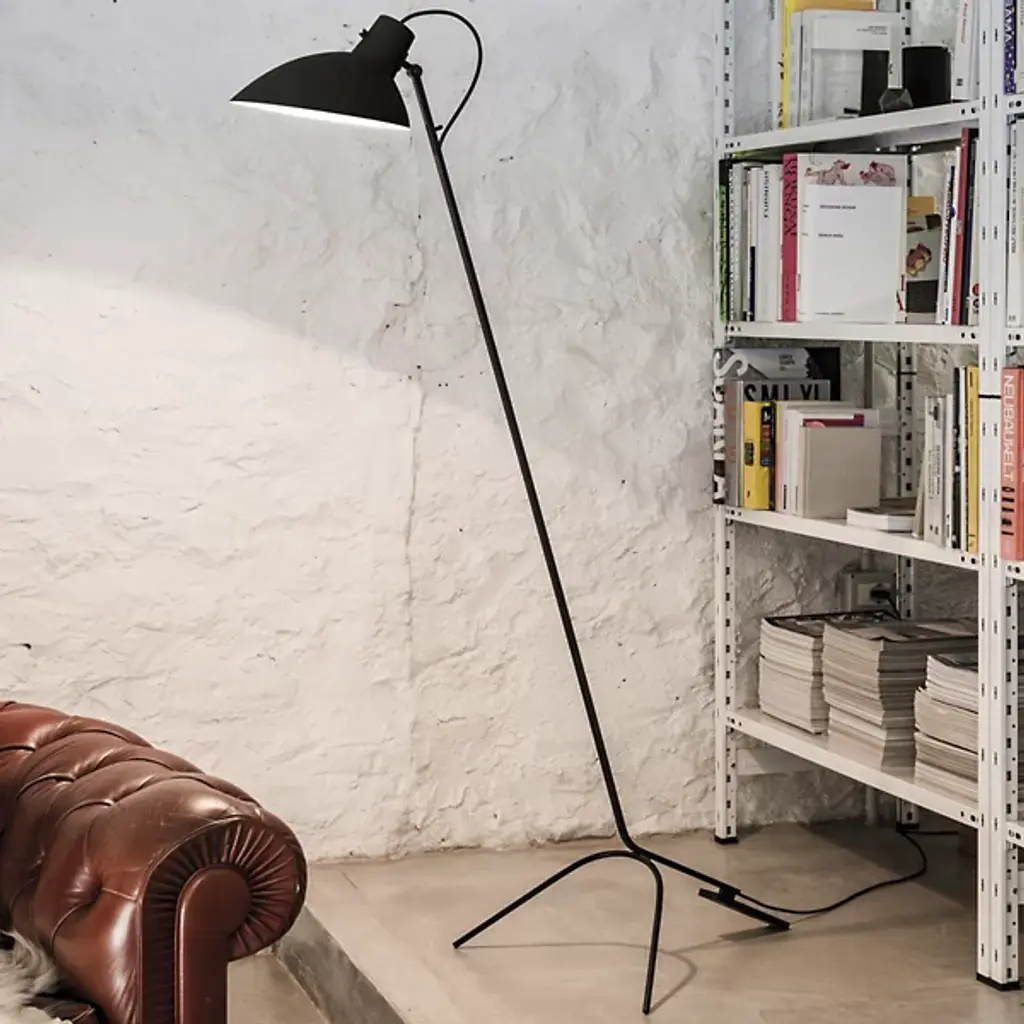 Provide tasteful retro-modern appeal to indoor gathering spaces with the VV Cinquanta Floor Lamp from Astep. Designed by the renowned Vittorano Vigano, it ascends from a tripod base, the backward-angled leg contrasting with the two curving front legs and sweeping upward to posable lamping within a curving, hooded shade. The shade itself can be directed in several configurations, offering a direct downlight or an offset wall wash, warming its surroundings with the simple structure and letting the light speak for itself.