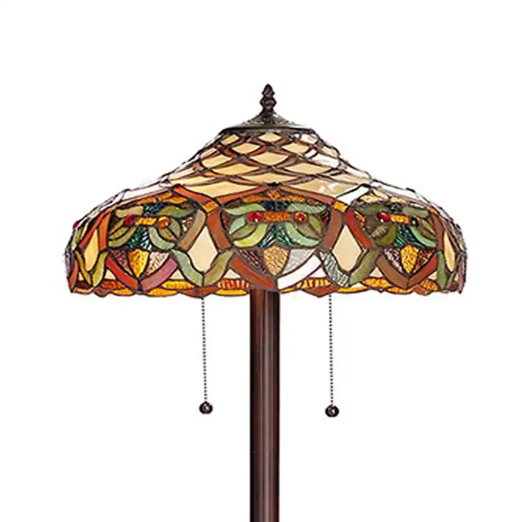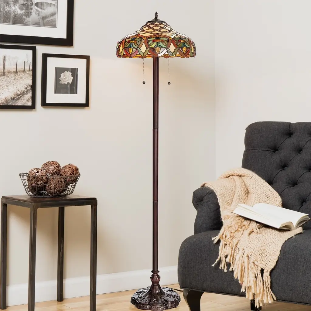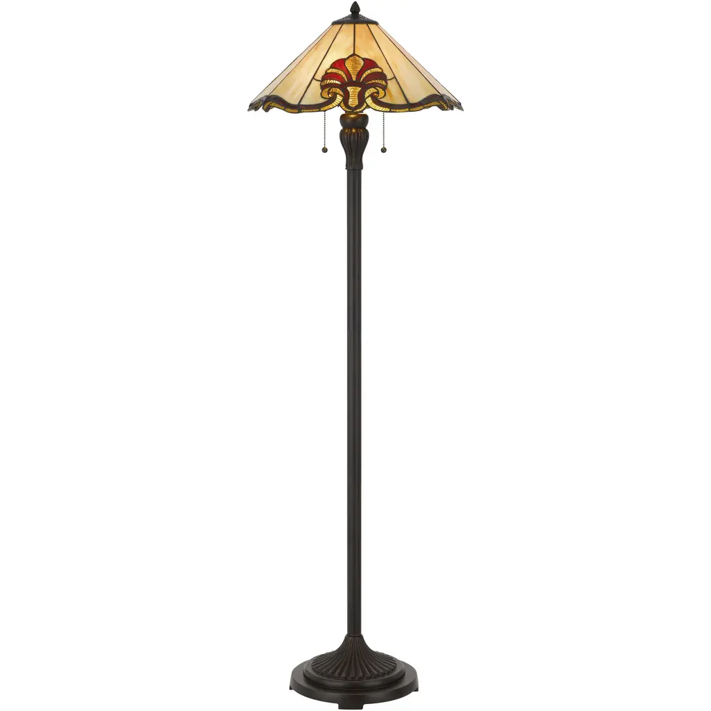 The Warehouse of Tiffany Arielle floor lamp is charming and energetic to create a lively ambiance in any space. Handcrafted using the same techniques that were developed by Louis Comfort Tiffany in the early 1900s, this beautiful Tiffany-style piece contains hand-cut pieces of stained glass. Set includes: One (1) floor lamp Materials: Tiffany art glass Finish: Bronze base, white shade Requires two (2) 60-watt bulbs (not included) Dimensions: 16 inches wide x 61 inches high Attention California residents: This product contains lead, a chemical known to the state of California to cause cancer and birth defects or other reproductive harm.Note: Shade colors will appear darker and less vibrant when not illuminated.