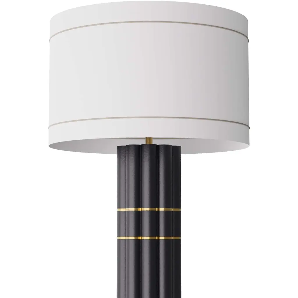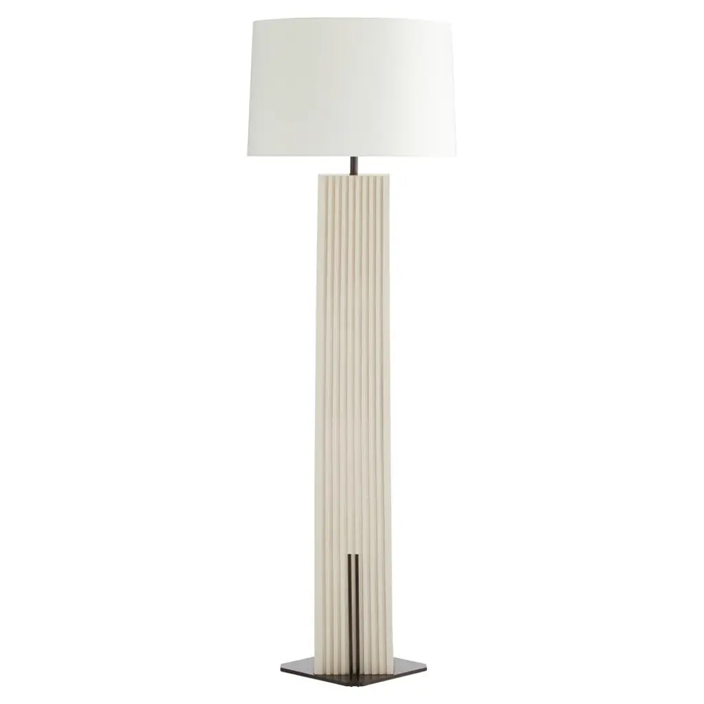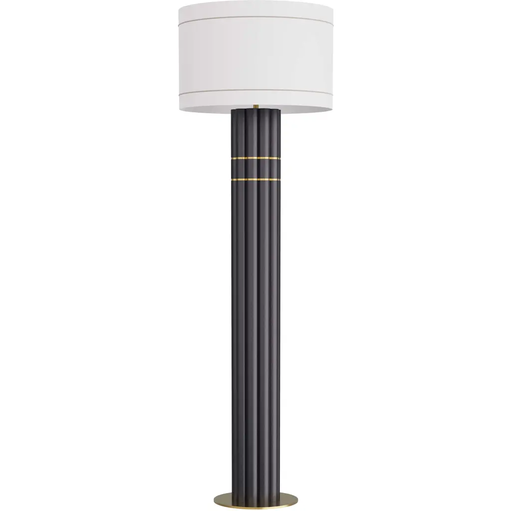 At home in modern or traditional environments alike, our warner floor lamp is crafted as in a cluster of reed shapes forming a scalloped column in black resin. Bands of high-contrast antique brass steel embellish the column, also forming the disc base. The stately lamp is detailed with an antique brass sphere finial and a tapered off-white linen shade lined in off-white cotton. Finish will vary.