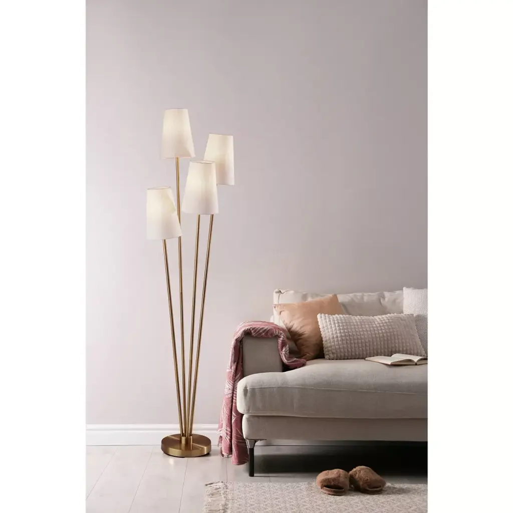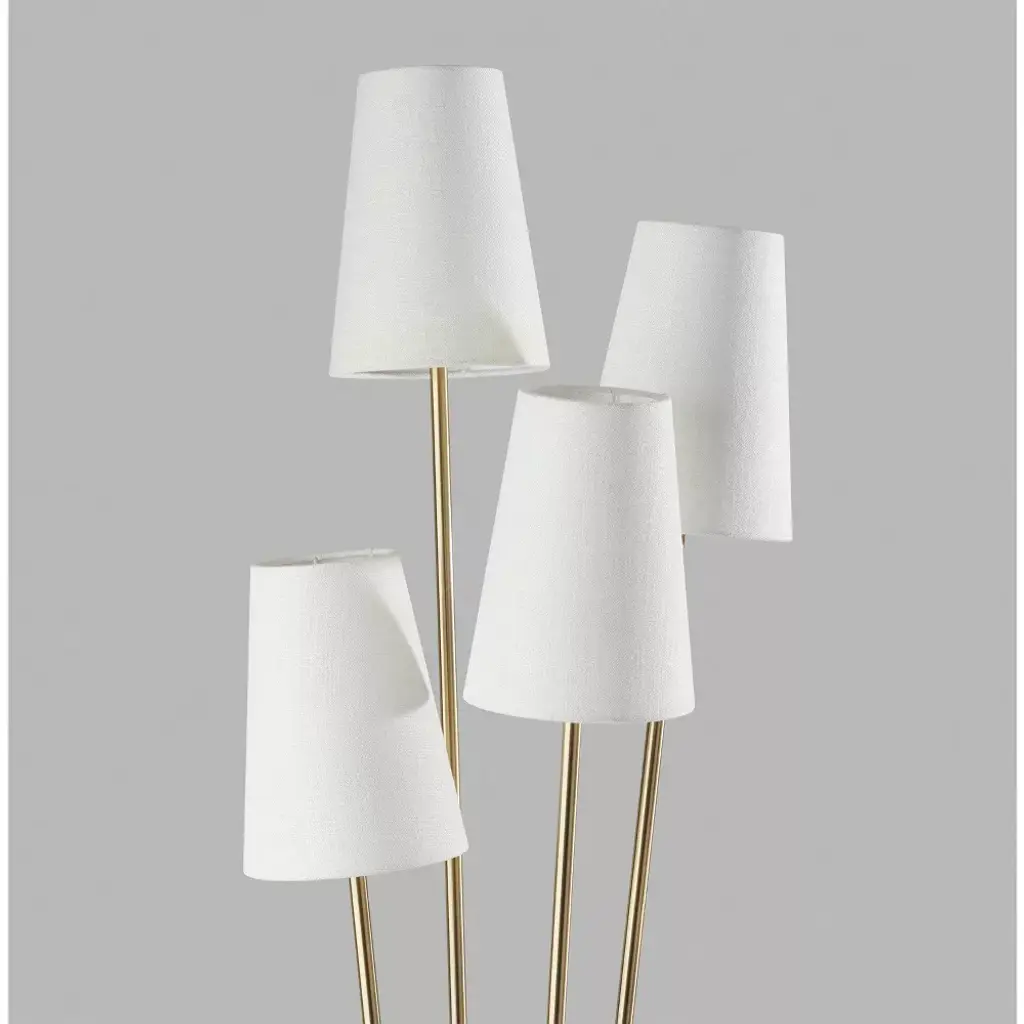 Four is better than one! The Wentworth floor lamp's modern, asymmetrical four-arm silhouette blends contemporary design with mid-century modern materials to illuminate your space in style. The lamp features a simple, 10" diameter round base in antique brass finish supporting four matching thin stems that gradually fan out from the base. Topping the stems at varying heights are four off-white textured fabric shades to throw a soft glow from 40W bulbs. Powered by a 5' black cord, the lamp is easily turned on or off with a foot step switch. The Wentworth floor lamp is also available with a black metal finish and light brown textured linen lampshades to complement modern décor.