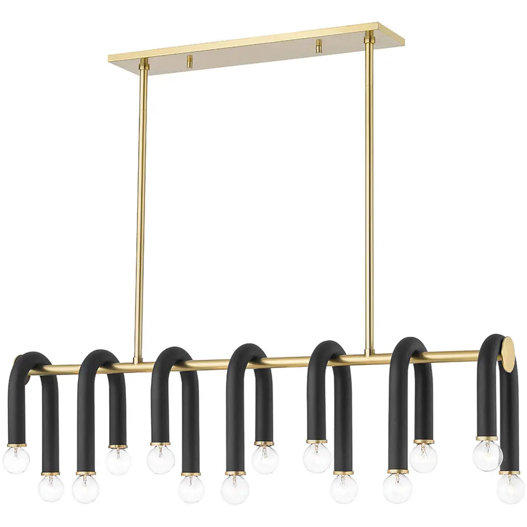Whimsical for the win. A playful take on modern design, Whit features a sweeping black metal tube draped over aged brass or polished nickel accents. The uneven lines create visual interest and allow light to shine at slightly different heights. Choose from a pendant, chandelier, linear, floor lamp or wall sconce that can be mounted to provide either uplight or downlight.