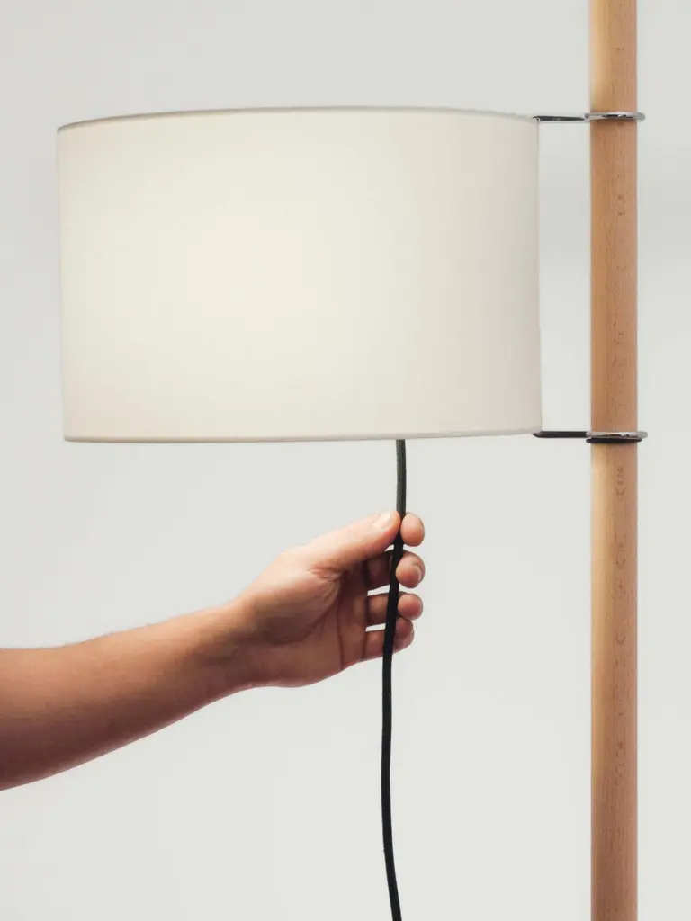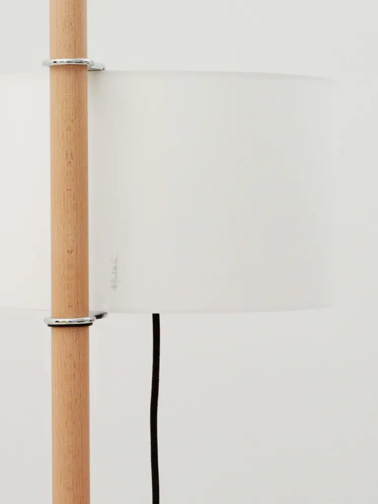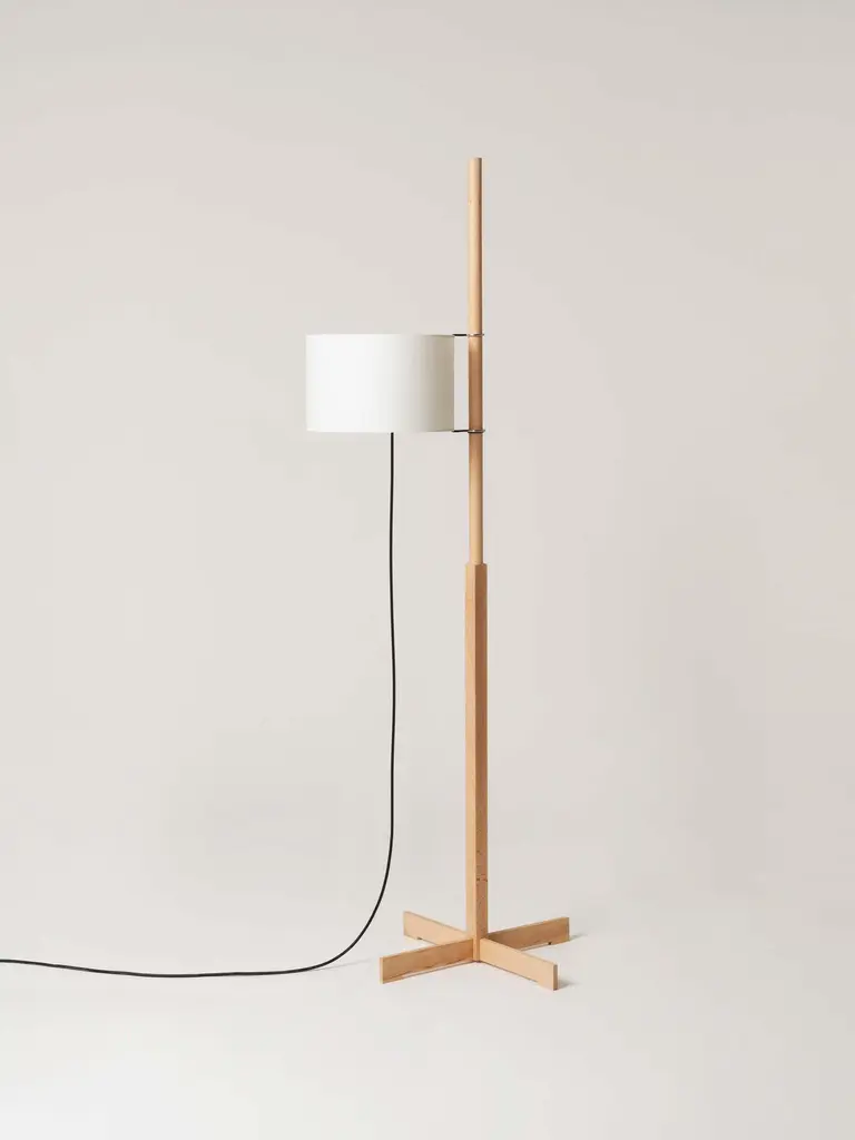 White and beech TMM floor lamp by Miguel MiláDimensions: D 50 x W 60 x H 166 cmMaterials: Beech wood, parchment lampshade.Available in 3 lampshades: beige, white and white with diffuser.Available in 5 woods: beech, cherry, walnut, natural oak and black oak.In a flourish of formal serenity and functional efficacy, Miguel Milá cleverly separated the three basic components of any lamp: the structure, the electrical parts and the shade. The light source rotates around the shaft and can be raised or lowered like a flag on a mast.Height-adjustable lampshade. The light is switched on/off by pulling softly from the cable.Santa & Cole is a small, independent and global editor of design products, with its roots in Belloch (Barcelona, Spain). We have been editing since 1985, when the company was first founded. By editing we mean preparing a work for the public domain, we mean adapting an item for everyone’s use. What a book editor does with stories, we do with objects.More than eighty creators have contributed to a rich catalogue of furniture and lighting products originating in very different contexts, by renowned designers such as Antoni Arola, Miguel Milá, André Ricard and llmari Tapiovaara.Acute and attentive to quality and detail, Santa & Cole outsources all of its industrial production to an extensive network of suppliers, mainly in Spain, but also in other countries such as Japan, where the washi paper for our Tekiò lamp is made.Our mission is to build, safeguard and disseminate knowledge through design objects. Objects whose quality is recognisable at the touch of a hand, and that enrich people’s lives, whether at home or in shared environments. Our philosophy is more modern than futurist and we are more intrigued by silence than by stridency.Our focus is not the present market, but the future one; not Barcelona, but the world; not fashion, but history.All our lamps can be wired according to each country. If sold to the USA it will be wired for the USA for instance.