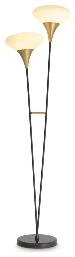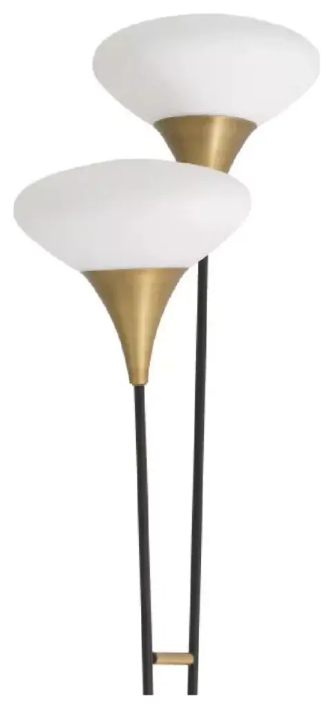 Luxury lighting is embodied by our Floor Lamp Duco. Two antique brass stems are connected with one another to create its super sleek form, each carefully fitted with a white glass shade. Provided with an antique brass finish and delicately displayed on a base of honed black marble, this fixed-position luminaire is characterized by a slender profile and a classic chic look.W20 x D12 x H69 in | Weight 29lbsMaterials | Iron, Glass, Marble2 Bulbs: Max. 10W - E26 - 110 Volt