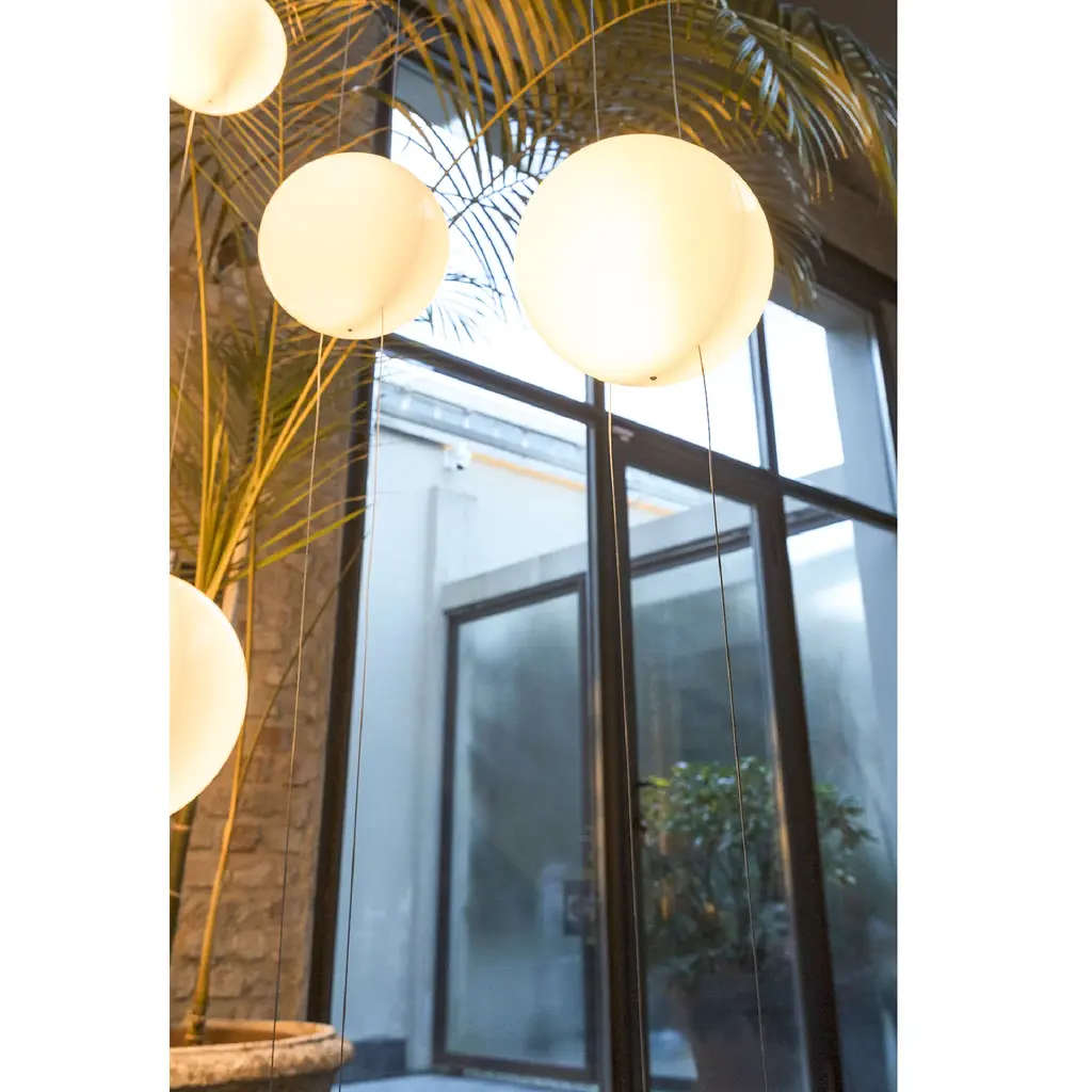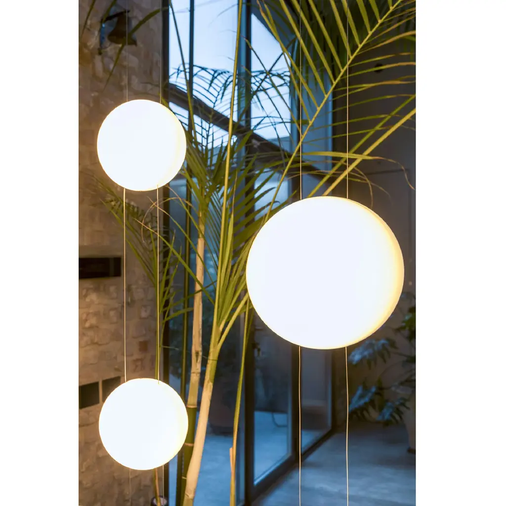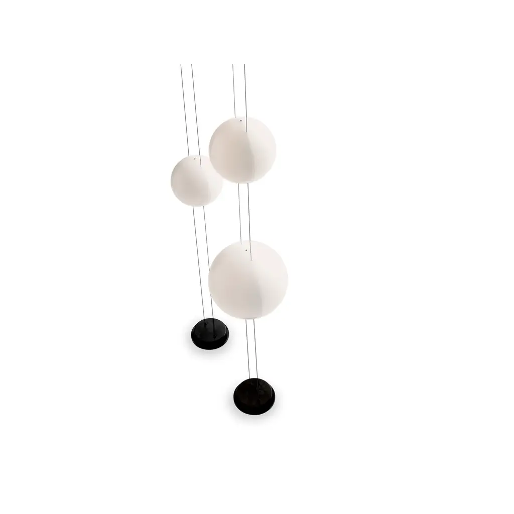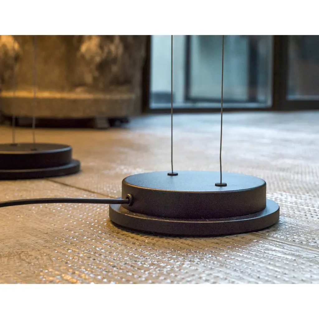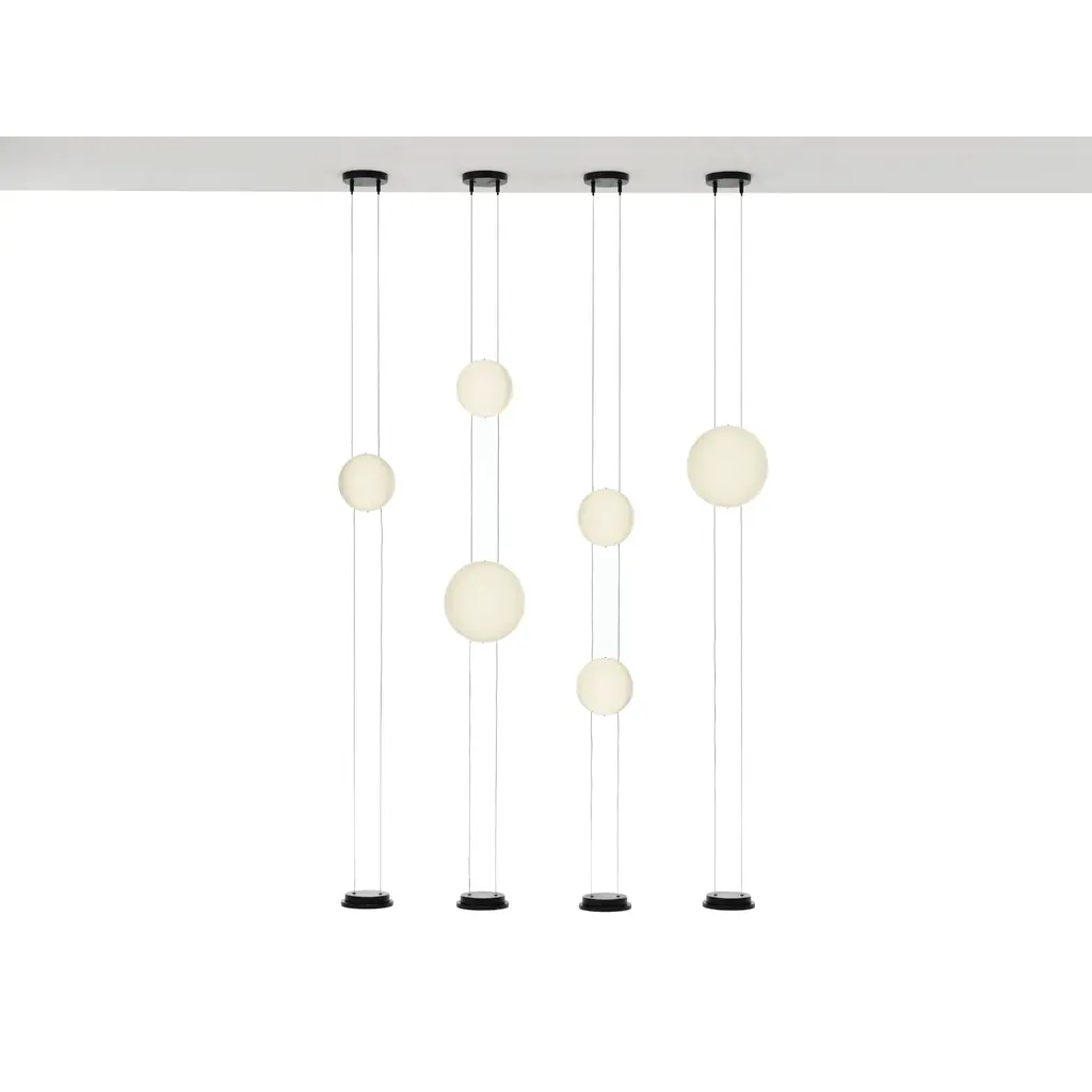 The Mogg Orbit ceiling floor lamp provides diffused lighting, with the spherical diffuser sliding on parallel cables like tracks. The design is clean and essential, with adjustable height and light intensity to create different scenarios. The dimmable lamp is available in 8"Dia Sphere and 11"Dia Sphere , capable of holding up to 3 diffusers. Ground base and ceiling support painted in sophisticated black.