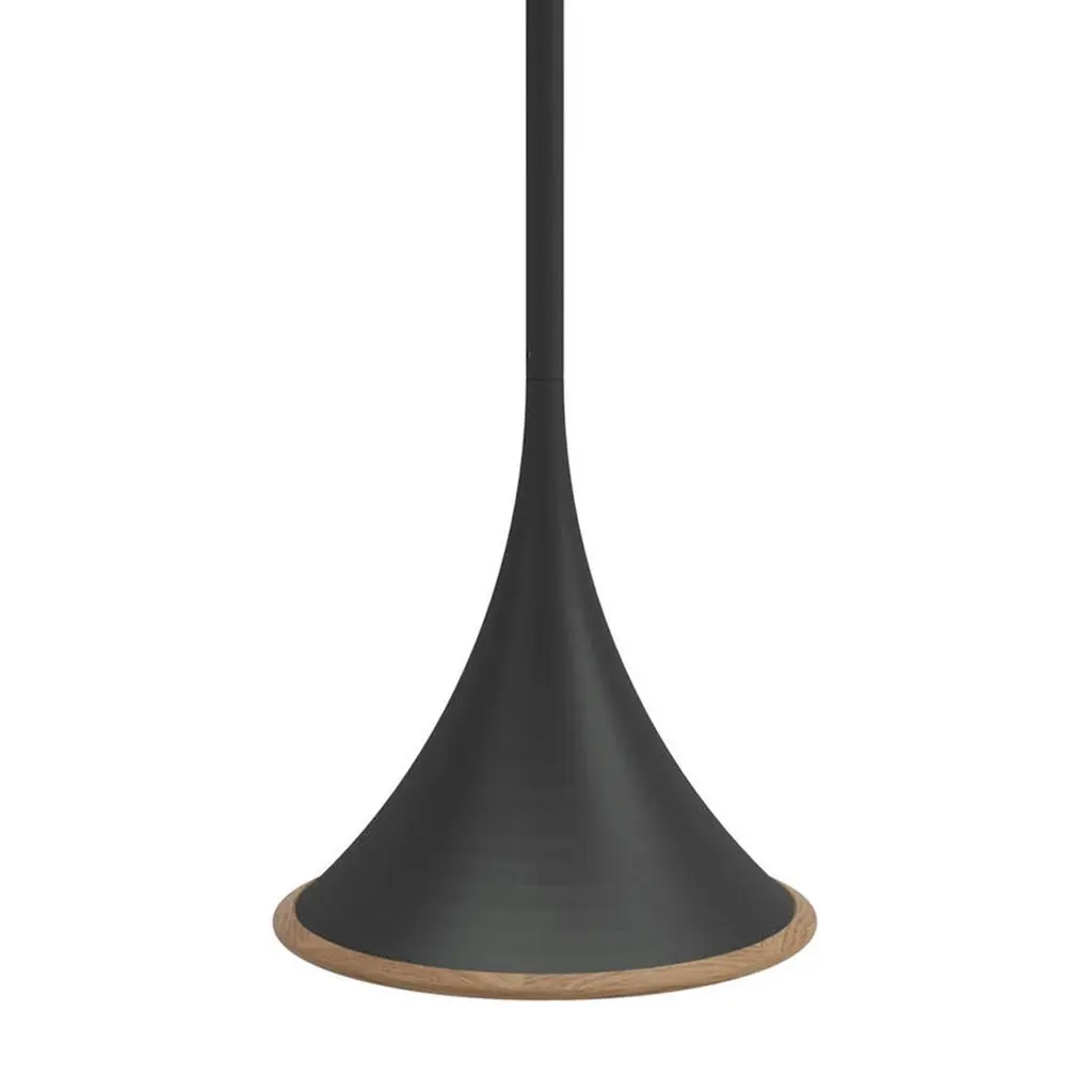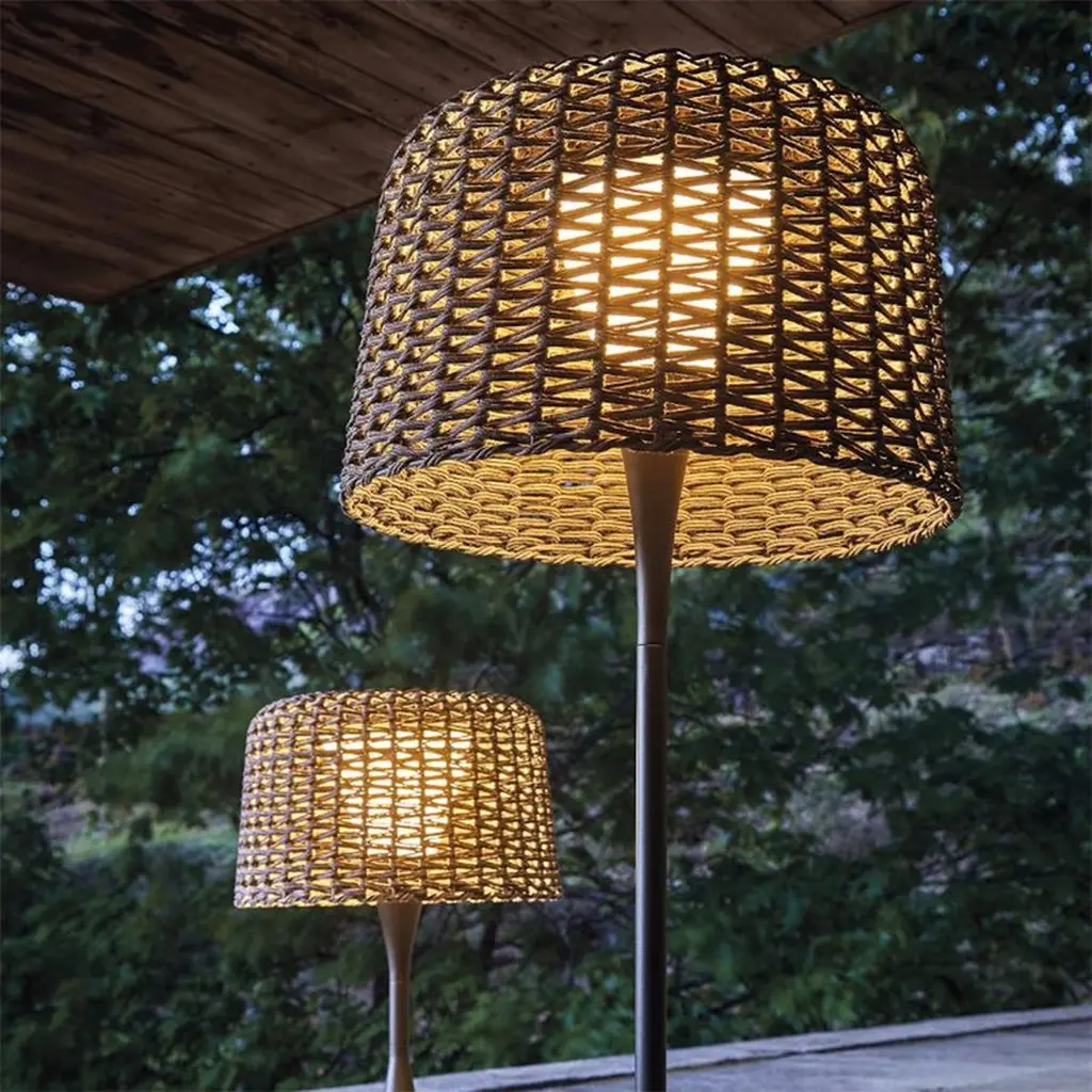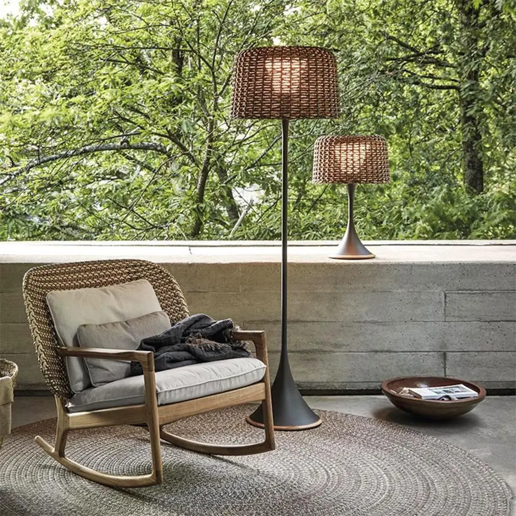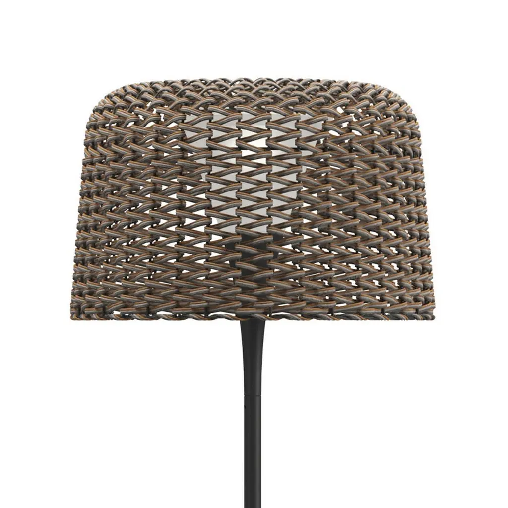 Floor Lamp Wicker Outdoor Black with wicker outdoor wovenlampshade in brown finish, with aluminium anthracite powder-coatedstructure and teak trim on base edge. With solar and mains power rechargable LED light unit. Adaptor Output 4.2V. 65ft range and adaptor Input 100V - 240V DC. 8 hours battery life on max light setting.With remote control radio frequency and with 8 light output settings.