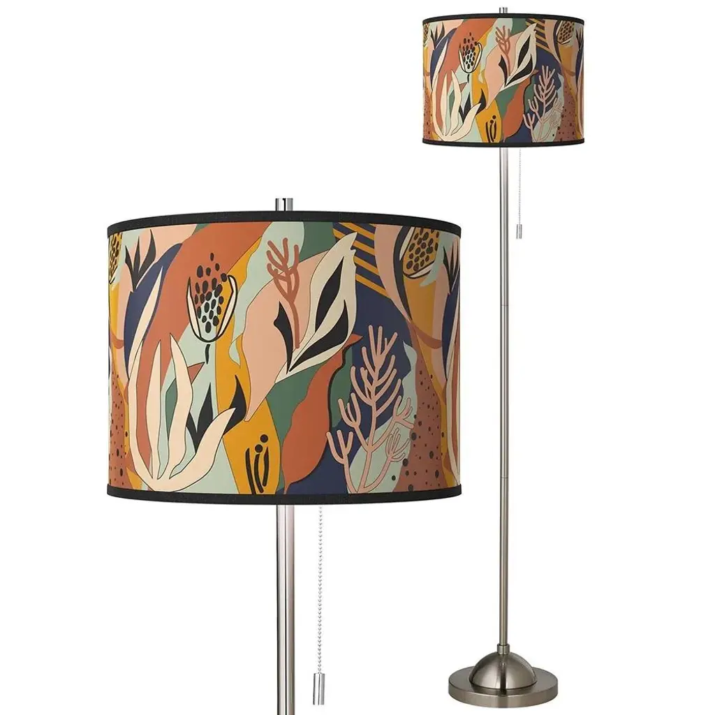 RODUCT DETAILS: Overall: 62" high. Shade is 13 1/2" wide x 10" high. Base is 10" wide x 1 1/4" high. Takes one maximum 100 watt bulb (not included). Floor lamp with pull chain. Custom printed translucent shade with Wild Desert pattern. Brushed nickel finish. DESCRIPTION: The base of this floor lamp has a modern look that pairs well with the unique personality of a giclee art shade. The custom made-to-order shade features a stylish Wild Desert giclee-printed pattern that is printed by the same technique used in reproducing museum-quality artwork. The base features a cool, brushed nickel finish and has an on-off pull chain.