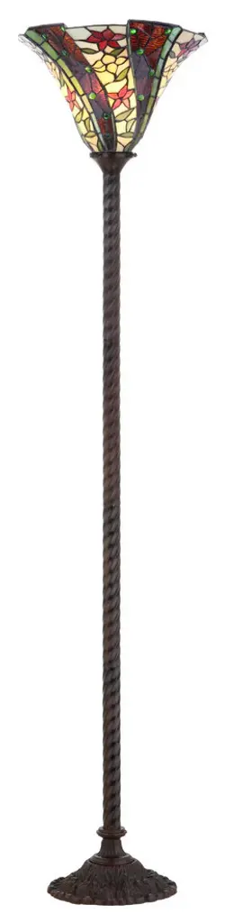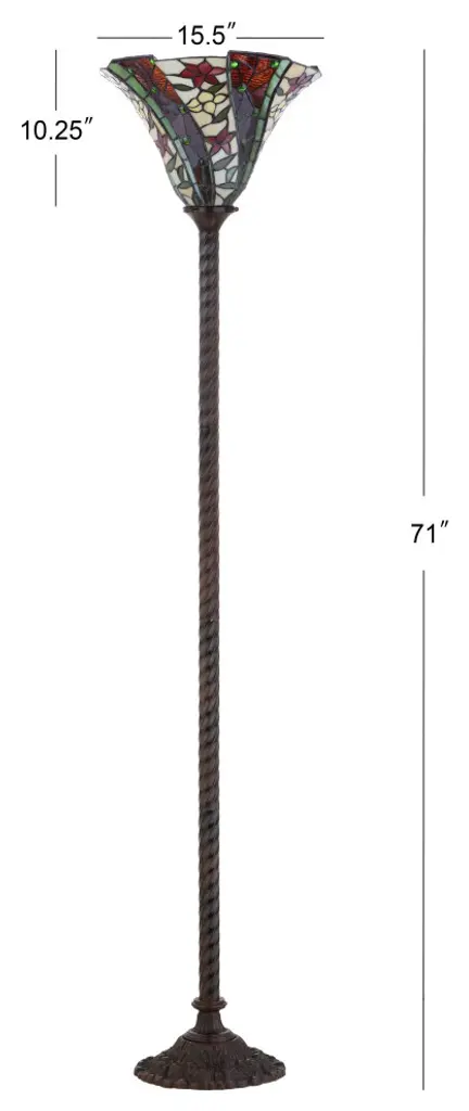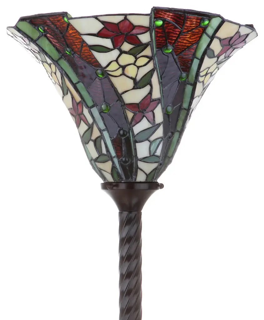 One of the finest techniques to come out of the Art Nouveau movement, the Tiffany-style stained glass shade on this torchiere floor lamp makes for a stunning addition to any space. While steeped in traditional design with it''s barley-twist base and floral motif on the shade, this piece is updated with the functionality expected today -- a step-on on/off button, LED bulb compatibility, and a beautiful silk-wrapped cord. Each shade is hand-made by artisans who specialize in the intricate art of stained glass soldering. -Elegant shade design in shades of ivory, green and red.-Handcrafted stained glass shade soldered with metal. -Beautiful to display or easy to conceal: the 72" cord is silk-wrapped.-On-off foot-step switch-Takes one maximum 100-watt incandescent bulb, 23 watt CFL bulb, or 4 watt LED bulb (one LED bulb included).-Eco-friendly 9W LED bulb included-UL Listed-Color: Multi with bronze base-Body Material: Metal-Base Material: Metal-Includes: One (1) lamp(s)-Minor Assembly Required-Lamp: 71 inches high x 15 inches wide x 15 inches deep-Shade: 10.25 inches high x 3.13 inches wide x 3.13 inches deepYou see a lamp.We see a decorative work of art.A perfectly curved shade casts a dramatic shadow on a floor. A silk cord you never want to hide. LED lightbulbs: as easy on the environment as they are on the eyes. The JONTHAN Y Lighting collection considers every detail from impeccably sourced materials to designer styling. And our prices are so attractive, we''ve transformed a functional necessity into a fashion accessory.JONATHAN Y Lighting a fashion revolution in home decor.