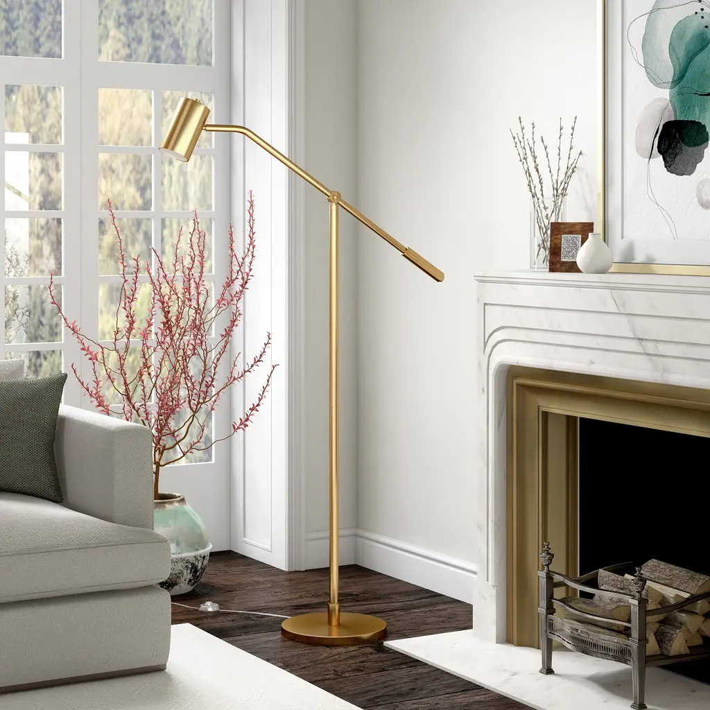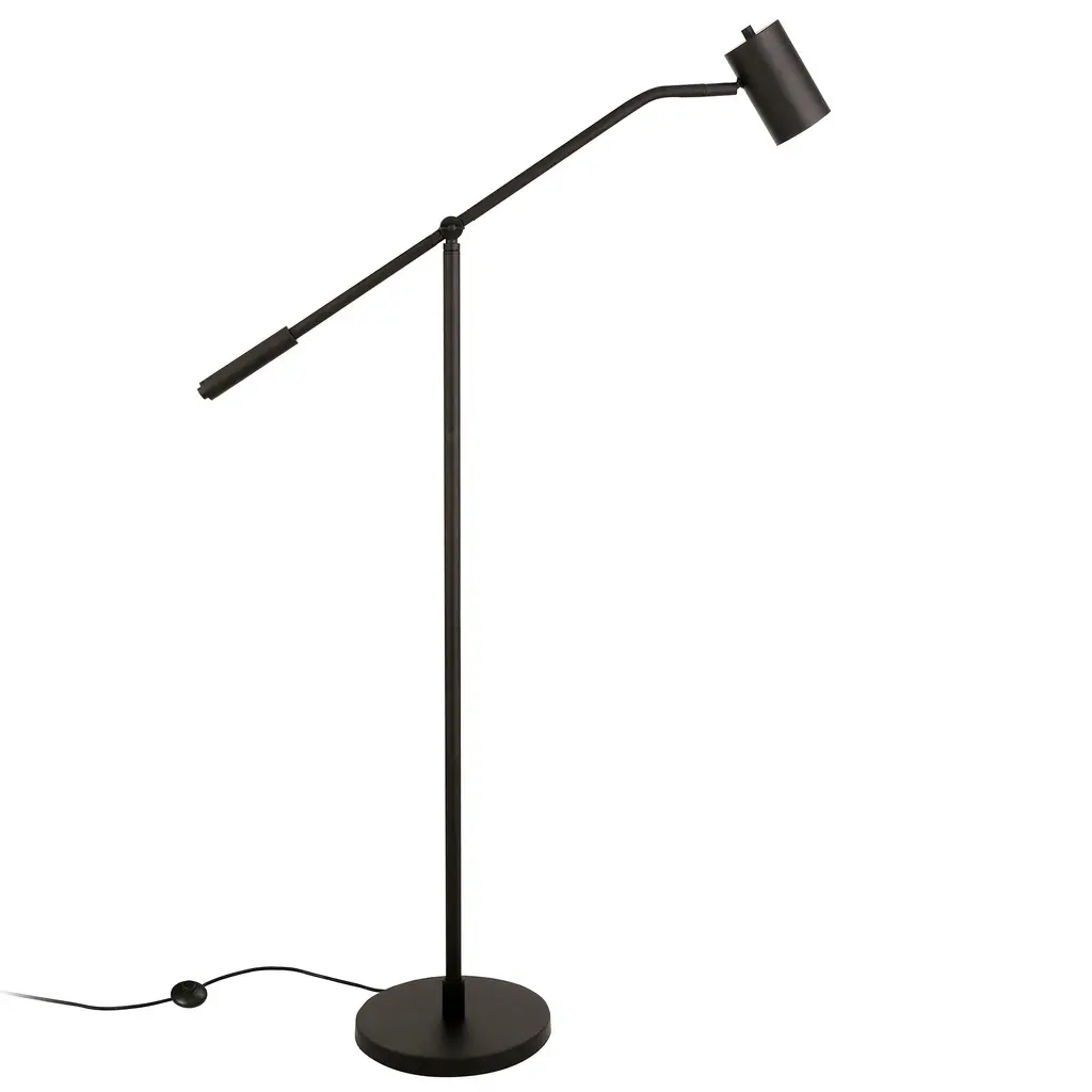 Upgrade the lighting in your space with this modern update of a classic pharmacy floor lamp. The low-profile design has a boom-style arm that can be adjusted to cast light at a variety of angles. A sleek cylindrical metal shade creates ample downward illumination, making this the perfect task lamp for your reading nook, home office, or bedroom. Features an adjustable boom arm. Paired with a cylindrical shade. The shade is made of metal. Rated for one 100W incandescent bulb; 9W LED bulb, 23W fluorescent (CFL) bulb, or 9W self-ballasted LED bulb. E26-base bulb. Includes an 8 ft. cord. Clean with a soft, dry cloth; no harsh chemicals or abrasive cleaning materials.