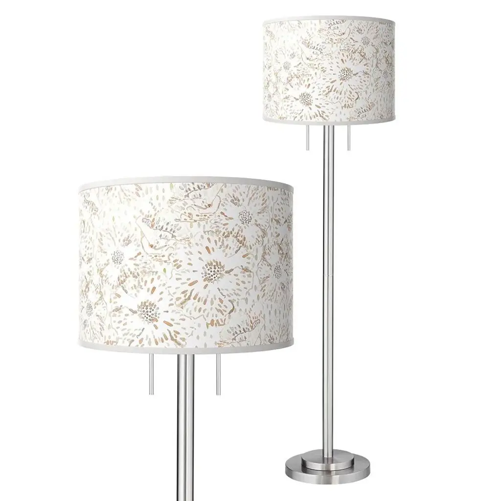PRODUCT DETAILS: Overall: 63" high. Shade is 18" wide x 12 3/4" high. Base is 12" wide. Takes two maximum 100 watt bulbs (not included). Pull chain switches. Sleek contemporary floor lamp. Custom made-to-order drum shade with Windflowers giclee printed pattern. Exclusive shade design by pattern designer Katja Hockenberg. Brushed nickel finish over metal construction. DESCRIPTION: The Garth brushed nickel finish floor lamp takes a simple base design and pairs it with a striking printed drum shade for a burst of style. The shade design is custom made-to-order and features an exclusive Windflowers pattern.