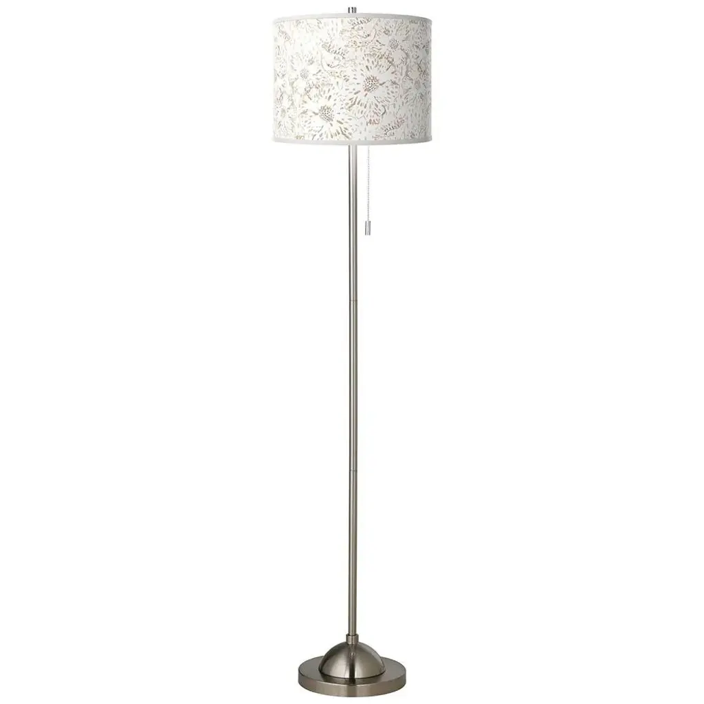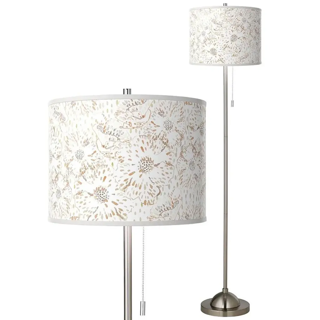 PRODUCT DETAILS: Overall: 62" high. Shade is 13 1/2" wide x 10" high. Base is 10" wide x 1 1/4" high. Takes one maximum 100 watt bulb (not included). Floor lamp with pull chain. Custom printed translucent shade with Windflowers pattern. Exclusive shade design by pattern designer Katja Hockenberg. Brushed nickel finish. DESCRIPTION: The base of this floor lamp has a modern look that pairs well with the unique personality of a giclee art shade. The custom made-to-order shade features a stylish Windflowers giclee-printed pattern that is printed by the same technique used in reproducing museum-quality artwork. The base features a cool, brushed nickel finish and has an on-off pull chain.