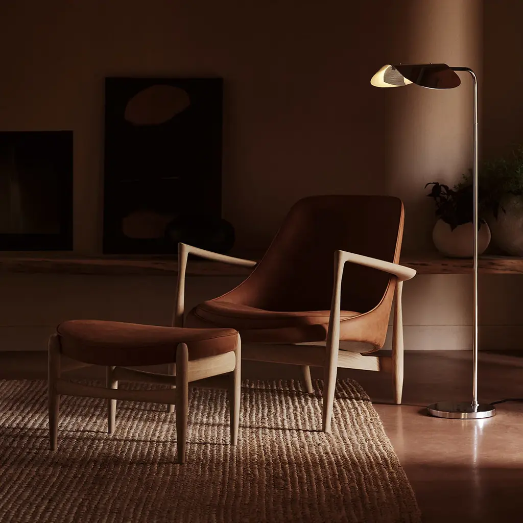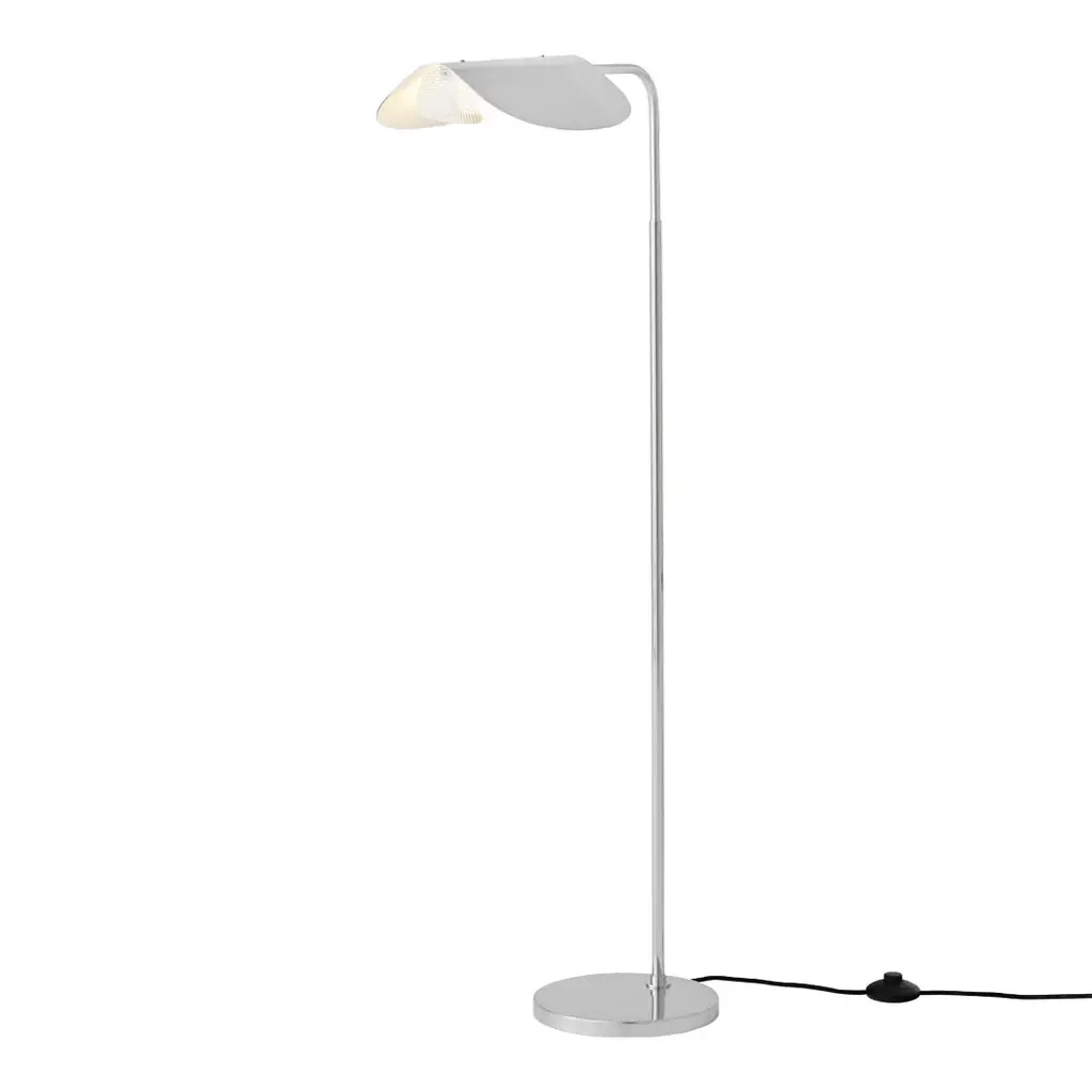 A design with timeless appeal, the modernist and minimal Wing Floor Lamp brings character to any setting thanks to its playful aesthetic. Created in the late 1970s by the award-winning Swedish designer Kenneth Bergenblad, the lamp's simple idiom brings together past, present and future. Alluding to the wings of a bird, the polished aluminum shade rotates to allow you to direct the light to wherever it is needed and create playful movement on the architectural design.