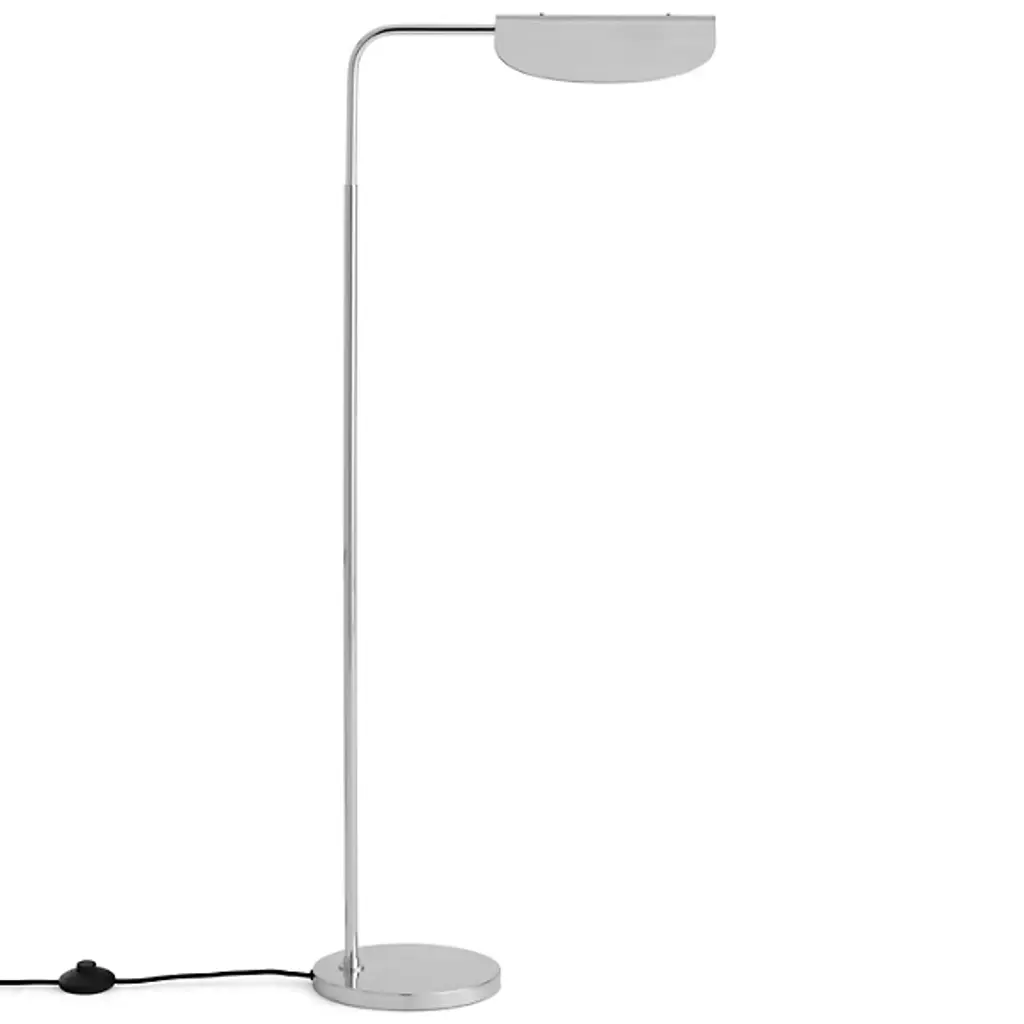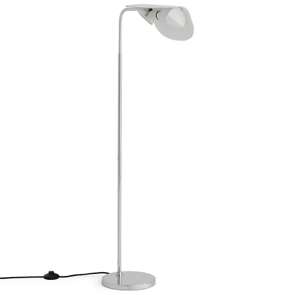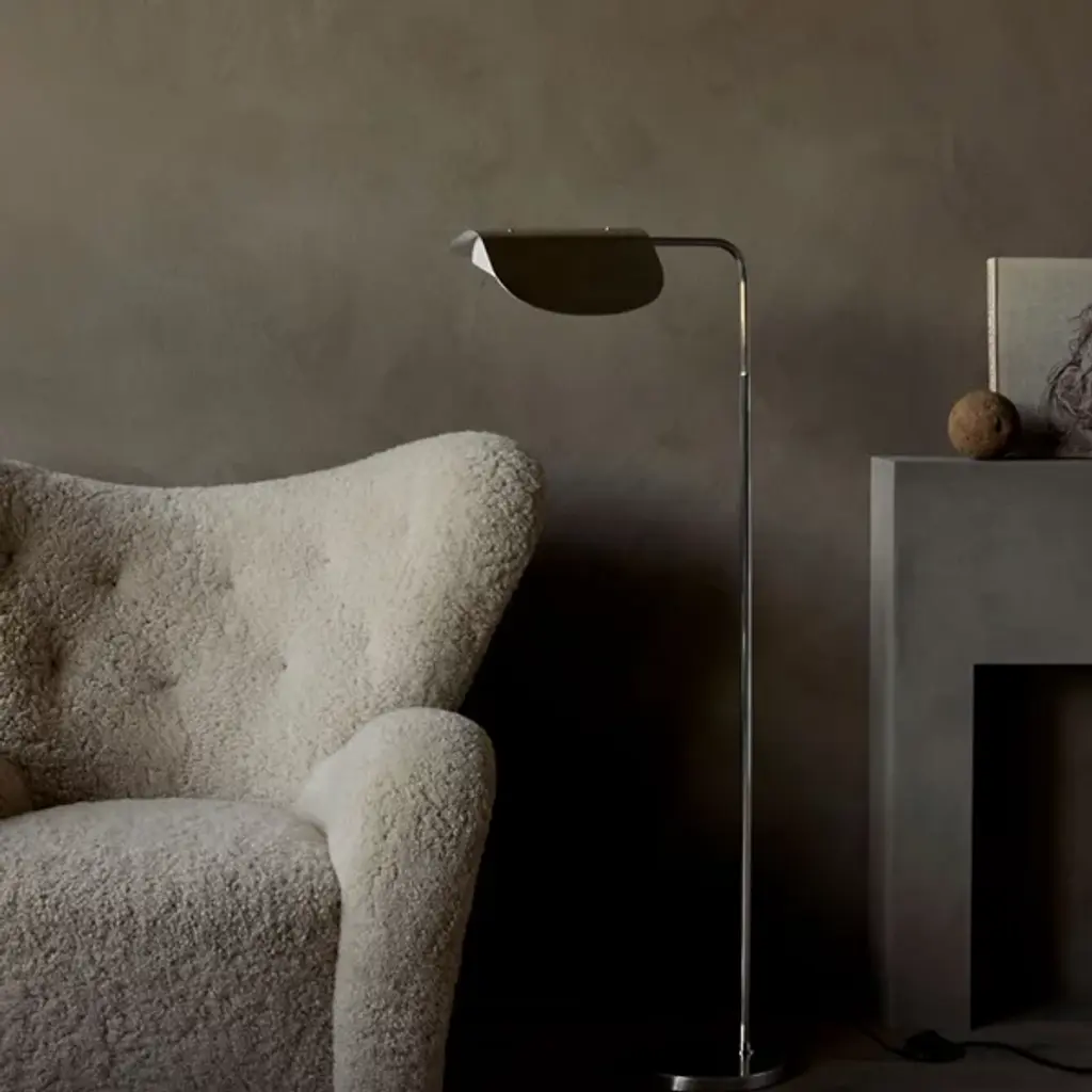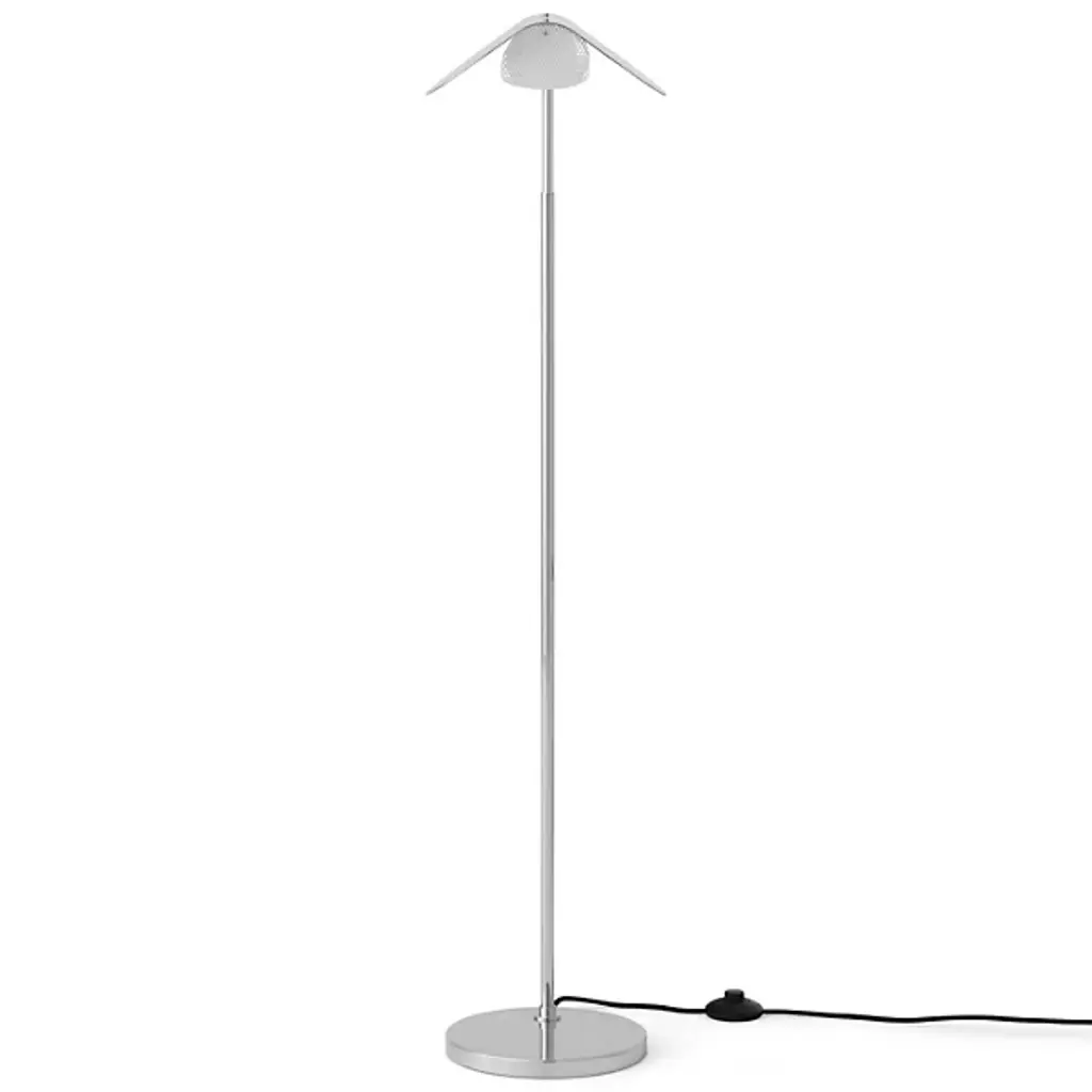 Graceful like a bird in flight. The Wing Floor Lamp from Audo Copenhagen, formerly known as Menu, flows before one’s eyes with evocative curves, dispersing a smooth, tailored light. Award-winning designer Kenneth Bergenblad’s Scandinavian aesthetic is informed by balancing shapes, colors, and materials with timelessness in mind. Resting on a low-profile base, this steel piece stands with a slender architectural column that slots in tight areas. The aluminum shade’s folded curves evoke fluttering wings as they conceal the lamping for minimal glare. This artful shade rotates for an ideal flow of light. The light reaches one’s eyes as a soft cast glow.