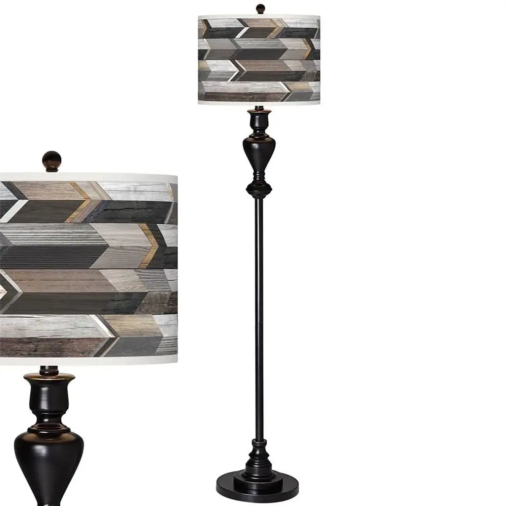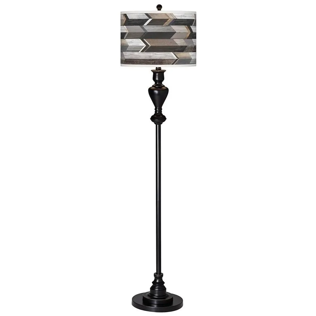 PRODUCT DETAILS: Overall: 58" high. Shade is 13" wide x 10" high. Base is 10" wide. Takes one maximum 150 watt bulb (not included). Stylish floor perfect for living rooms, family rooms, and more. Black bronze finish with soft gold edging. Metal construction. Custom-printed giclee lamp shade with Woodwork Arrows pattern. DESCRIPTION: Add a stylish and unique accent to your living space with this shapely floor lamp which is topped off with our patented Woodwork Arrows pattern giclee shade. Warm light shines through illuminating the pattern and creating a truly distinctive look.