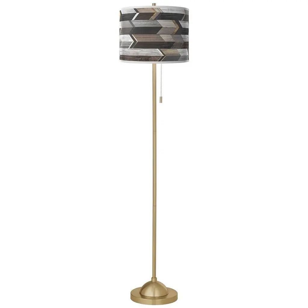 PRODUCT DETAILS: 62" high overall. Drum shade is 13 1/2" wide across the top and bottom x 10" high. Base is 10" wide x 1 1/4" high. Weighs 12 lbs. Uses one maximum 100 watt standard-medium base light bulb (not included). On-off pull chain for easy lighting control. Stick floor lamp from the Giclee Glow brand. Custom printed Woodwork Arrows shade. Shade printing process U.S. Patent # 7,347,593. Warm gold finish. 8-foot long cord. DESCRIPTION: Brighten your home with this modern style stick floor lamp. It features a warm gold finish and is topped by a classic drum shade for a clean look. The shade has an exclusive Woodwork Arrows pattern and is giclee printed and made to order. An on-off pull chain switch allows for easy lighting control.