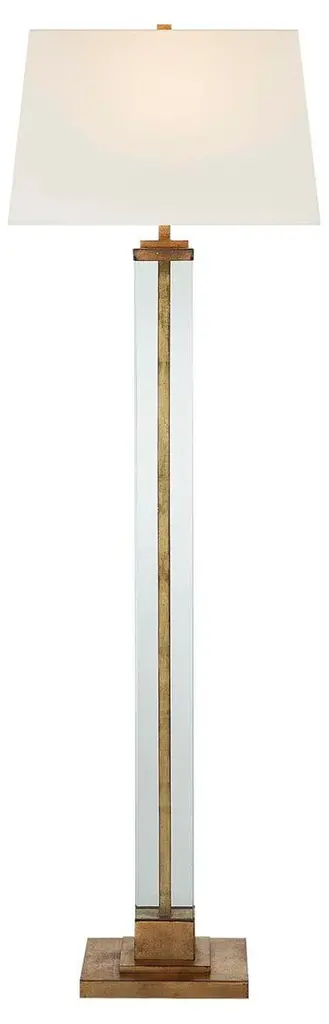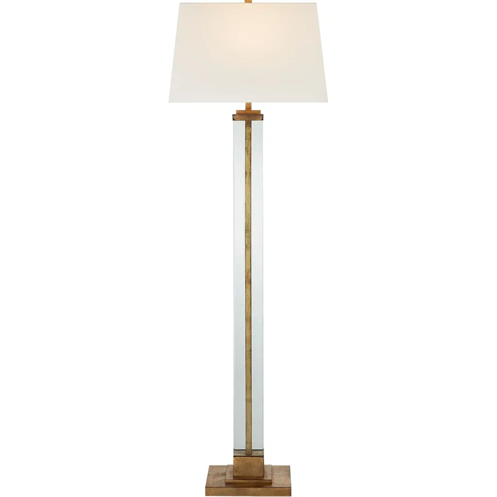 Lend a refined, luxe presence to interiors with the angular appeal of the Wright Floor Lamp from Visual Comfort Signature, formerly known as Visual Comfort, A restrained blend of metal and glass, it rises from a stepped rectangular base in steel, a coordinated vertical band encompassing a smooth glass column that terminates in a stepped upper cap that extends bright lamping beneath a flared linen shade. This gauzy surface is secured by a small metal finial and extends a mix of horizontal warmth and direct vertical downlight below, glancing and glittering off the textured metal and giving the sleek glass column a gleaming glow.
