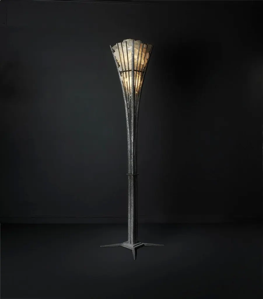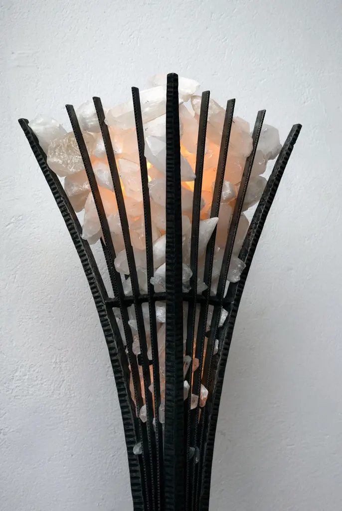 A hand-hammered and rock crystral pair of floor lamps by Sylvain Subervie. The base consists of 4 Stems attached to a 2 level square piece. 4 arms shoot up ending in a cage like structure housing the rock crystal prisms. The rock crystal cage house 2 halogene bulbs of 100 WThere is also a small table lamp size version of this work.