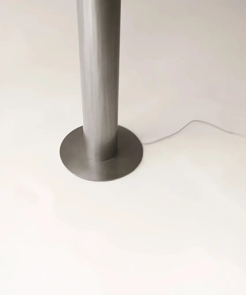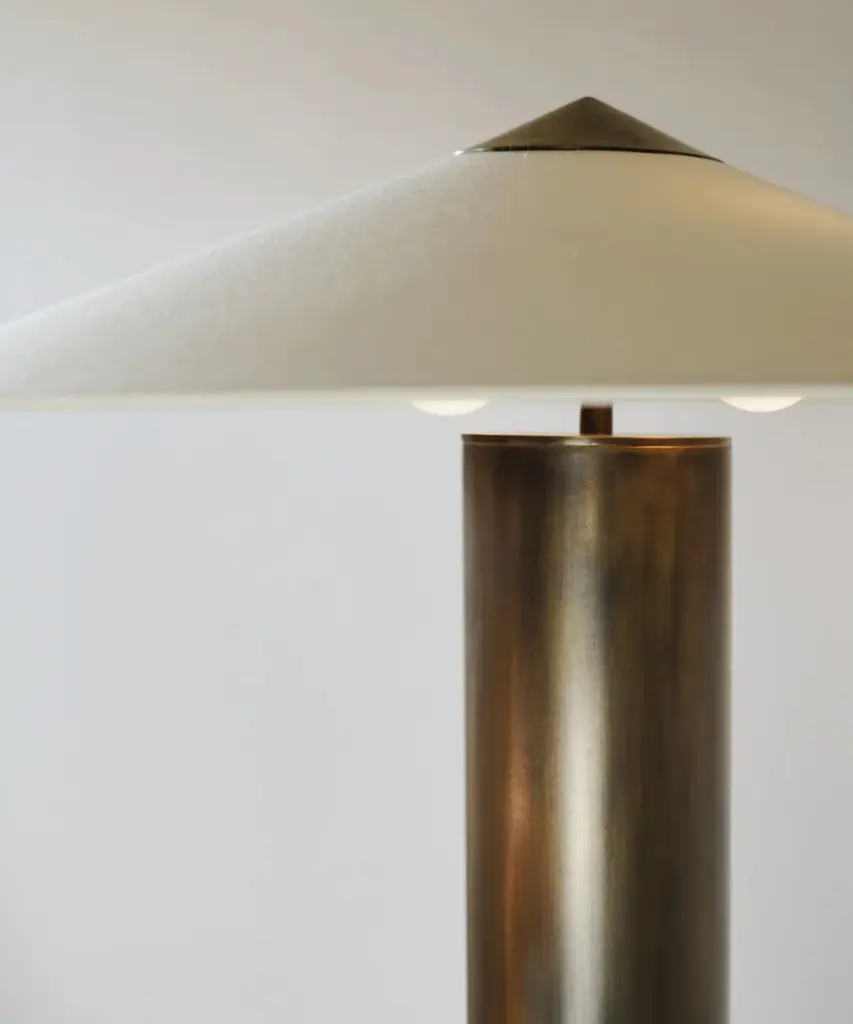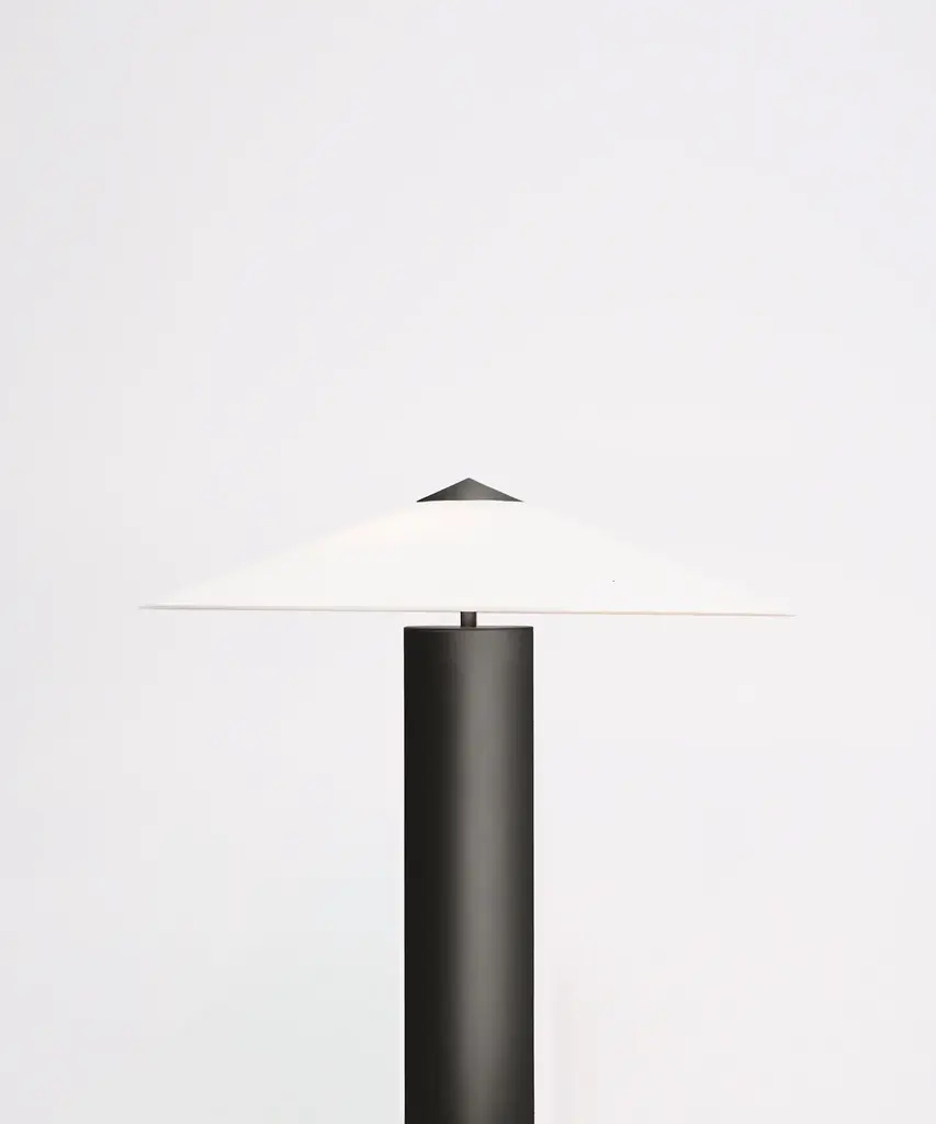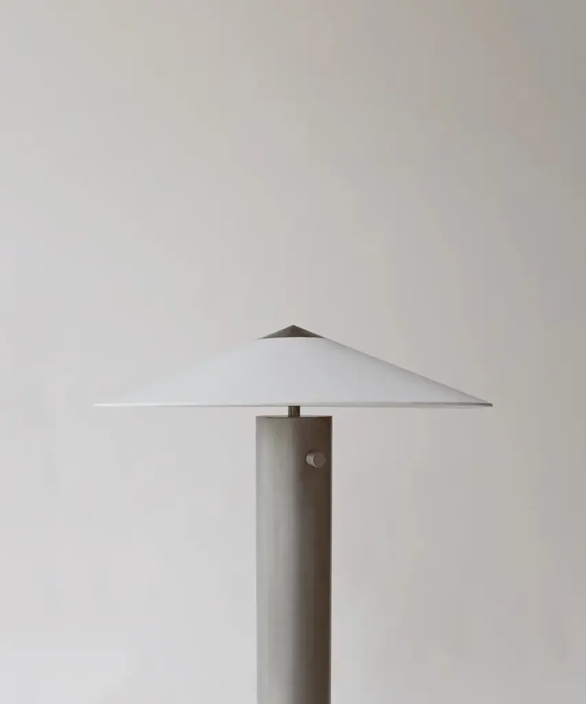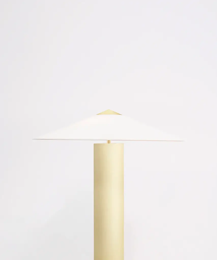 This symmetrical floor lamp is comprised of a metal cylindrical base and a custom linen shade which is cupped by a hand-turned metal cone that continues the shade's mountain-like profile. Also available in two table lamp sizes. Each piece is designed and hand-produced by Coil + Drift, a lauded New York's Catskill Mountains-based design studio known for its vividly three-dimensional and material-forward collections.