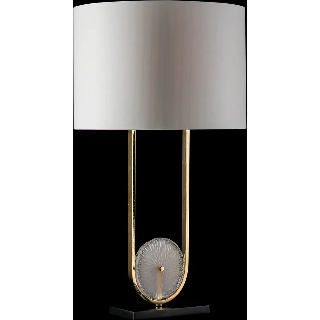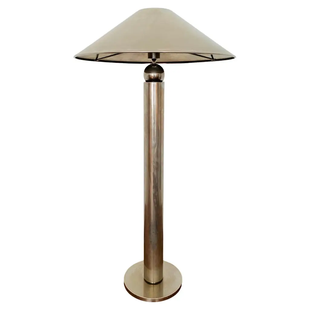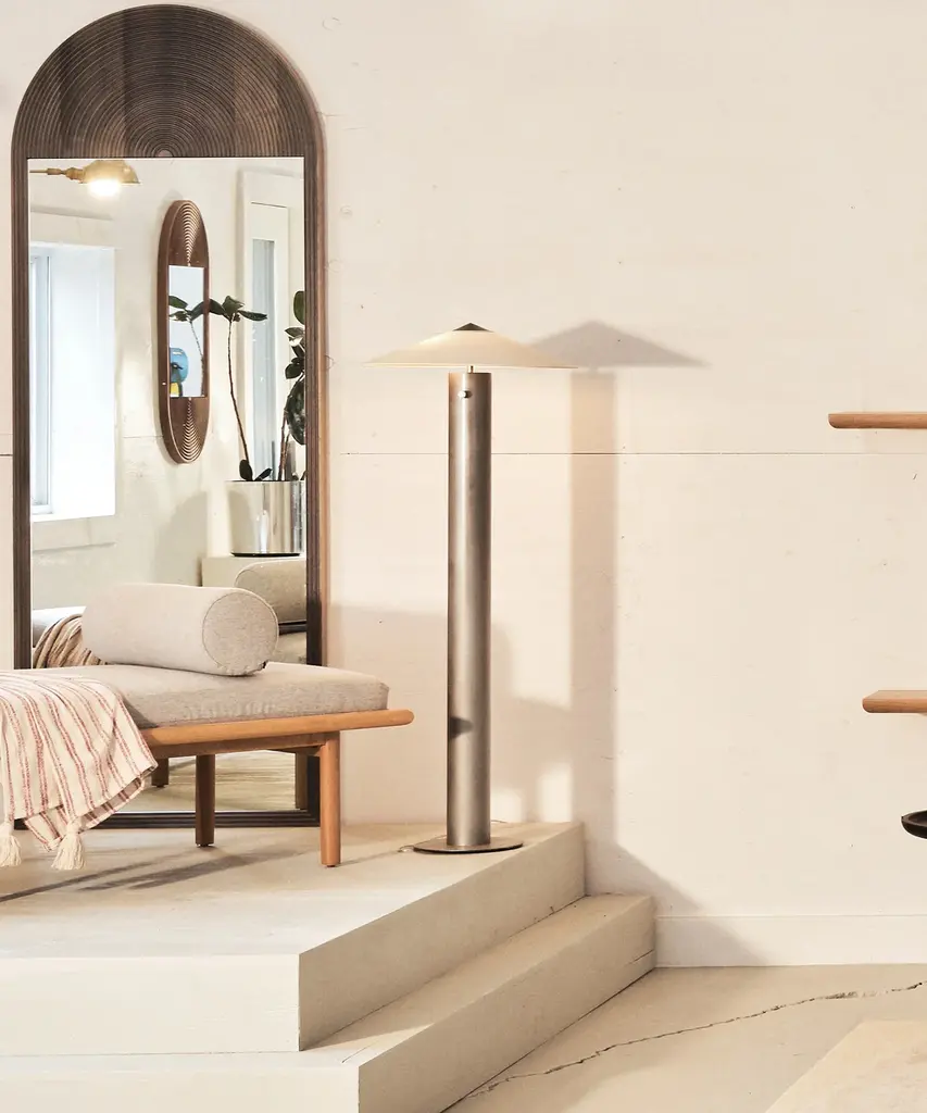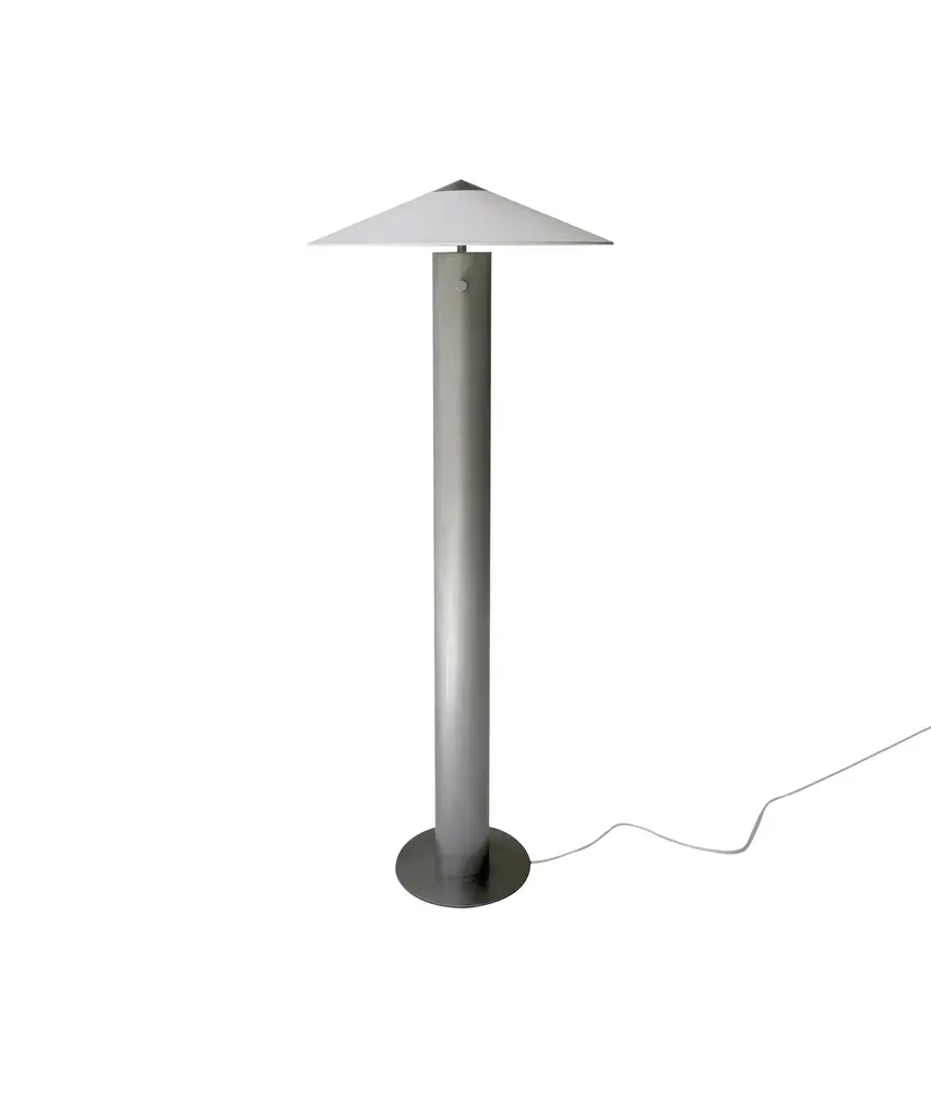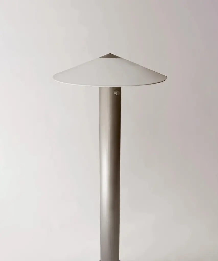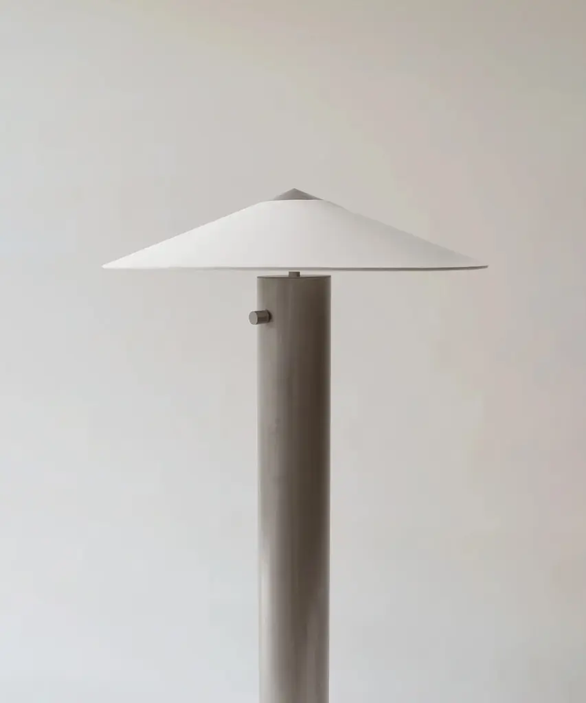 This symmetrical floor lamp is comprised of a metal cylindrical base and a custom linen shade which is cupped by a hand-turned metal cone that continues the shade's mountain-like profile. Also available in two table lamp sizes. Each piece is designed and hand-produced by Coil + Drift, a lauded New York's Catskill Mountains-based design studio known for its vividly three-dimensional and material-forward collections.