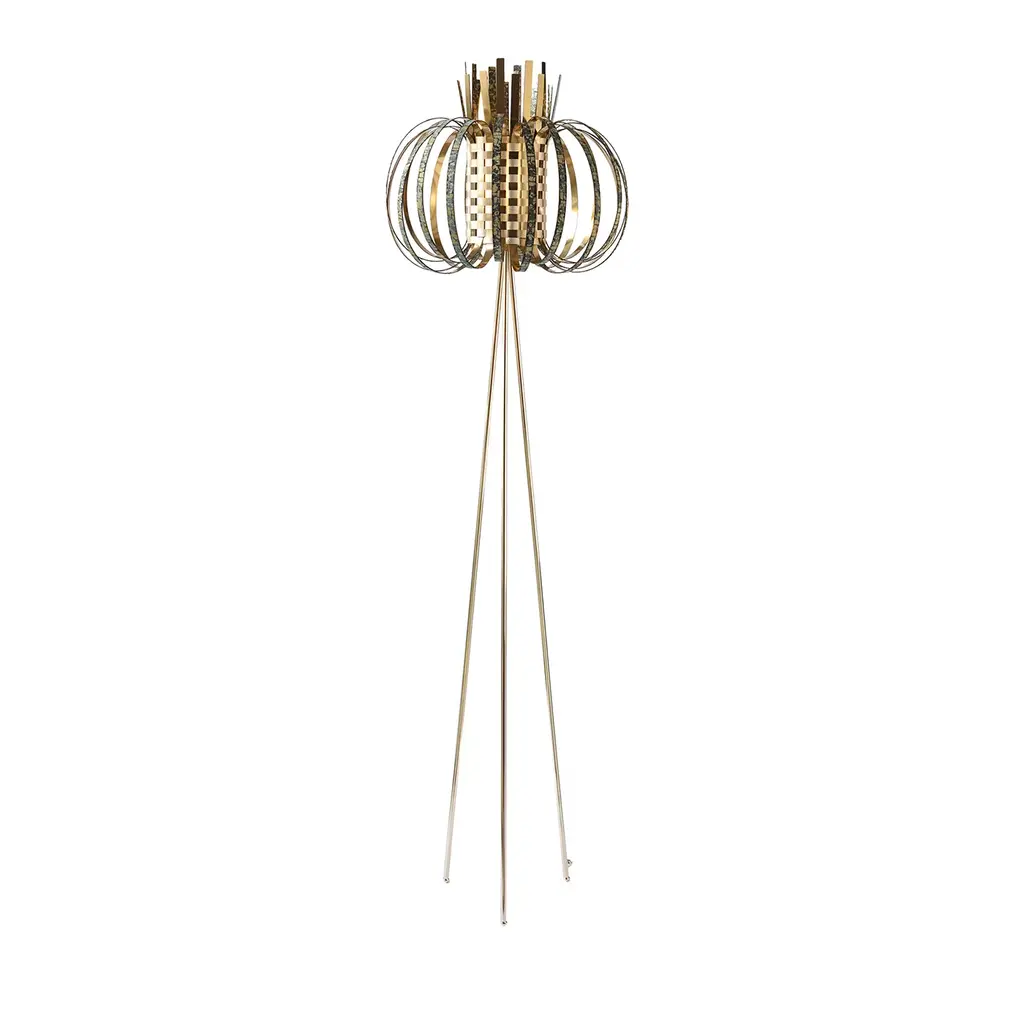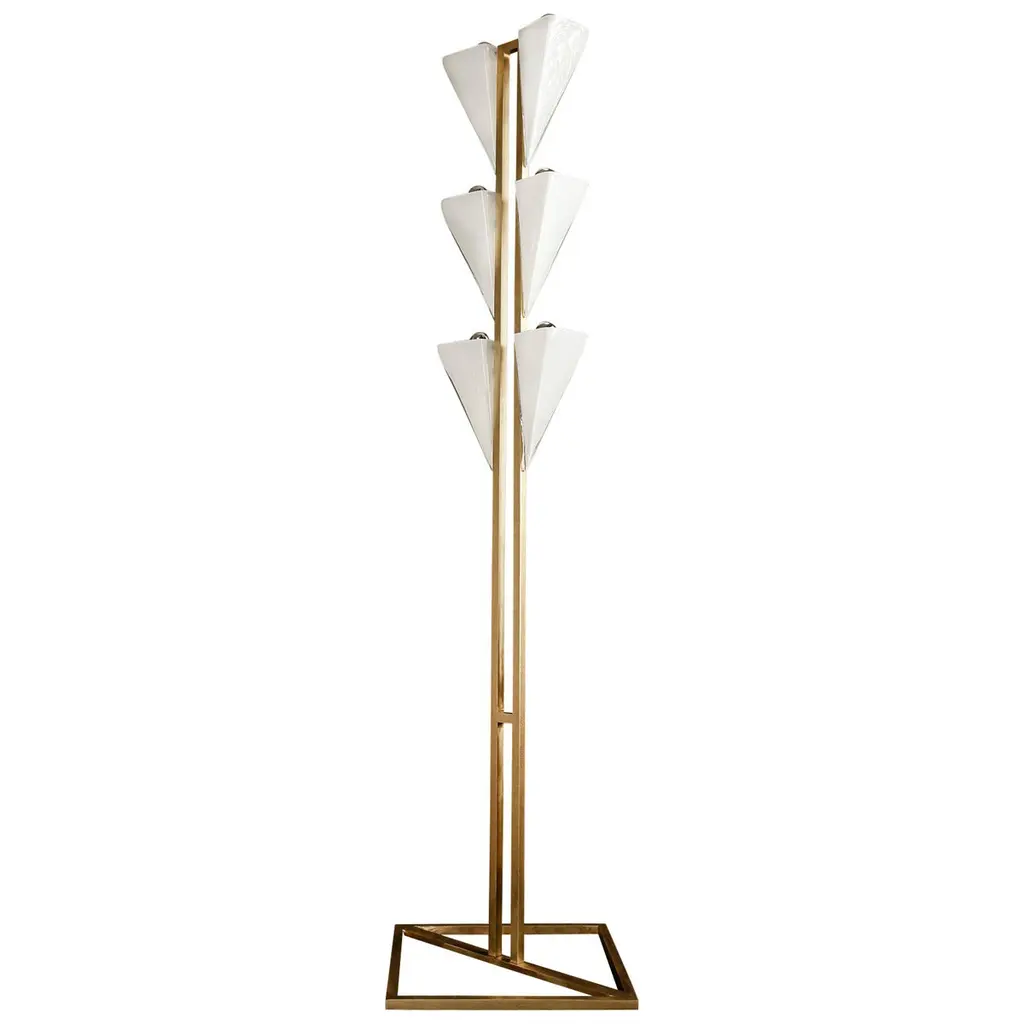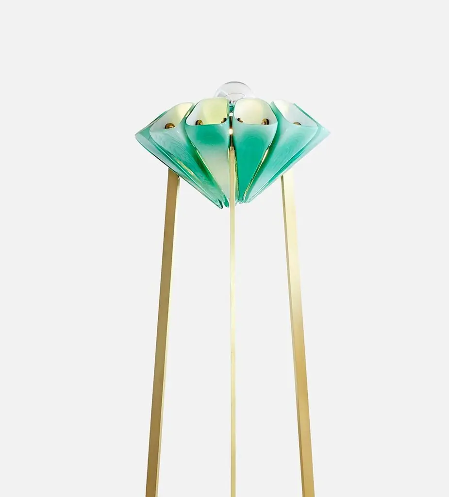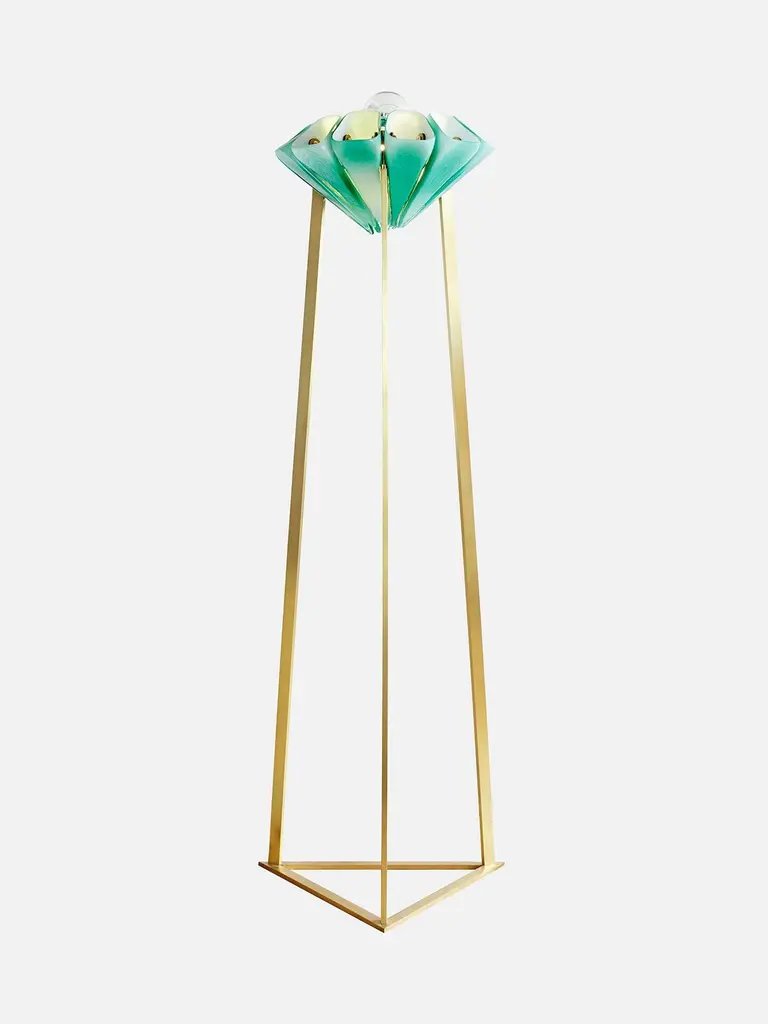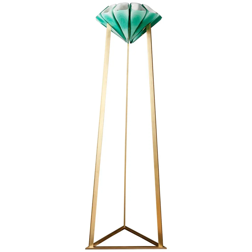 Yassin Floor Lamp in Emerald Glossy Glass & Brass by Bianco Light + SpaceDimensions: D 61 x W 61 x H 183 cm.Materials: Glass and brass.Available in different finish options. Prices may vary. All our lamps can be wired according to each country. If sold to the USA it will be wired for the USA for instance. Please contact us.Bianco Light & Space is a Los Angeles-based multi-faceted design and sculpture studio founded in 2013 by husband and wife team, Anthony Bianco and Alicia Reina. The studio specializes in creating sculptural, functional objects that fuse the concepts of light and space, drawing inspiration from nature, geometry, and ancient design principles. The duo’s minimalist aesthetic, combined with rigorous technical craftsmanship, has earned their designs a strong following in the world of high-end design and architecture.The studio’s work is characterized by its sophisticated and dynamic use of materials, primarily glass and textiles, and a commitment to traditional techniques like Venetian glassblowing, lapidary carving, pattern tessellation, color theory, and surface design. Their designs often blur the lines between art and function, resulting in objects that are both visually striking and practically usable. Many of their works, including standout pieces like the Polaris Chandelier and Selene Sconce, combine geometric simplicity with a subtle, otherworldly quality, giving them an almost architectural, space-age feel.Anthony Bianco, who graduated with a B.F.A. in glass from California College of Arts and Crafts, brings a wealth of experience and expertise in both sculpture and furniture design. His journey into glass started over two decades ago, after initial work with clay. He has worked with top industry names like Jeff Zimmerman and Silvano Signoretto, making him a highly respected figure in the field of glass art.Alicia Reina, with a B.F.A. in Apparel Design from the Rhode Island School of Design and a Master's in Footwear Design from Polimoda in Florence, Italy, brings a strong design sensibility from her background in fashion, product design and development, merchandising, and art direction and curation. She has worked for renowned designers and artists, which enriches her approach to the studio’s projects, allowing them to cross boundaries of traditional design.Their work has been featured in major publications such as Vogue Living AU, Elle Decor, Architectural Digest, W Magazine, and Sight Unseen, solidifying their place in the contemporary design world. Bianco Light & Space products stand out not only for their striking aesthetic but also for their technical mastery, making them highly coveted by collectors, designers, and architects alike.