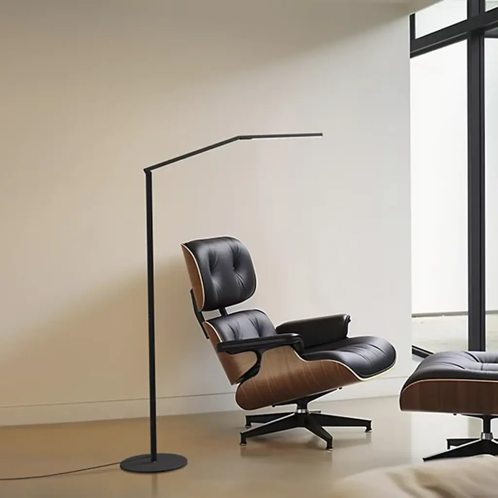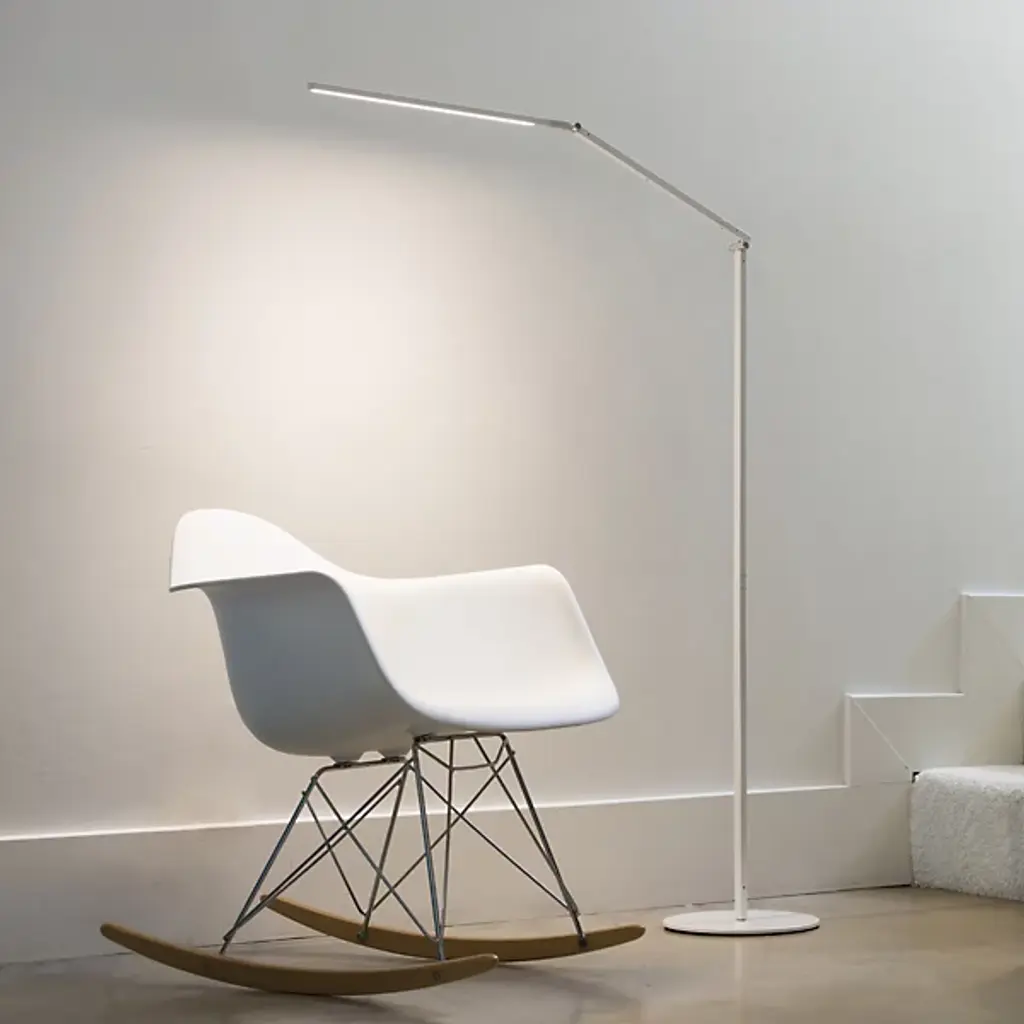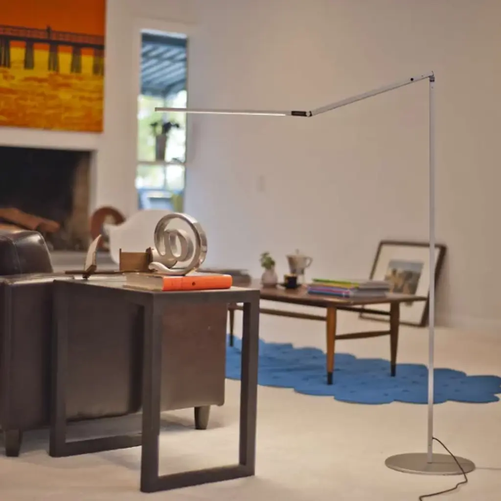 The Z-Bar Gen 4 LED Floor Lamp from Koncept represents the Ng brothers' design approach to flexible task lighting adapted for freestanding applications. Kenneth, Edmund, and Peter Ng developed this piece with proportions ideal for reading near chairs or counters. Winner of I.D. This award-winning design features flexible head positioning and touchstrip dimmer controls. Constructed from aluminum and plastic materials, the lamp maintains adjustable arm and head functionality for precise light direction.