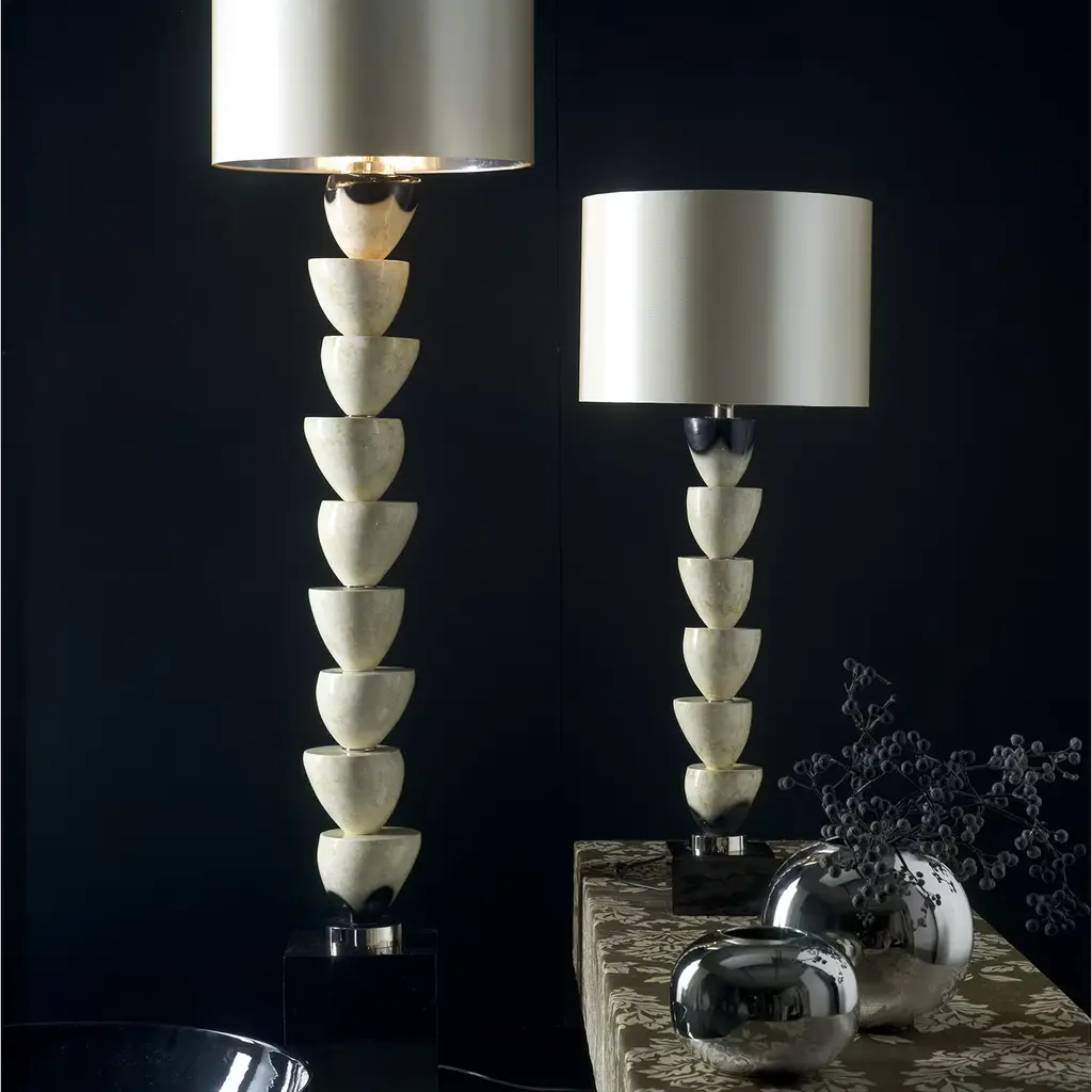 This striking floor lamp features a hand turned and glazed majolica frame with a delicate ivory white shell necklace-like pattern. The stem is supported by a glossy black lacquered wooden base with chrome-plated brass details. All is complete by an ivory satin lampshade with gold interior. Contract and commercial certifications available upon request.