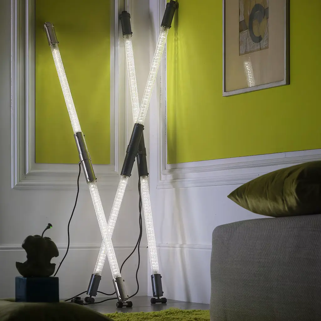 Illuminate your space with this simple, minimalistic yet sophisticated and precious tubular floor light. The brass structure is embellished by a fashionable brushed silver and hand faceted crystal finish. Simple and versatile, this piece can be placed anywhere in the room.