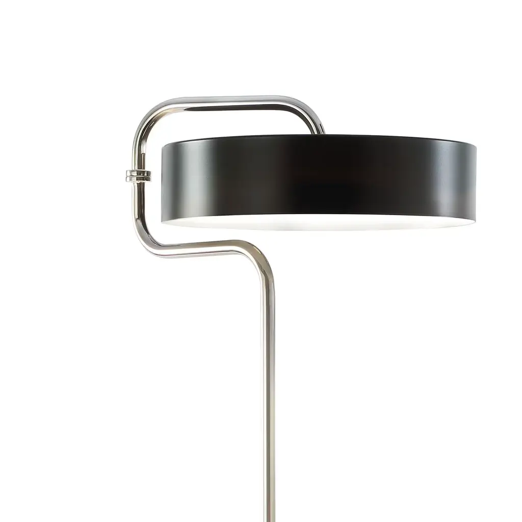 Elegant and modern, this floor lamp features geometric shapes and a sophisticated silhouette consisting of a round base supporting an elongated shaft that curves at the top to make room for the shade, in the shape of a large cylinder. The entire piece was made in metal with a nickel finish, while the shade is painted in a darker shade. Clean lines and understated colors make this lamp a contemporary addition to any room.