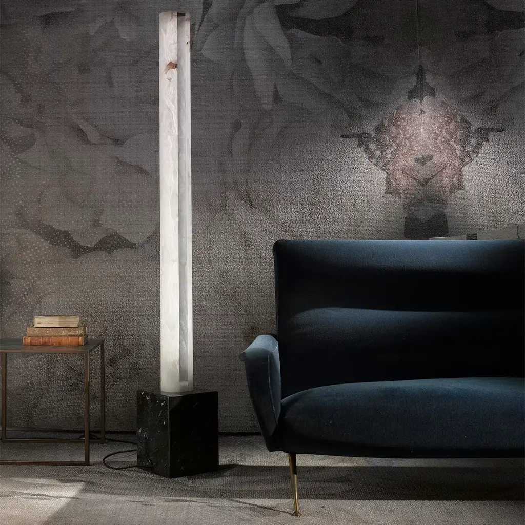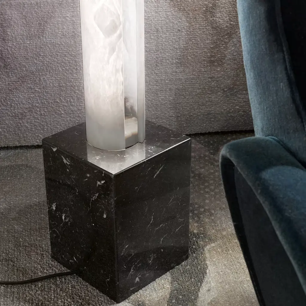 Handcrafted of white alabaster, also known as "the stone of the gods", the cylindrical shade distinguishing this floor lamp will infuse a contemporary or minimalist interior with a powerful light emitted from an LED bulb (3000K - 18W - 24V). Named after Greek God Zeus, this exquisite design is completed with a solid block of black Marquina marble functioning as a base and a black silk wire.