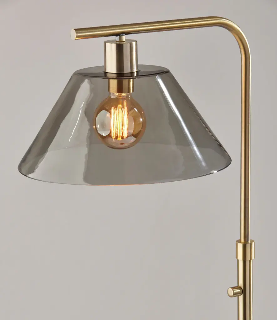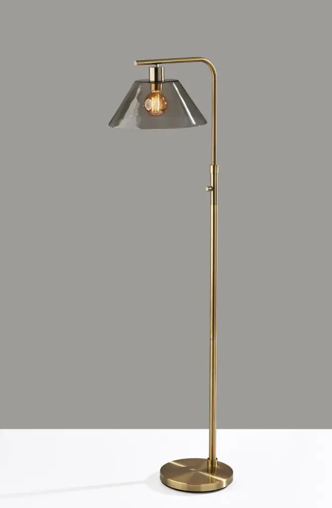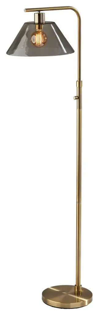 Brighten your space in stunning vintage style with the Zoe floor lamp. An antique brass finish dominates this piece, from the 10" diameter round base to the slender curving stem and arm. Suspended from the arm is an inverted cone-shaped smoked glass shade that leaves the 60W bulb visible. For a distinctive vintage look, an Edison bulb (not included) is recommended. The lamp is easily operated by a rotary switch discreetly located on the stem. Complete your décor with the Zoe desk lamp, wall lamp, pendant light, and 3-light chandelier.At 57.5" tall and 16.5" deep, this lamp is a great addition to room corners or beside furniture.The lamp combines modern and vintage styling that suits any décor.The smoked glass shade adds muted lighting to your space.60W Edison bulb (not included) is recommended for a vintage look.The Zoe style is also available as a desk lamp, wall lamp, pendant lamp, and 3-light chandelier.60W Vintage Bulb Recommended (Not Included)