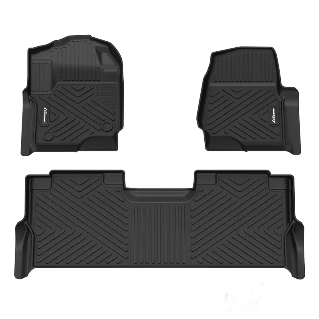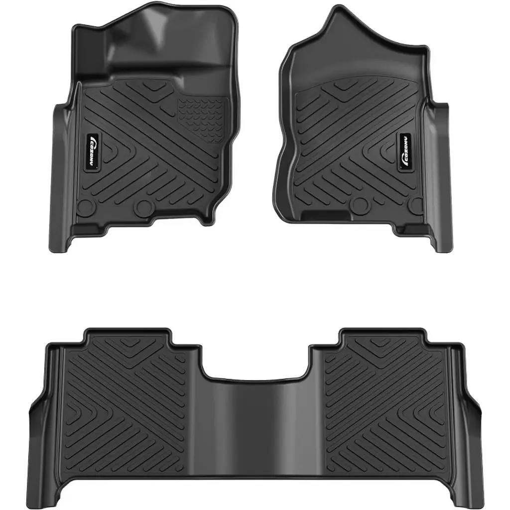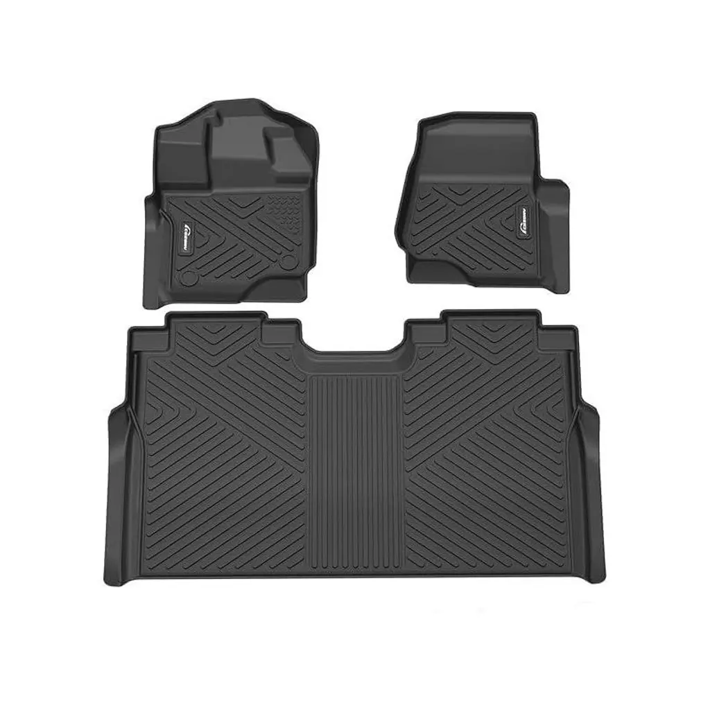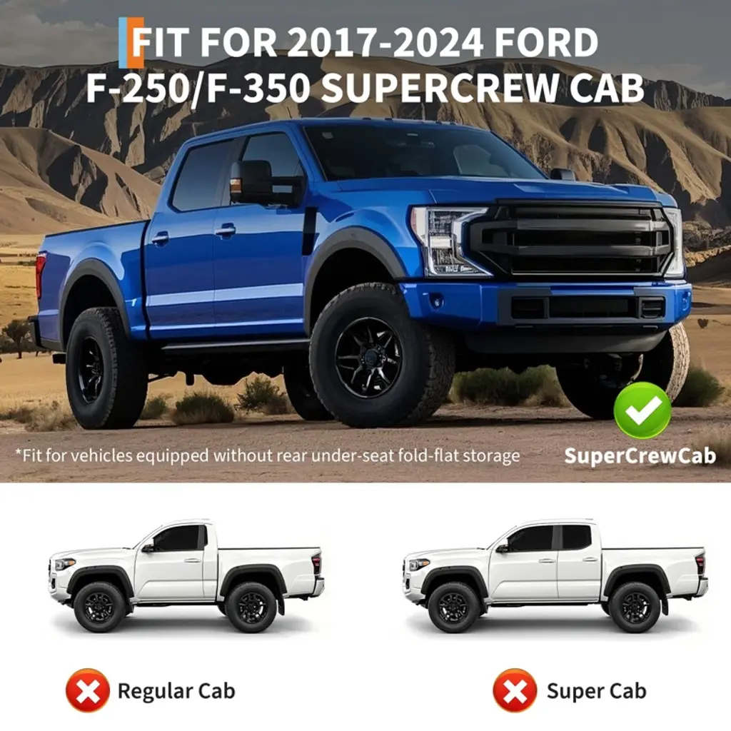 All-Weather Floor Mats TruAIR Custom Fit for 2017-2024 Ford F-250 F-350 Super Duty Crew Cab, Full Set 4 Pieces Black TPE Liners with Anti-Slip DesignKey Features:Precise Vehicle Fit: Expertly designed for 2017-2024 Ford F-250/F-350 Super Duty Crew Cab models with front bucket seats and a rear bench (4 doors). Not compatible with vinyl factory flooring.Durable TPE Material: Constructed from flexible, eco-friendly Thermoplastic Elastomer (TPE) that is free from latex, PVC, and harsh chemicals, performing reliably in extreme temperatures.Superior All-Weather Protection: Features deep grooves and high edges to effectively trap water, mud, snow, and debris, keeping your factory carpets completely clean and protected.Secure Anti-Slip Design: Equipped with a textured surface and built-in retention clips to prevent the mats from shifting or moving during driving, ensuring safety.Easy to Clean & Maintain: The non-porous surface allows for effortless cleaning; simply shake off debris or rinse with water. Resists stains and requires no vacuuming or chemical cleaners.