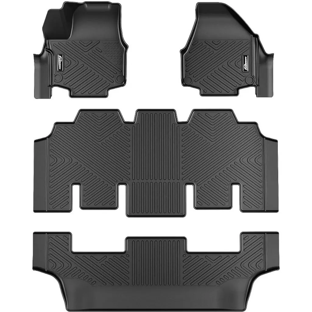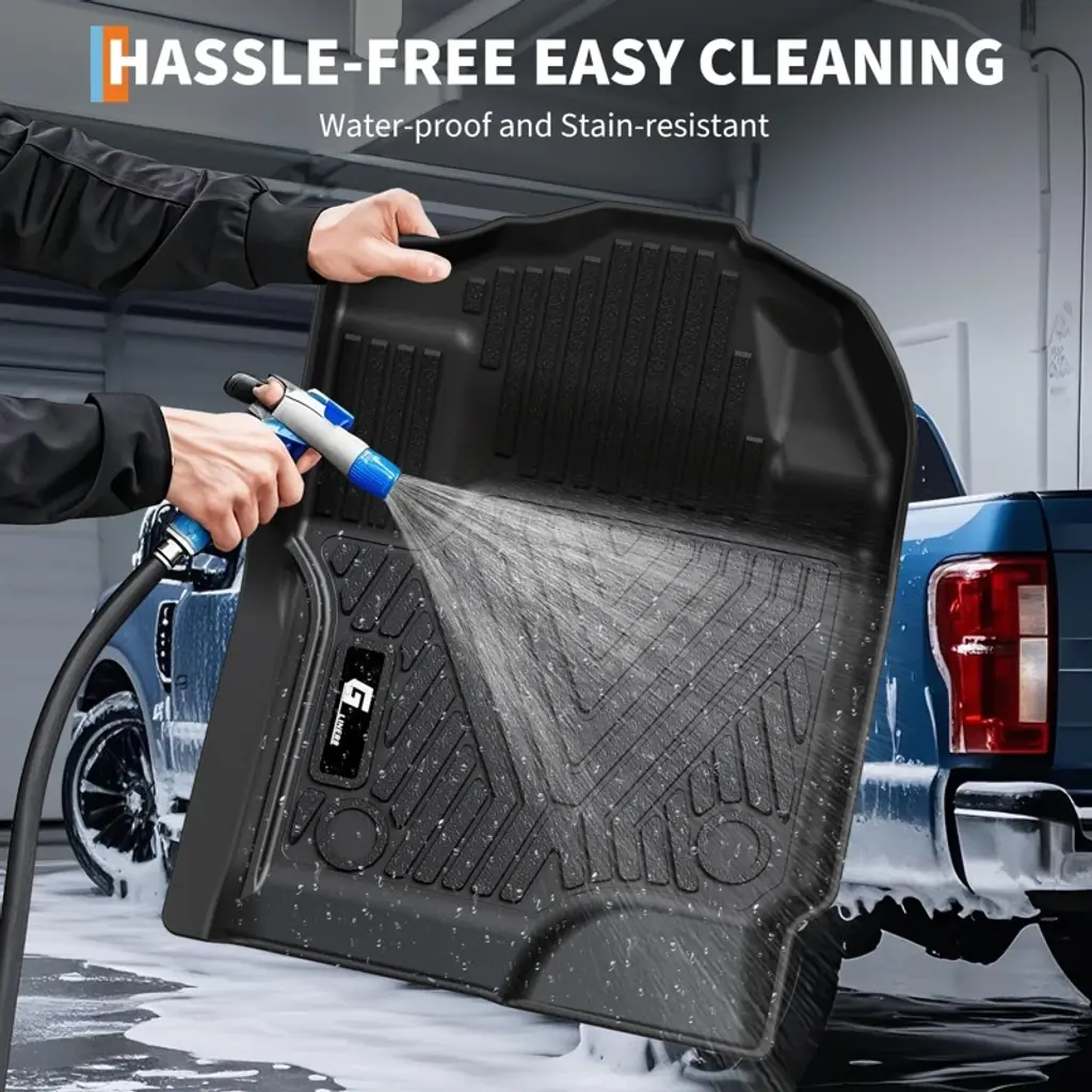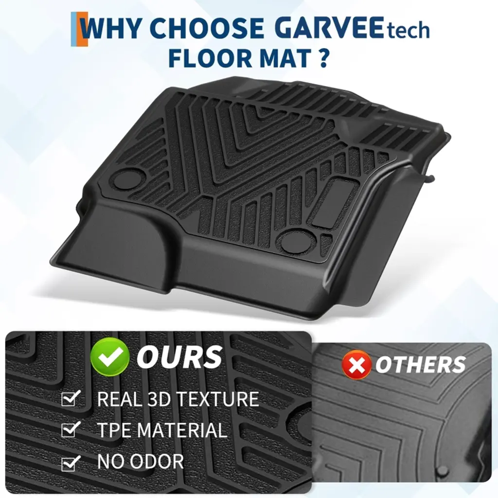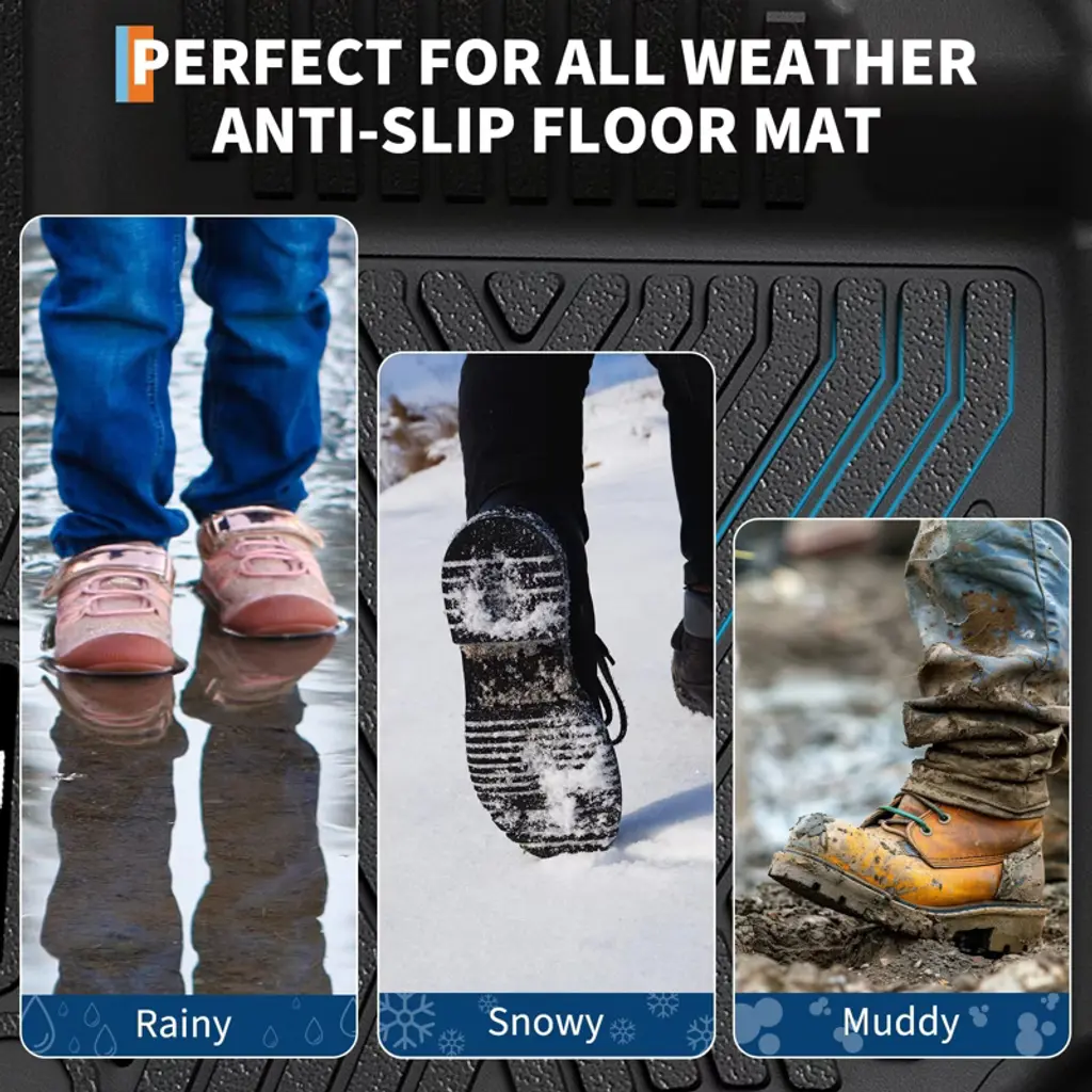 All-Weather Floor Mats TruAIR Custom Fit for 2017-2024 Ford F-250 F-350 Super Duty Crew Cab, Full Set 4 Pieces Black TPE Liners with Anti-Slip DesignKey Features:Precise Vehicle Fit: Expertly designed for 2017-2024 Ford F-250/F-350 Super Duty Crew Cab models with front bucket seats and a rear bench (4 doors). Not compatible with vinyl factory flooring.Durable TPE Material: Constructed from flexible, eco-friendly Thermoplastic Elastomer (TPE) that is free from latex, PVC, and harsh chemicals, performing reliably in extreme temperatures.Superior All-Weather Protection: Features deep grooves and high edges to effectively trap water, mud, snow, and debris, keeping your factory carpets completely clean and protected.Secure Anti-Slip Design: Equipped with a textured surface and built-in retention clips to prevent the mats from shifting or moving during driving, ensuring safety.Easy to Clean & Maintain: The non-porous surface allows for effortless cleaning; simply shake off debris or rinse with water. Resists stains and requires no vacuuming or chemical cleaners.