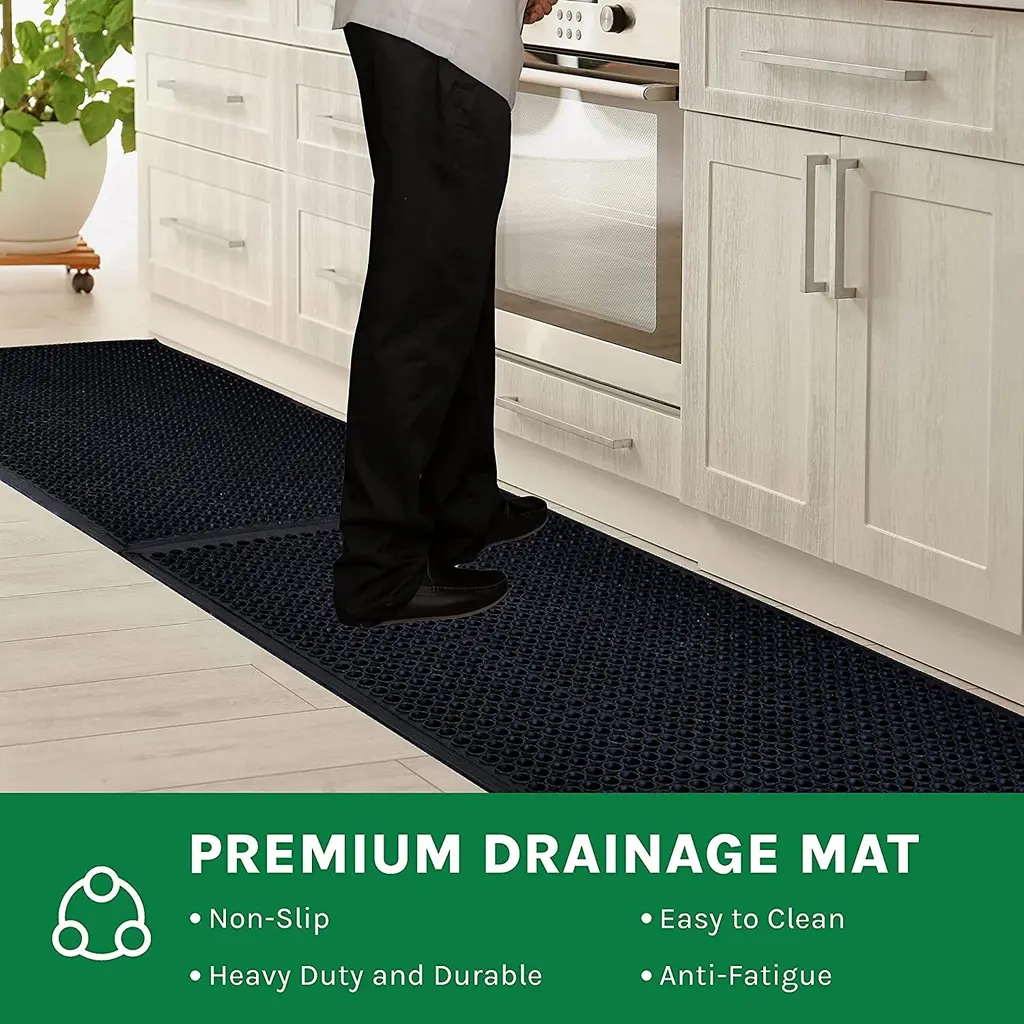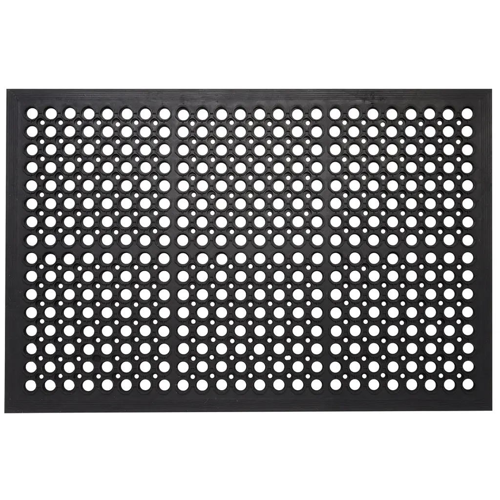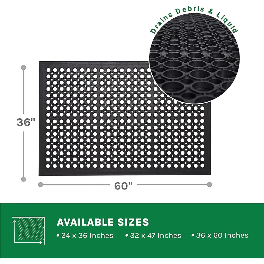 The 24 x 36 inch rubber mat for floors is a multipurpose anti fatigue mat that adds cushion and support without compromising its durable and heavy-duty quality. The rubber mats for kitchen floor is commonly used to add comfort while standing for extended periods of time and is well suited as a restaurant mat, bar floor mat, floor drain mat, rubber utility mat and garage floor mat. The non-slip mat is used in high traffic areas to provide grip and traction, drains liquids and keeps work areas clean. The drainage holes in the restaurant floor mat make it the ideal indoor outdoor mat for residential doorways, business entrances, pools, outdoor showers, restaurants, kitchens, bars, utility areas, garages and more! Drainage floor mats keep wet areas clean and dry. Place the anti-slip mat with holes on the floor to trap dirt, debris and liquid. The perforated holes of the indoor outdoor rubber mat provide quick drainage, making it commonly used as an outdoor shower mat, pool mat for ladders and patio decks and entrance doormat. Made from all-natural and recycled rubber, the non-slip mat for floors is a durable and planet friendly option for safety floor mats. Each rubber mat with holes is 24 x 36 inches, sized for use as an industrial floor mat or as a heavy-duty door mat for outdoors. Simply hose the non-slip floor mat with water to clean.Features