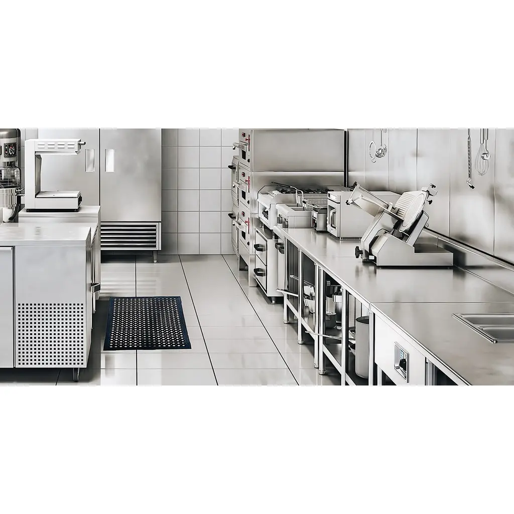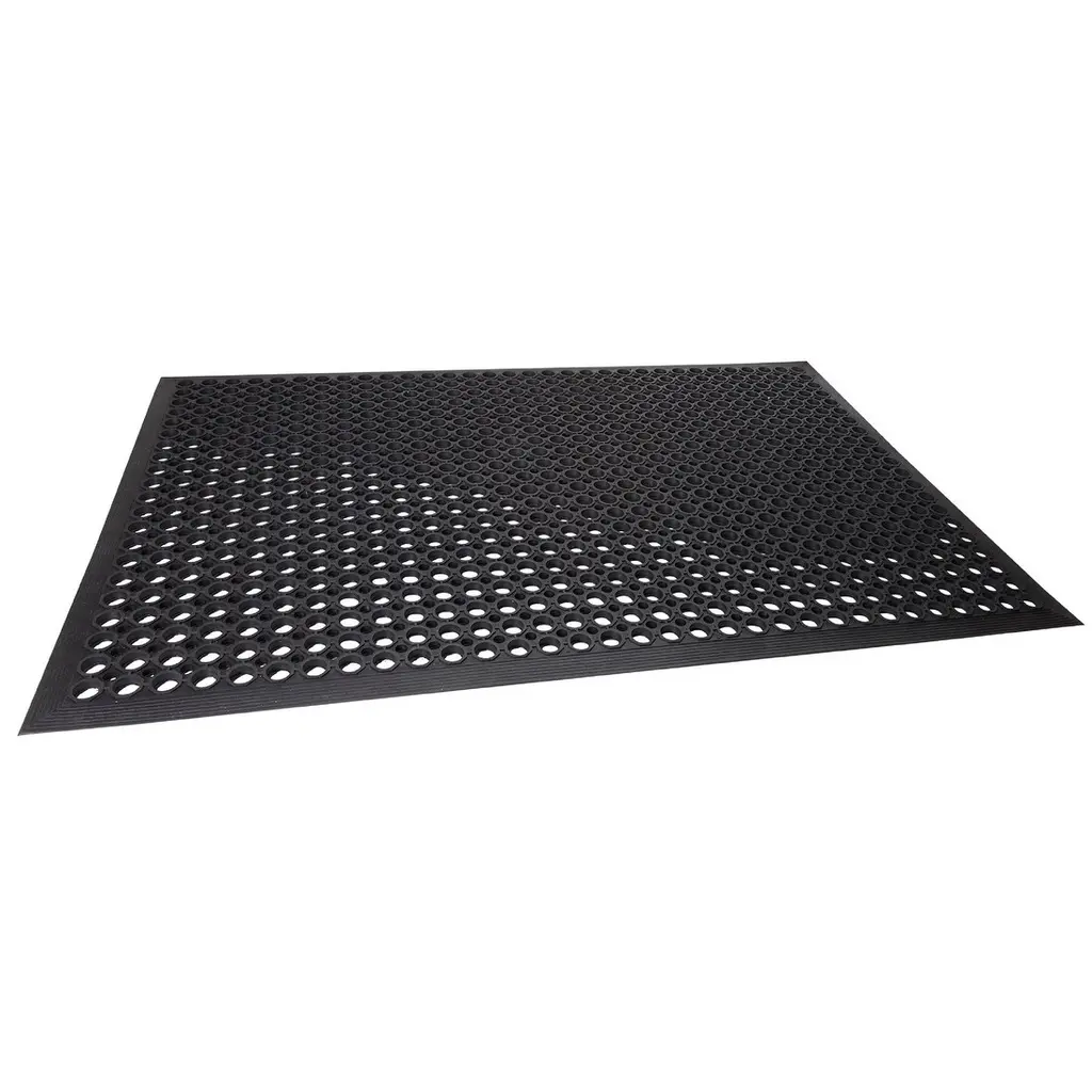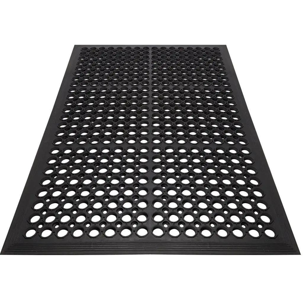 The 24 x 36 inch rubber mat for floors is a multipurpose anti fatigue mat that adds cushion and support without compromising its durable and heavy-duty quality. The rubber mats for kitchen floor is commonly used to add comfort while standing for extended periods of time and is well suited as a restaurant mat, bar floor mat, floor drain mat, rubber utility mat and garage floor mat. The non-slip mat is used in high traffic areas to provide grip and traction, drains liquids and keeps work areas clean. The drainage holes in the restaurant floor mat make it the ideal indoor outdoor mat for residential doorways, business entrances, pools, outdoor showers, restaurants, kitchens, bars, utility areas, garages and more! Drainage floor mats keep wet areas clean and dry. Place the anti-slip mat with holes on the floor to trap dirt, debris and liquid. The perforated holes of the indoor outdoor rubber mat provide quick drainage, making it commonly used as an outdoor shower mat, pool mat for ladders and patio decks and entrance doormat. Made from all-natural and recycled rubber, the non-slip mat for floors is a durable and planet friendly option for safety floor mats. Each rubber mat with holes is 24 x 36 inches, sized for use as an industrial floor mat or as a heavy-duty door mat for outdoors. Simply hose the non-slip floor mat with water to clean.Features